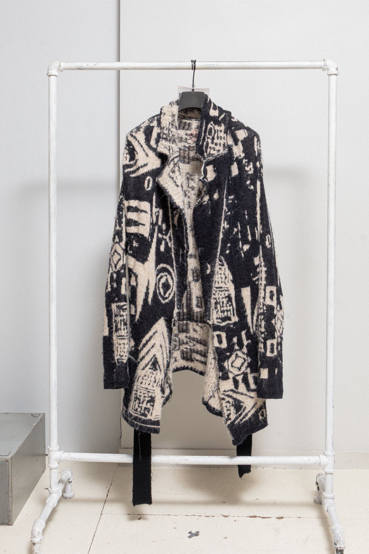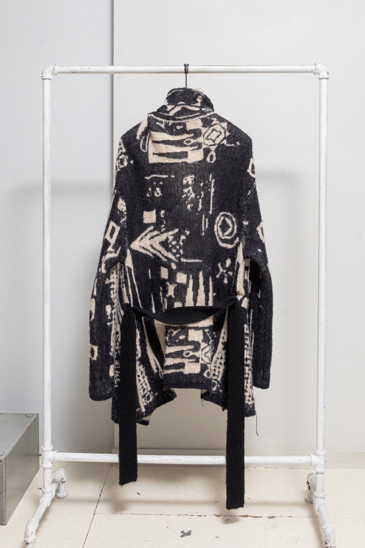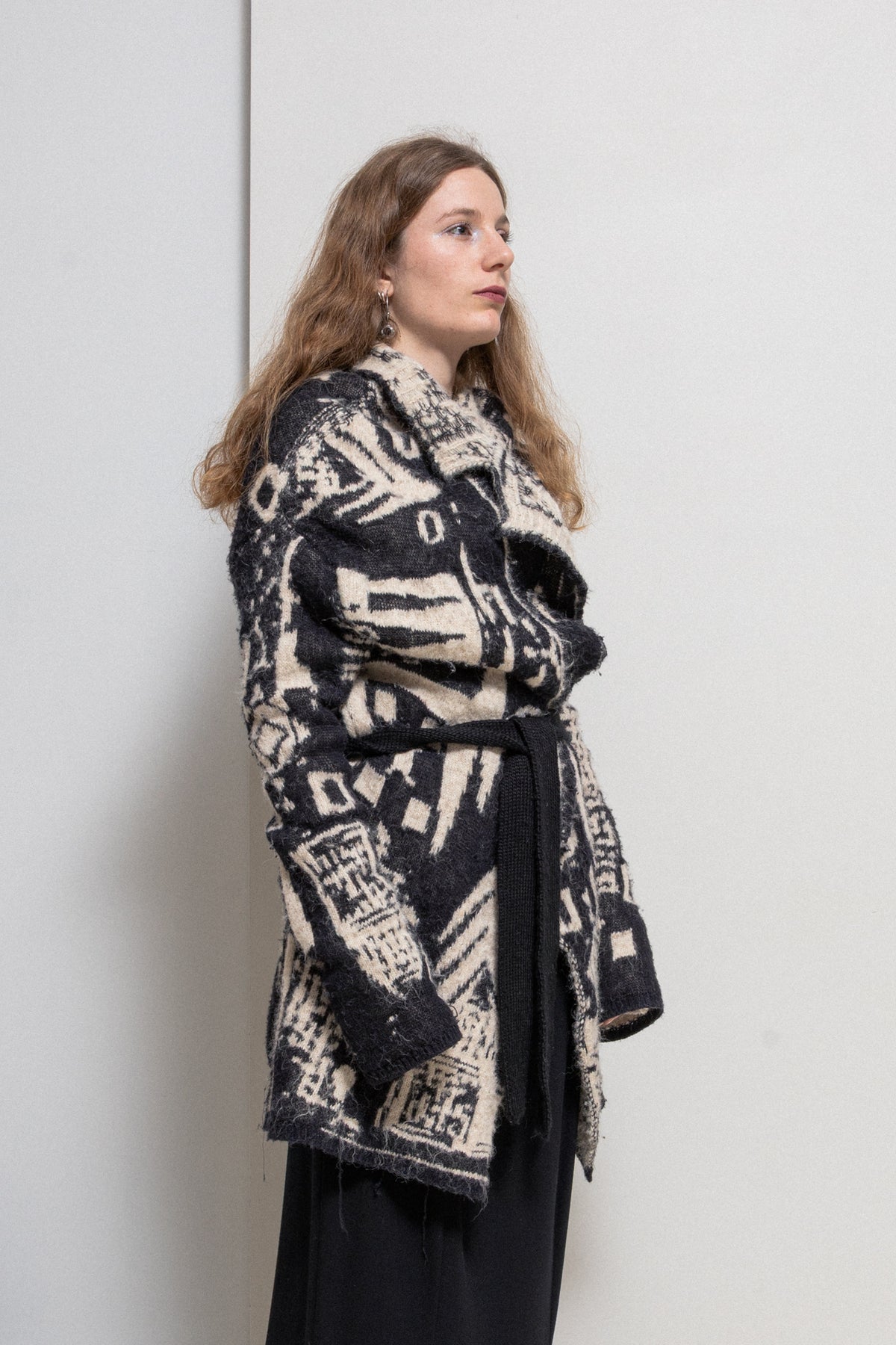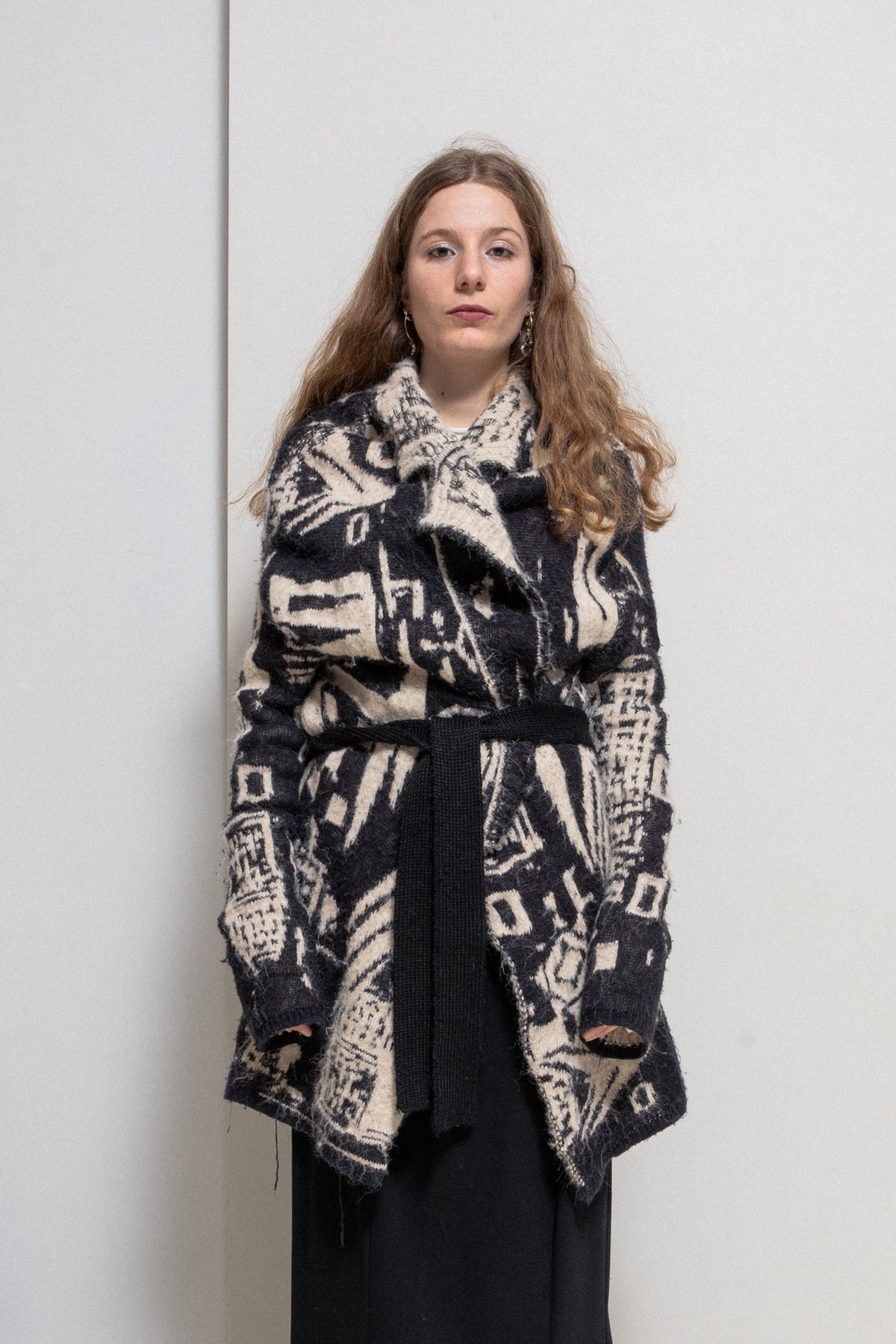 Beautiful coat made of a heavy textured knitted alpaca wool, featuring black and white ethnic pattern. Relaxed oversized open cut with a belt, notch lapels and a pocket each side. Signature red thread cross in the back.