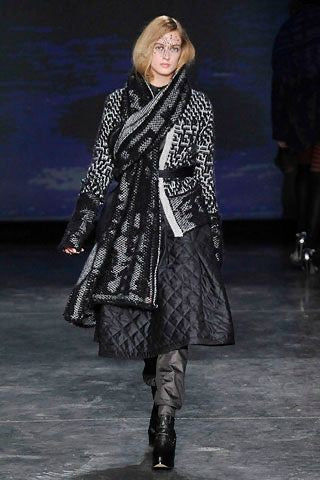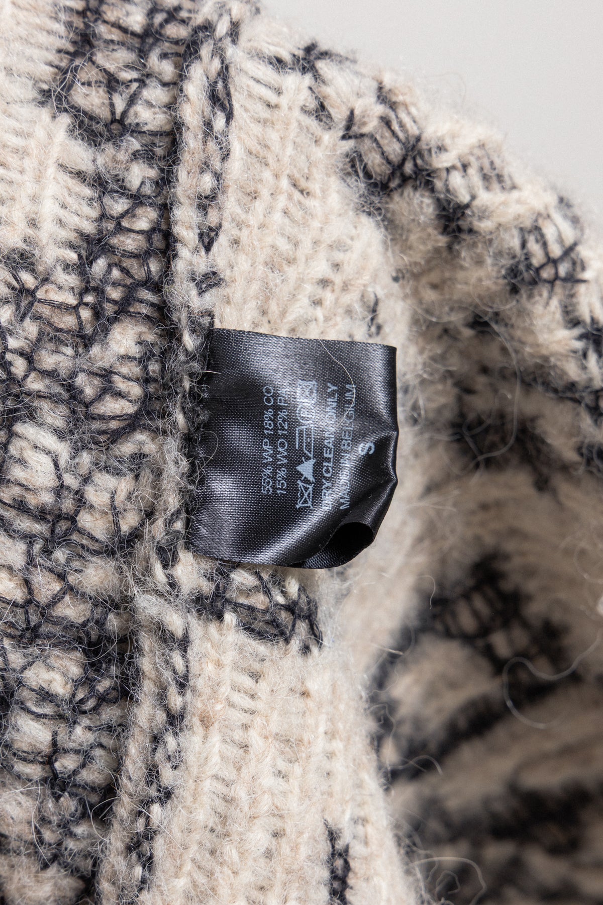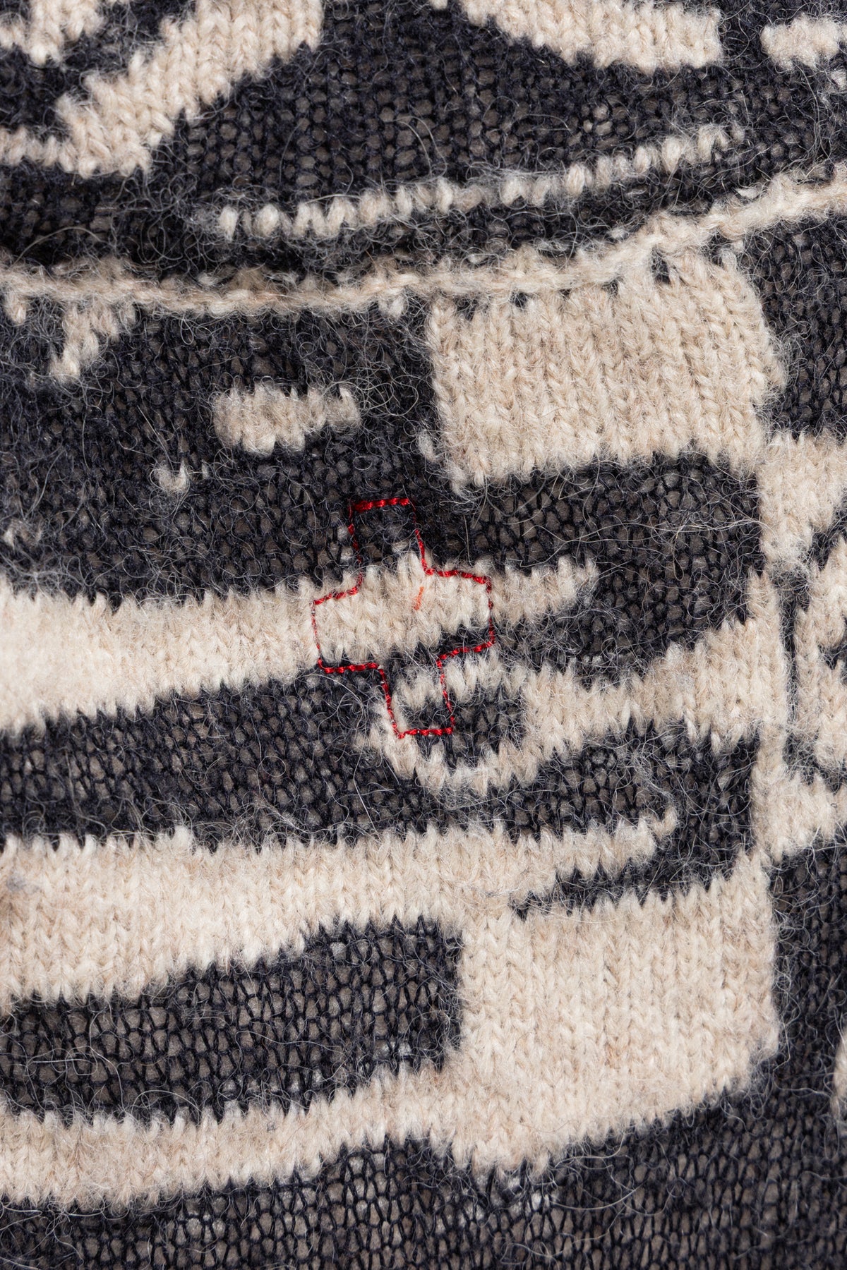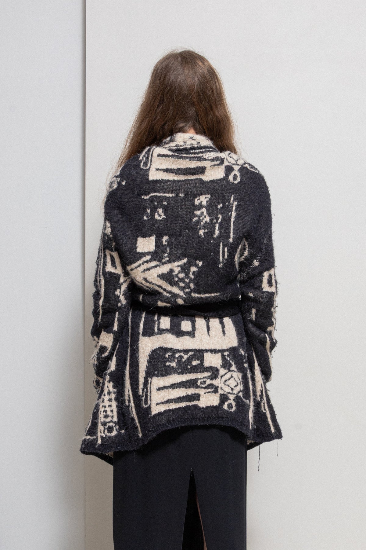 Beautiful coat made of a heavy textured knitted alpaca wool, featuring black and white ethnic pattern. Relaxed oversized open cut with a belt, notch lapels and a pocket each side. Signature red thread cross in the back.