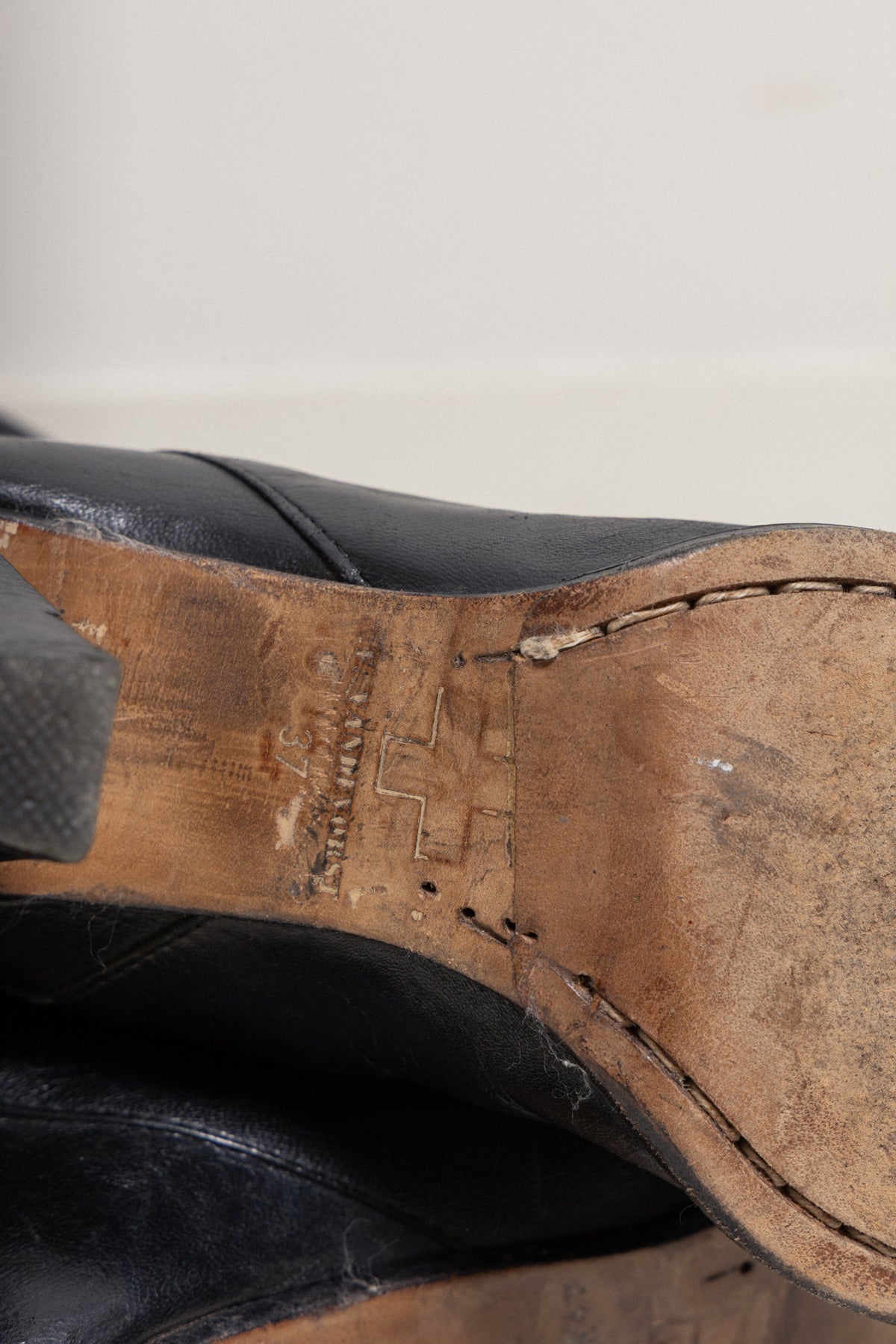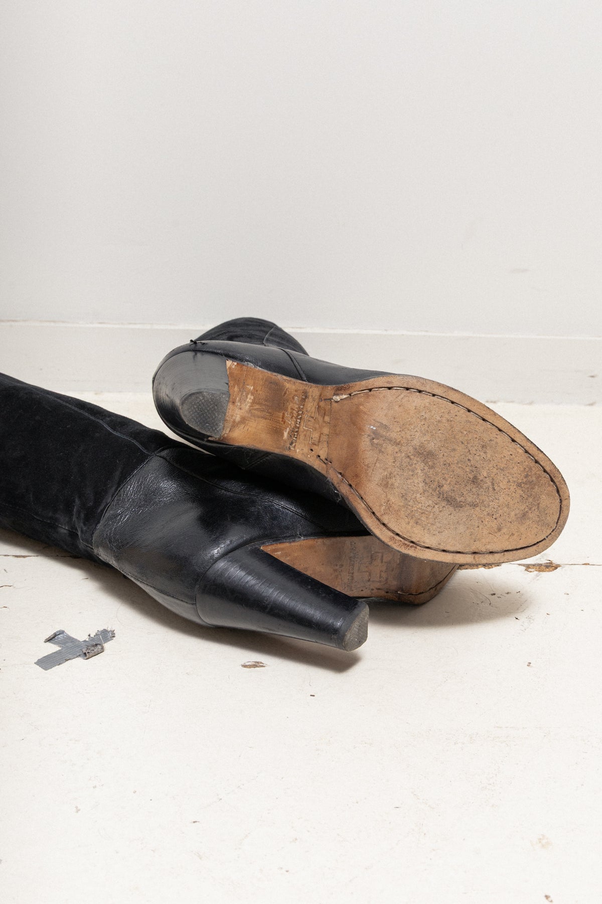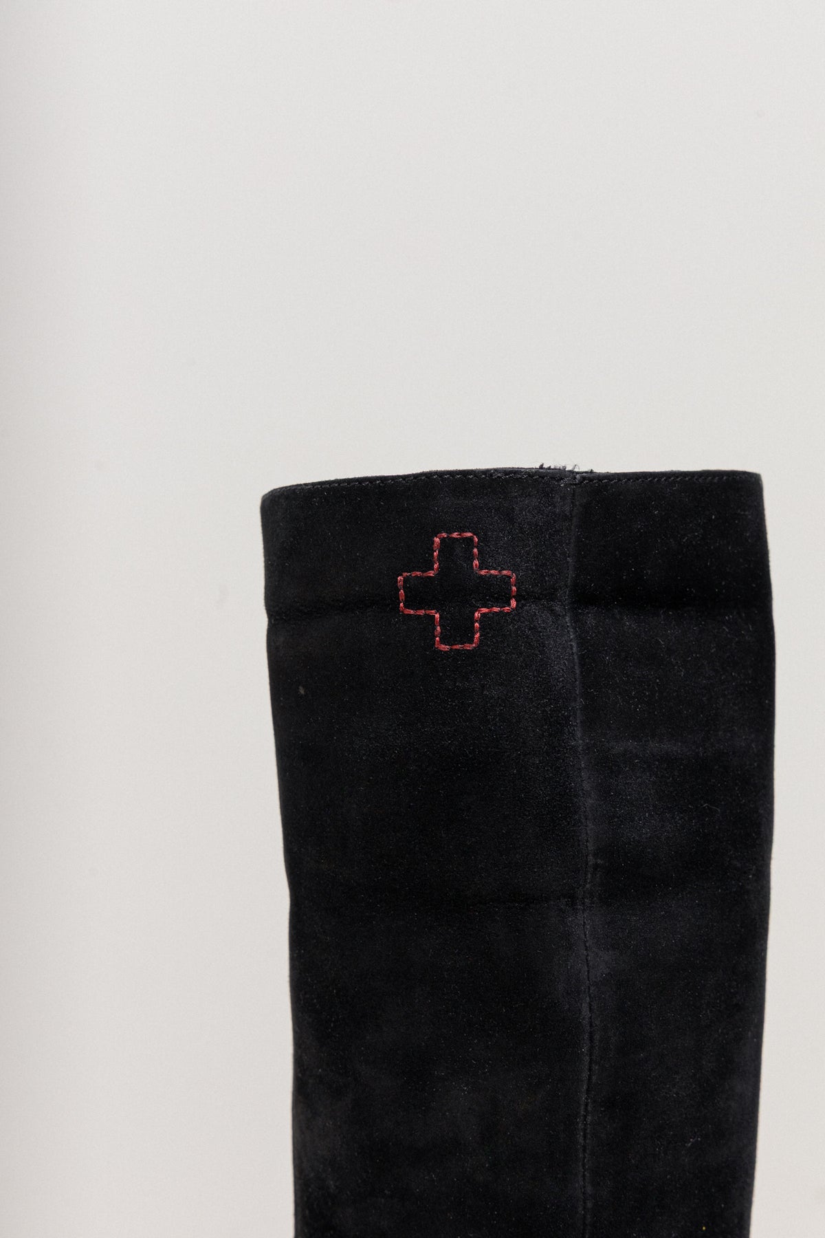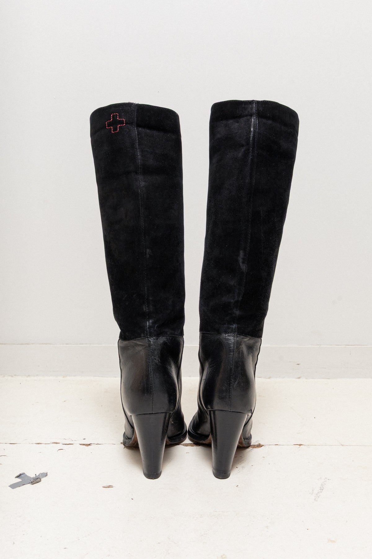 Beautiful pair of high boots made of a velvety suede leather on the upper part, and classic leather with a subtle sheen on the bottom. Conical heel, slightly pointy toe, signature red cross at the back.