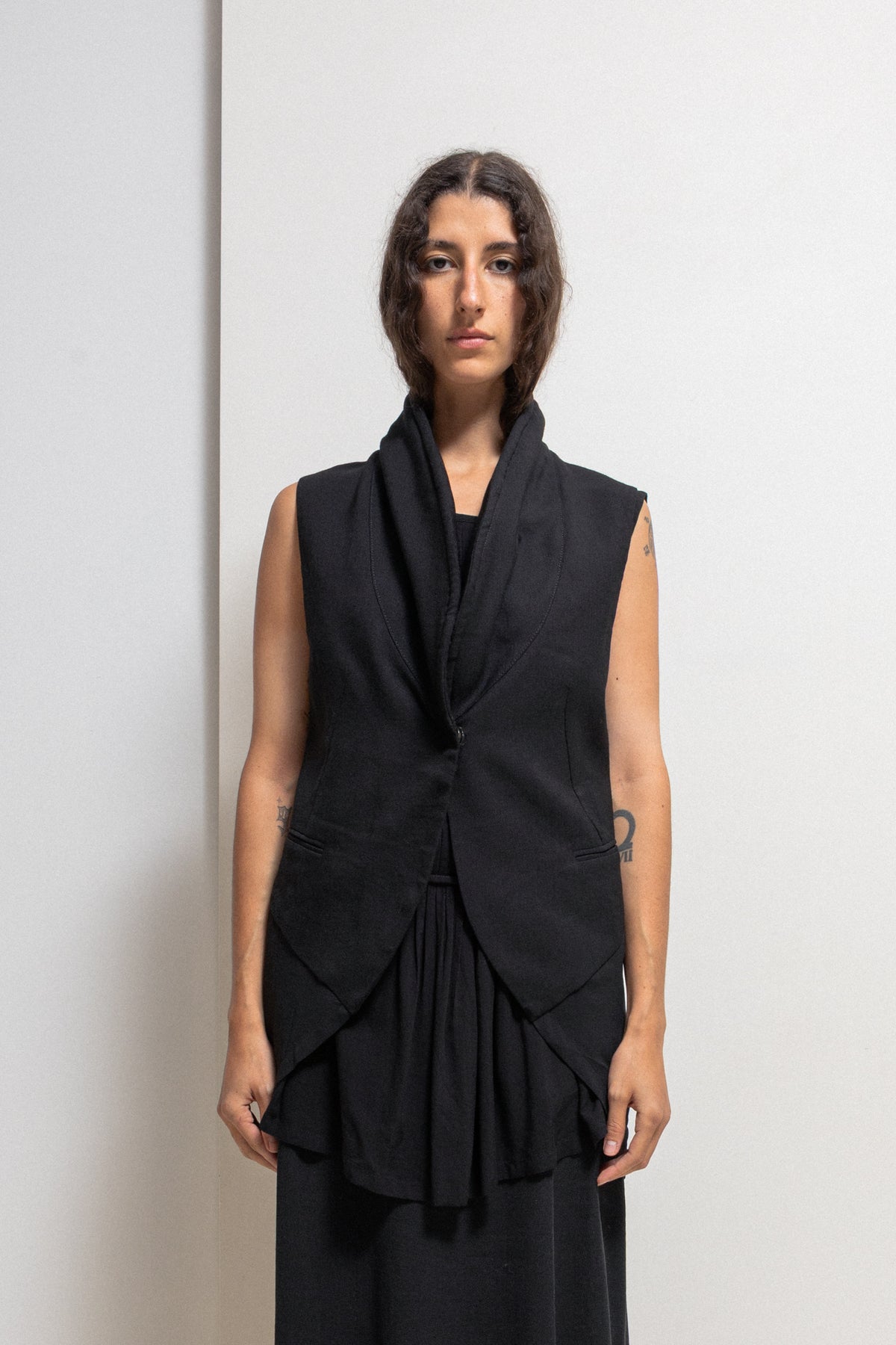 Amazing vest made of a thin and soft fleece wool, featuring a large padded collar and semi-sheer silk back. Regular cut with a hidden snap button closure, back buckled strap to make it more fitted and a back slit.