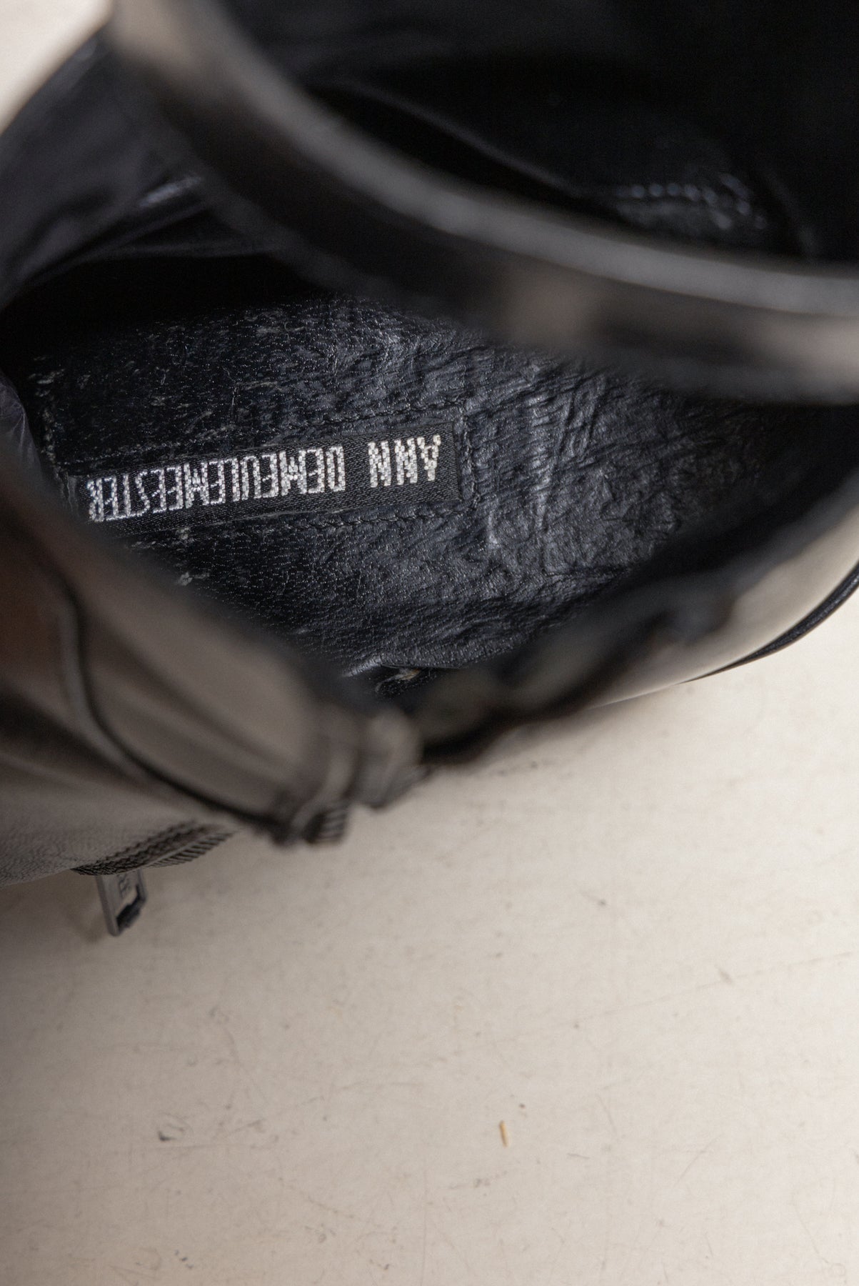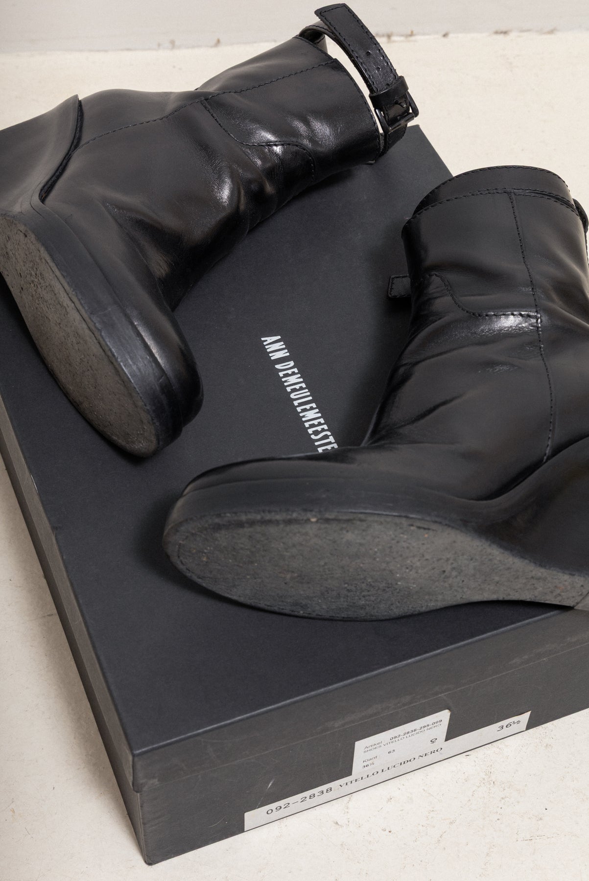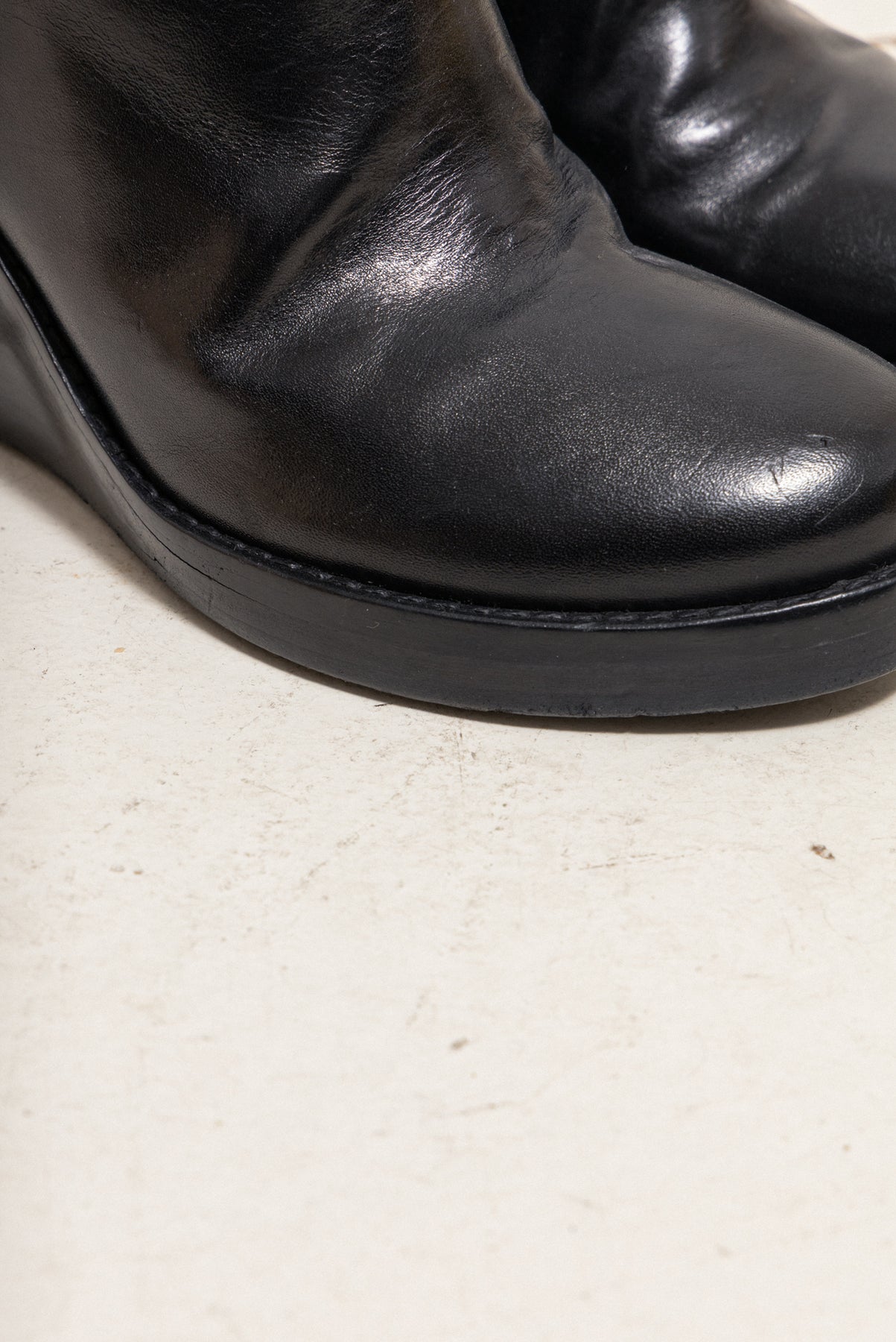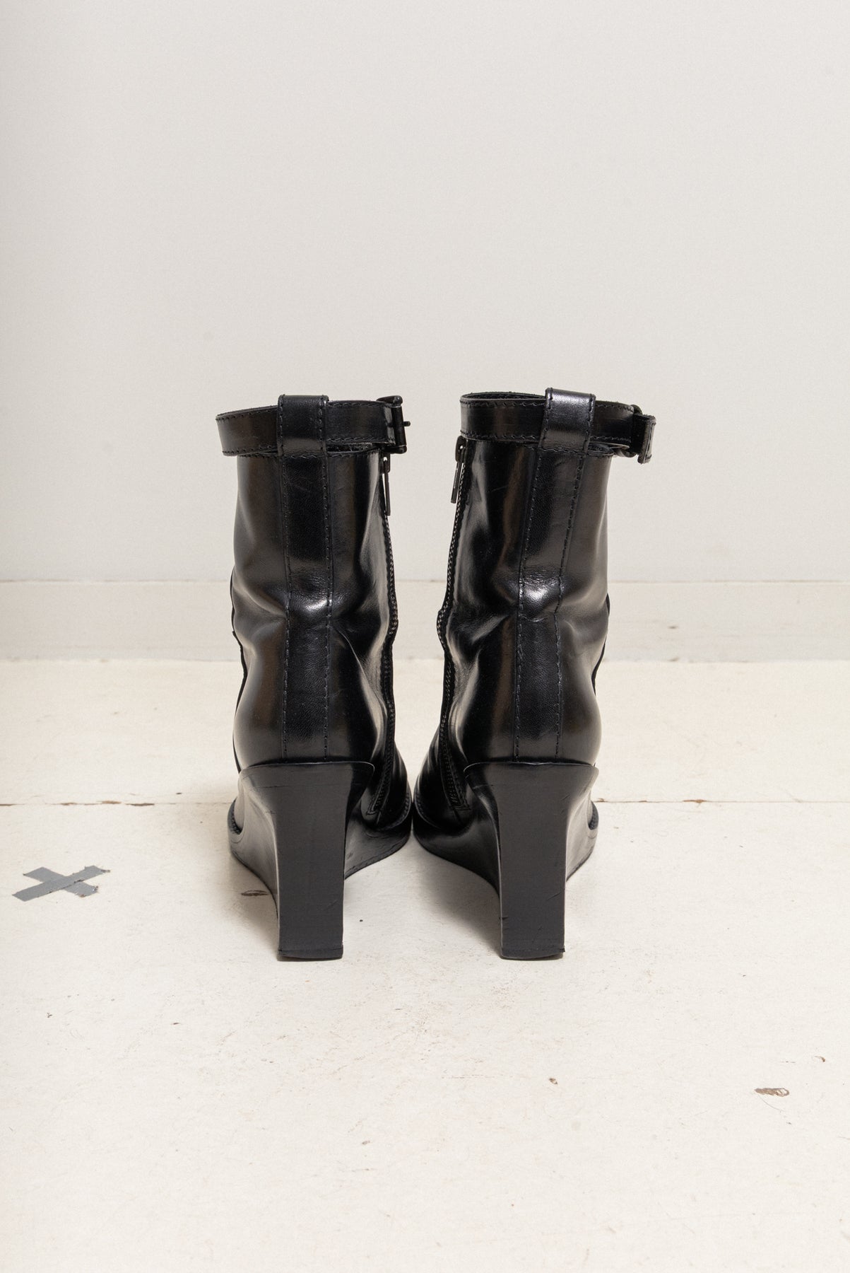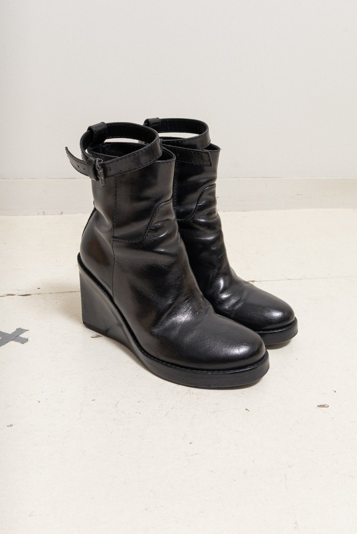 Amazing pair of boots made of a soft and buttery calf leather with a beautiful sheen, featuring extra ankle strap at the top. Wedge platforms slimming down towards the heels and rounded toes.