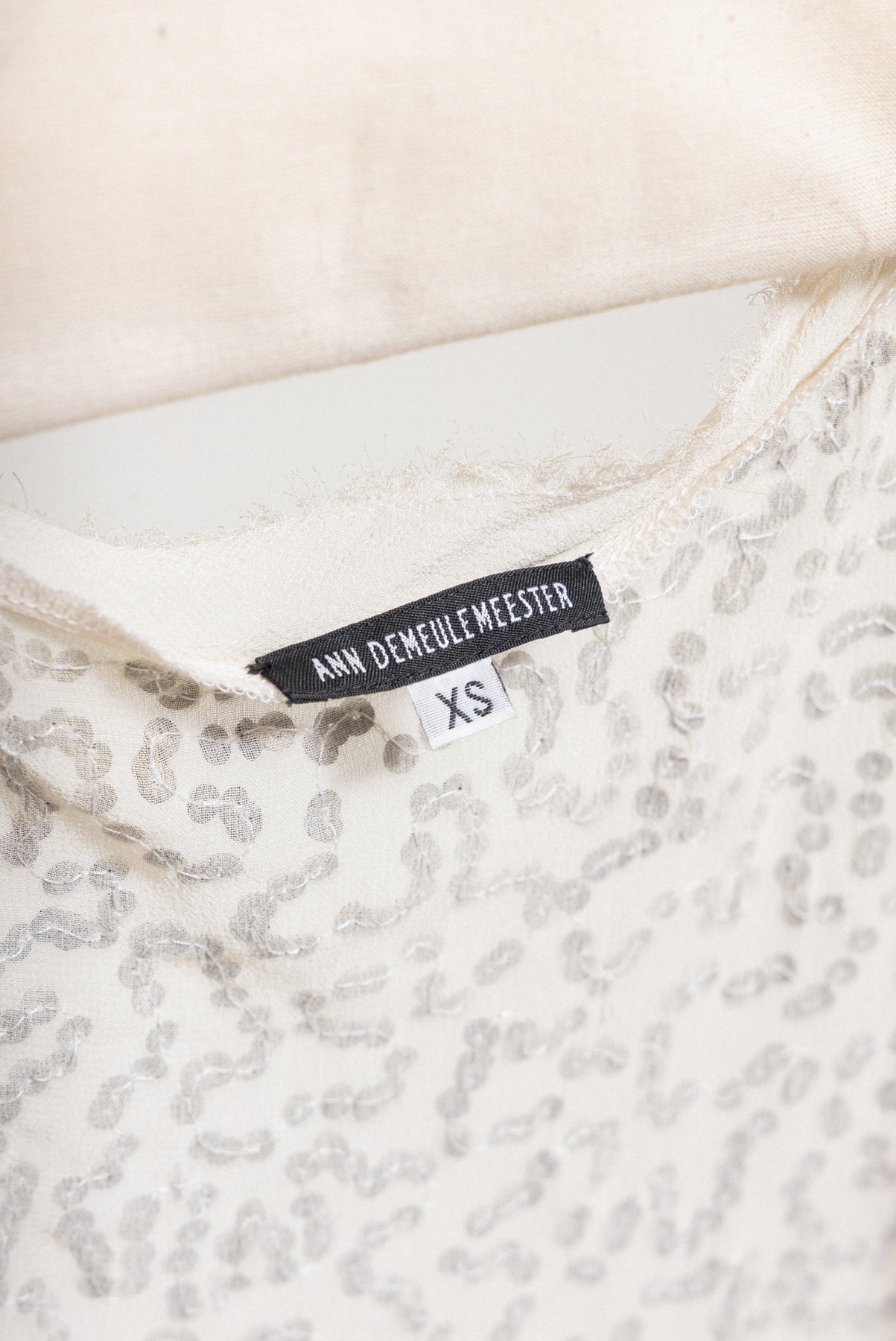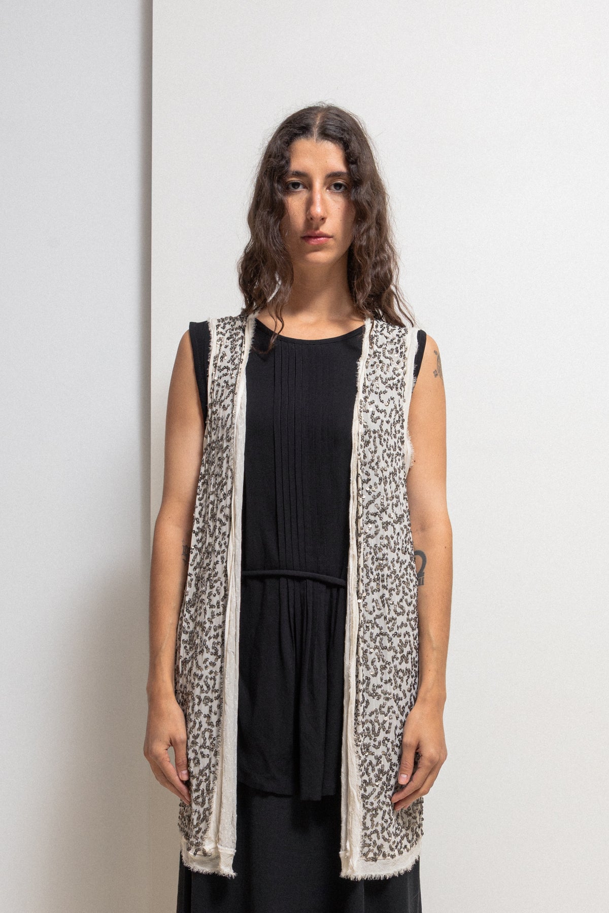 Incredible vest made of a very delicate cream silk fabric, featuring 850 gr of metal sequins abstractly embroidered throughout, creating almost an illusion paired with close to skin color base. Open cut with frayed hems.