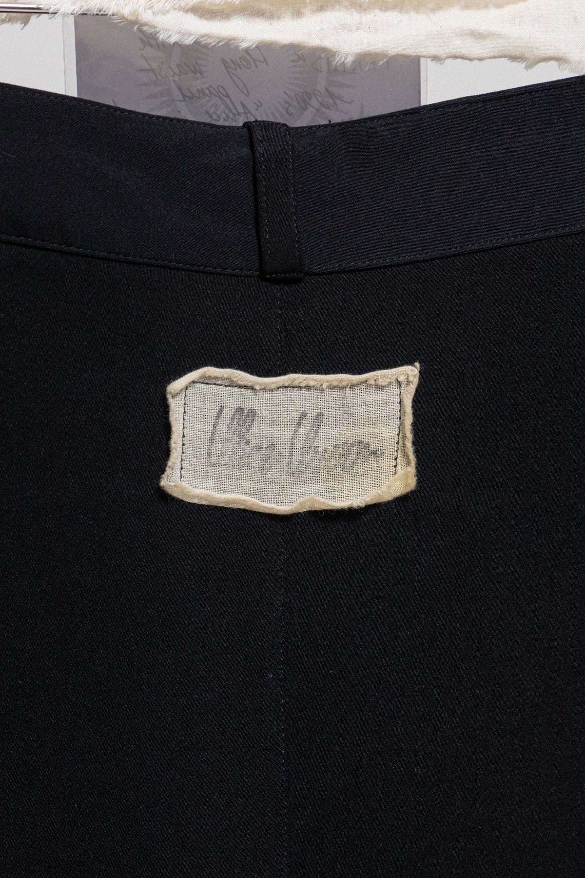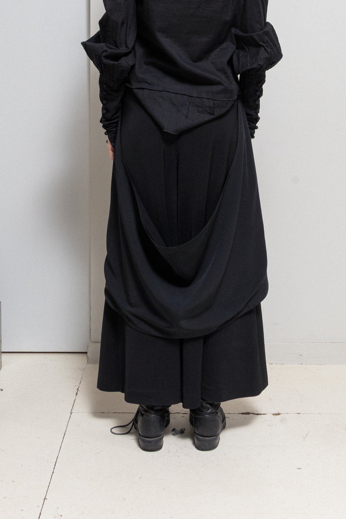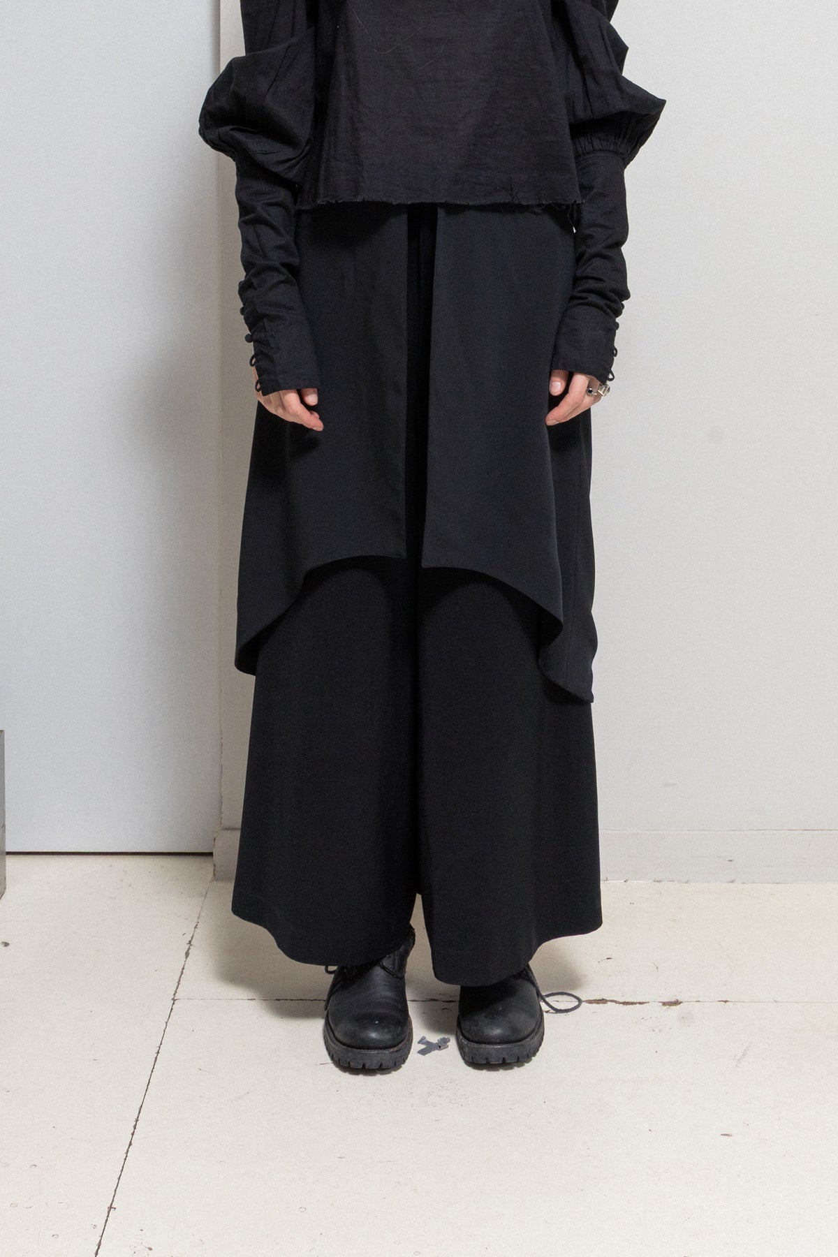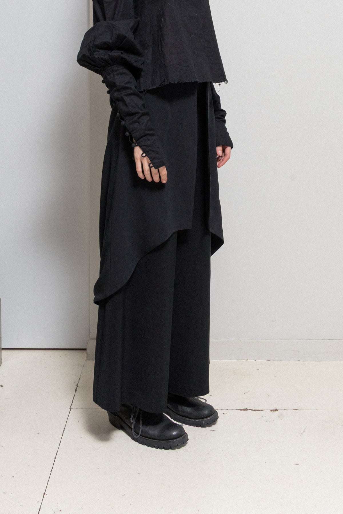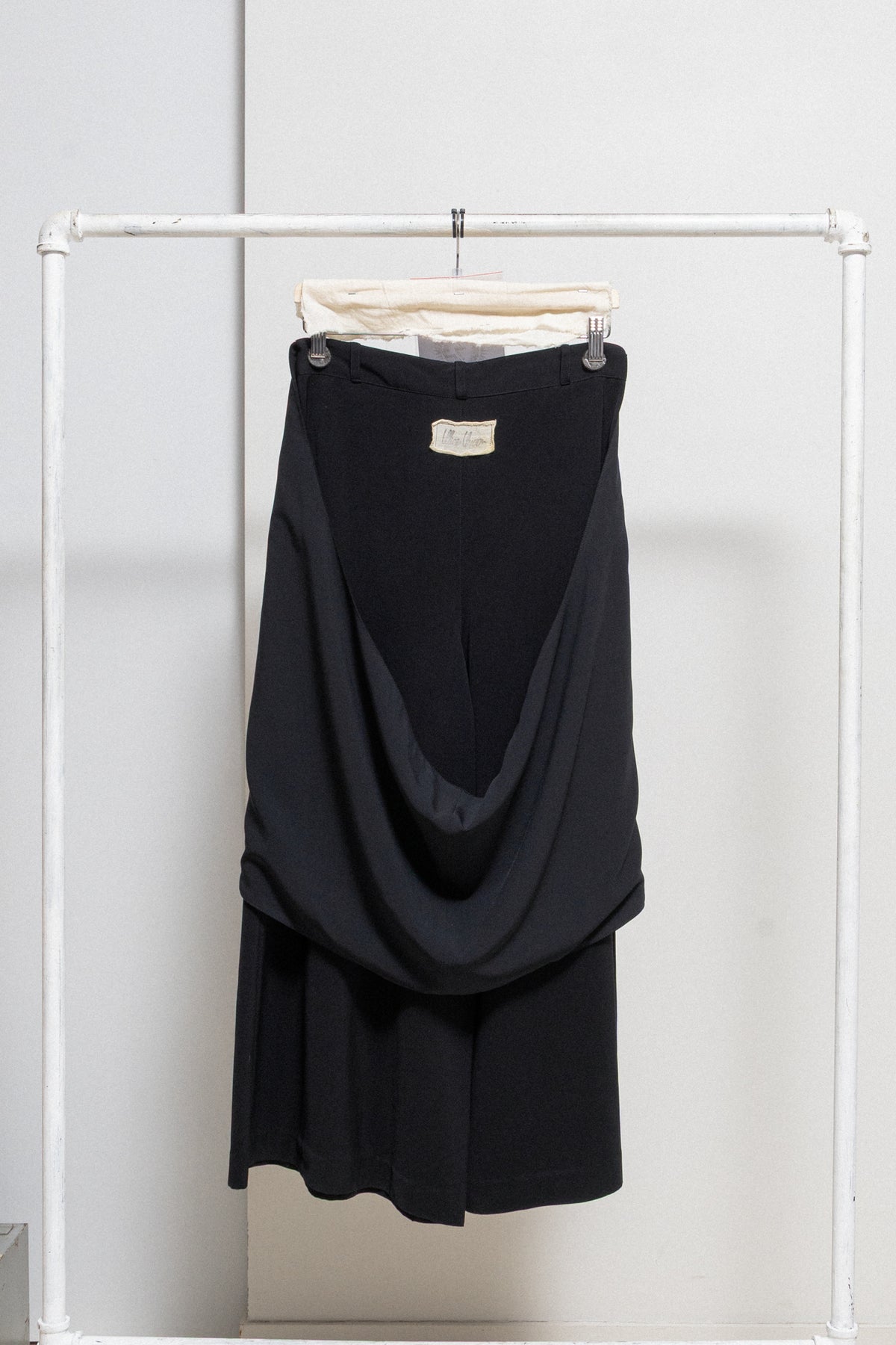 Beautiful pair of pants made of a soft fine wool fabric, featuring silky waist panels attached at the waist and falling around the back of the garment. Wide cut with a zipper and single button closure. No pockets.