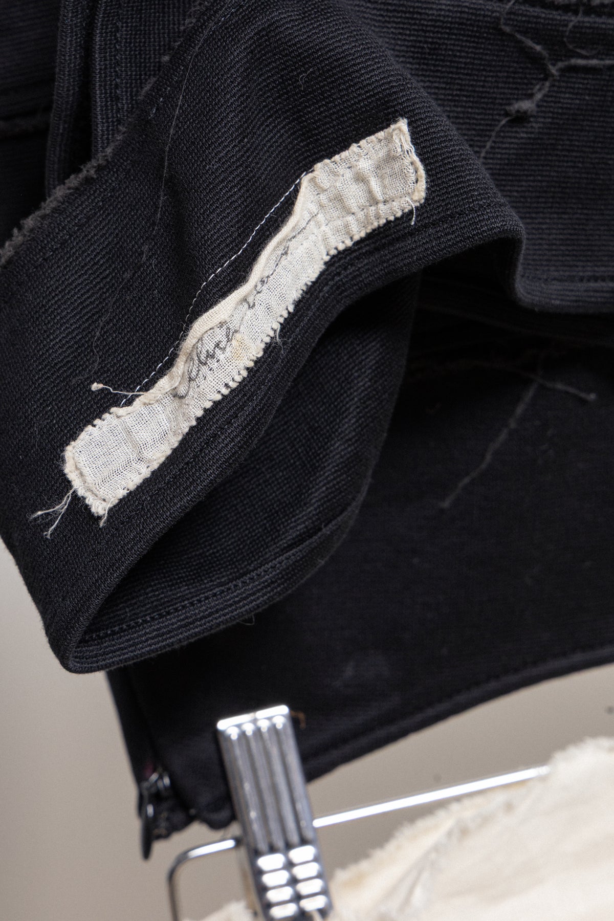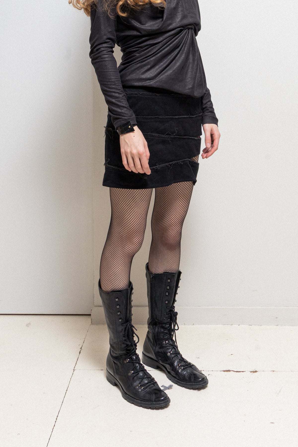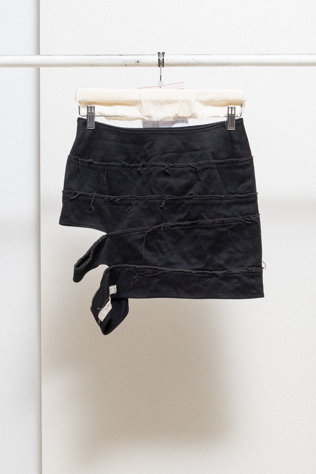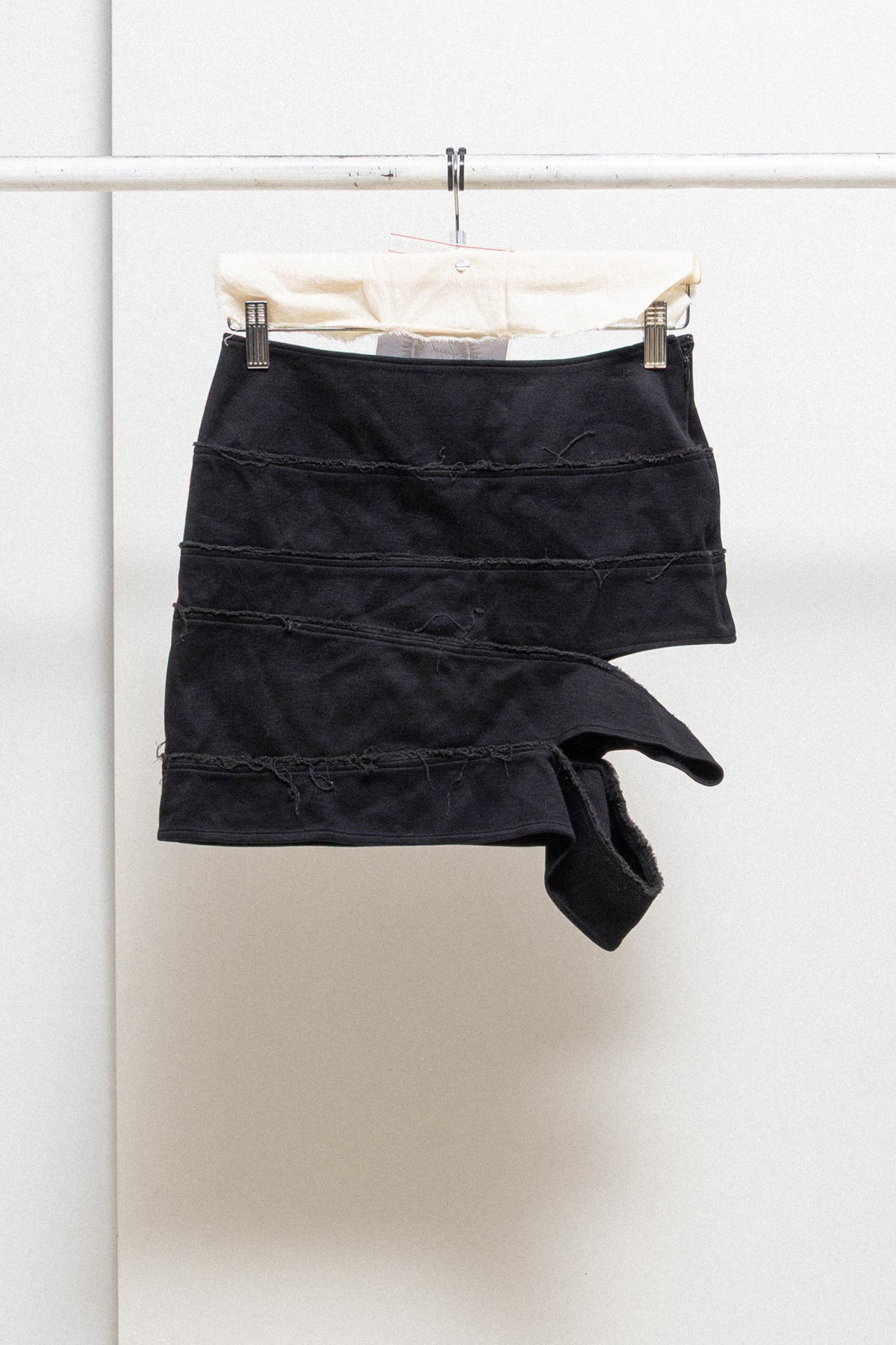 Lovely mini length black skirt made of a stretchy cotton fabric, featuring a hagi style sewing construction of horizontal panels with frayed seams and slashes on the side, making it asymmetrical. Closure on the side with a zipper. No lining.