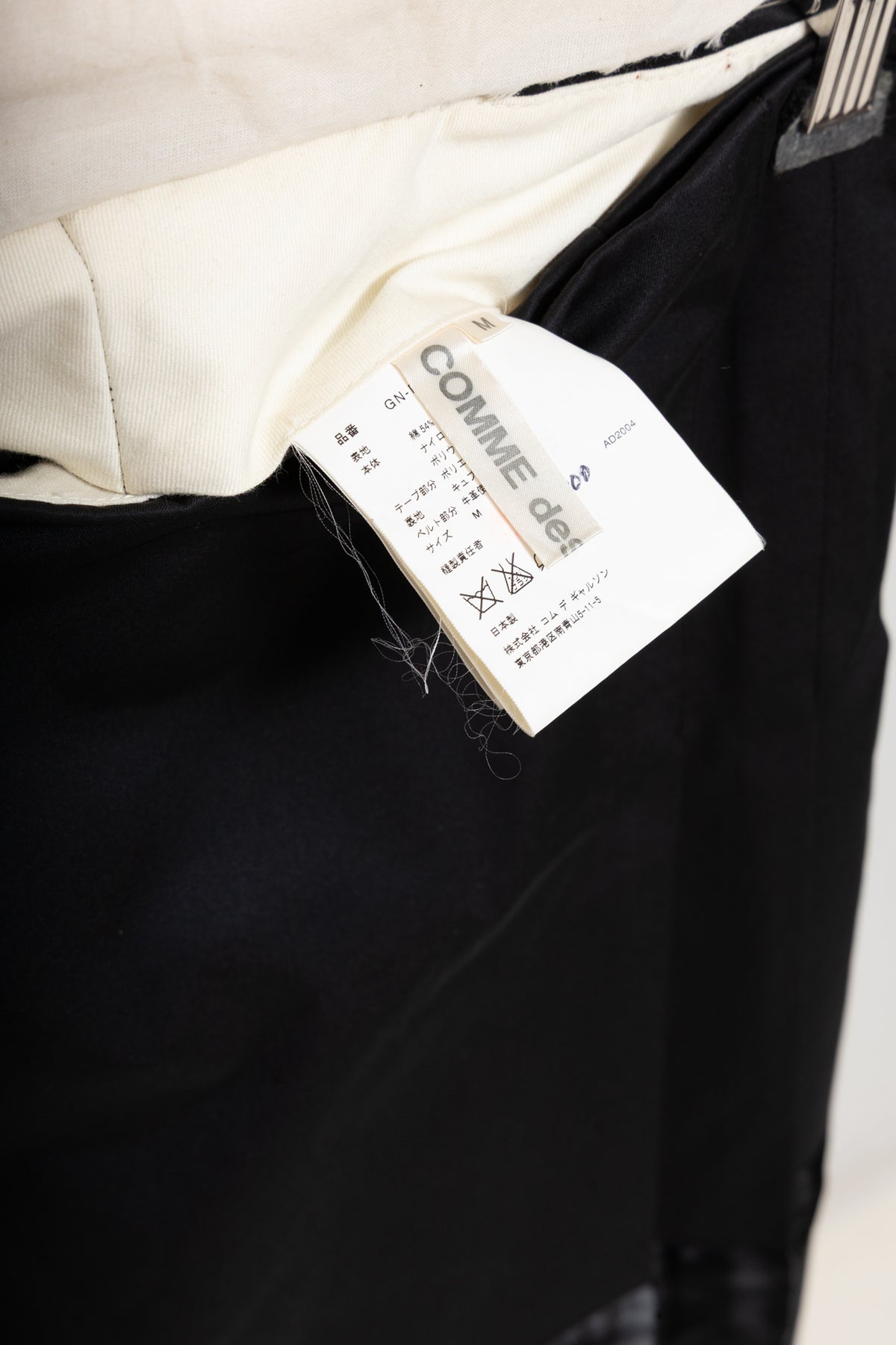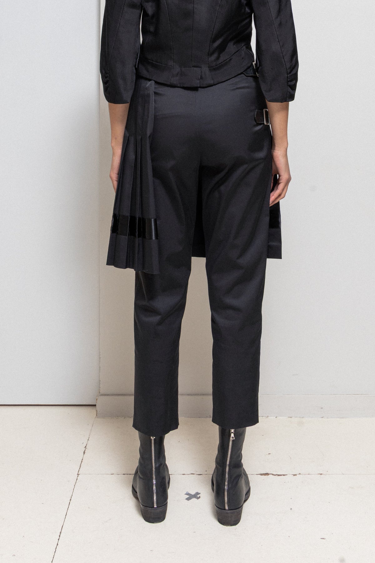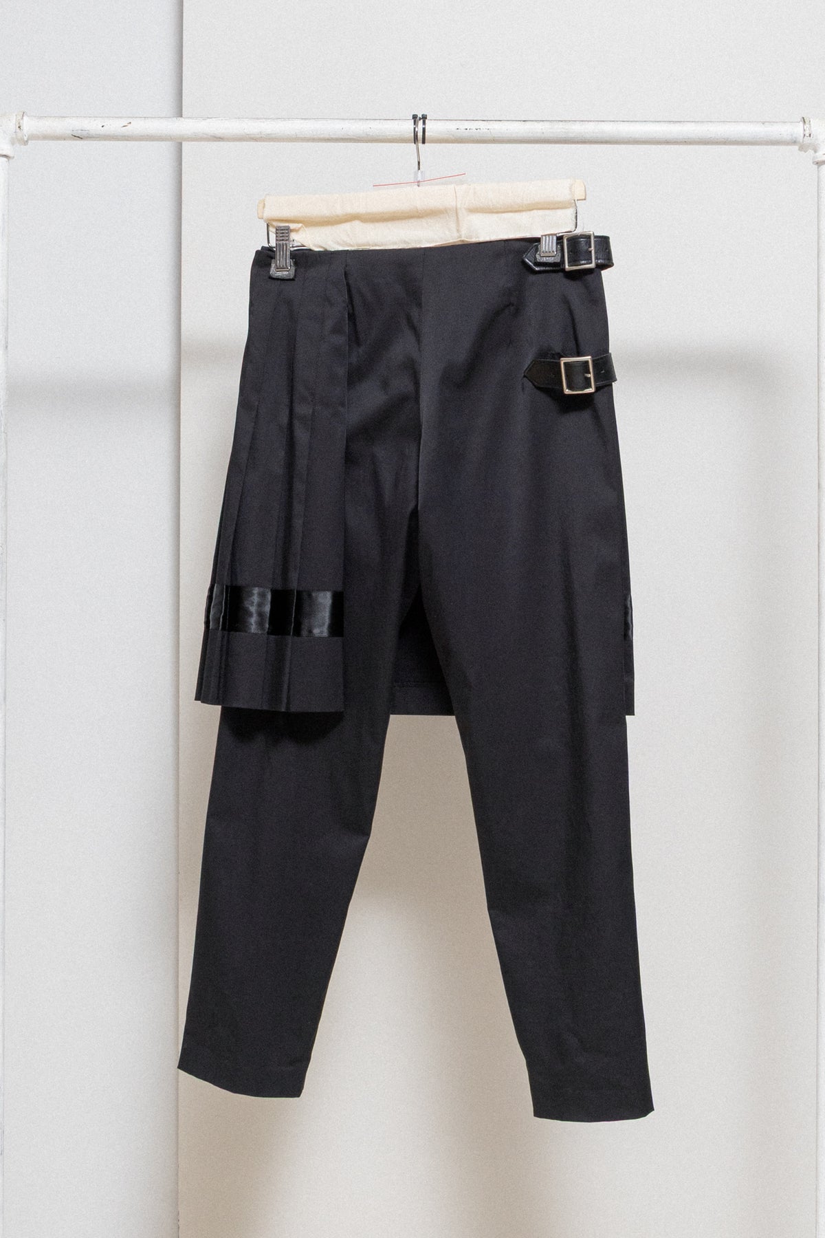 Beautiful pair of pants made of a cotton and nylon blend with a nice sheen, featuring a pleated extra skirt on top with a satin stripe going through and a ribbon detail. Leather buckled straps at waist reminiscent of a kilt. Straight cut.