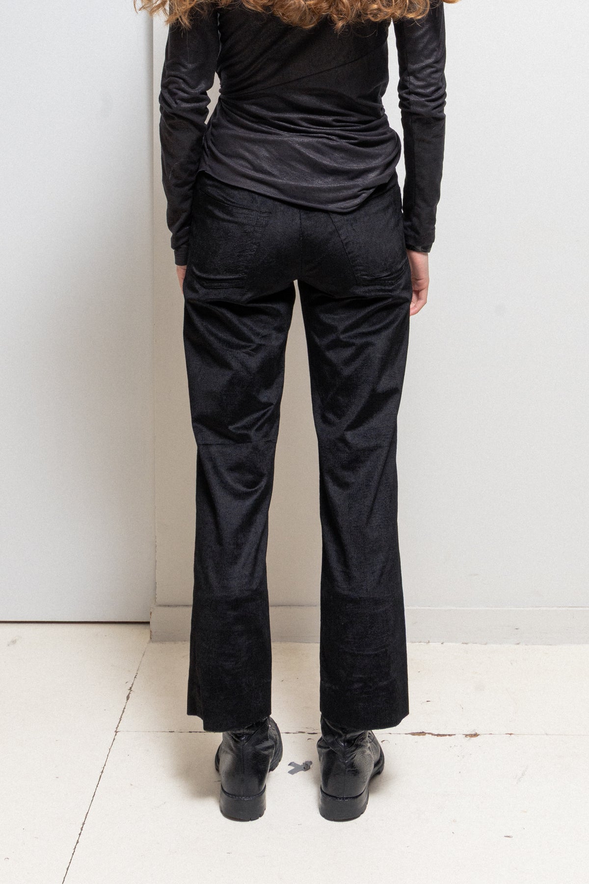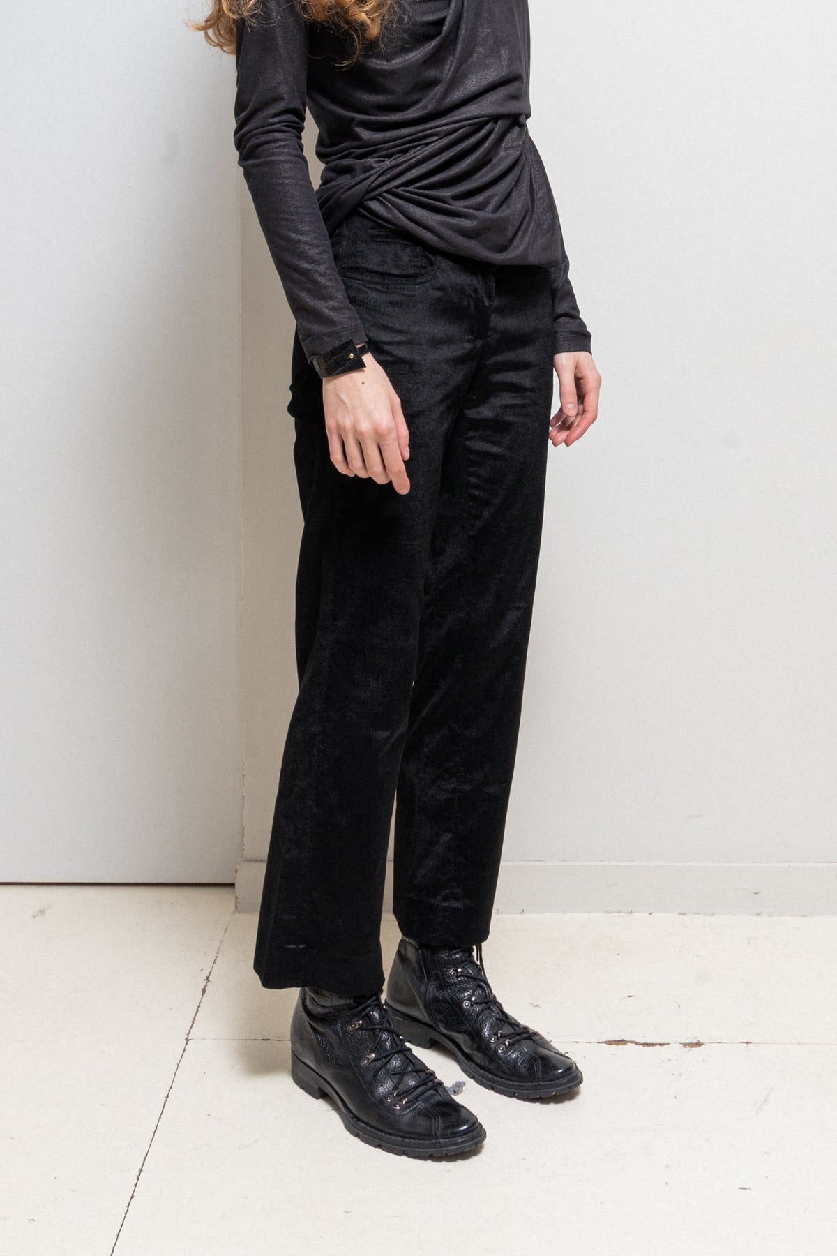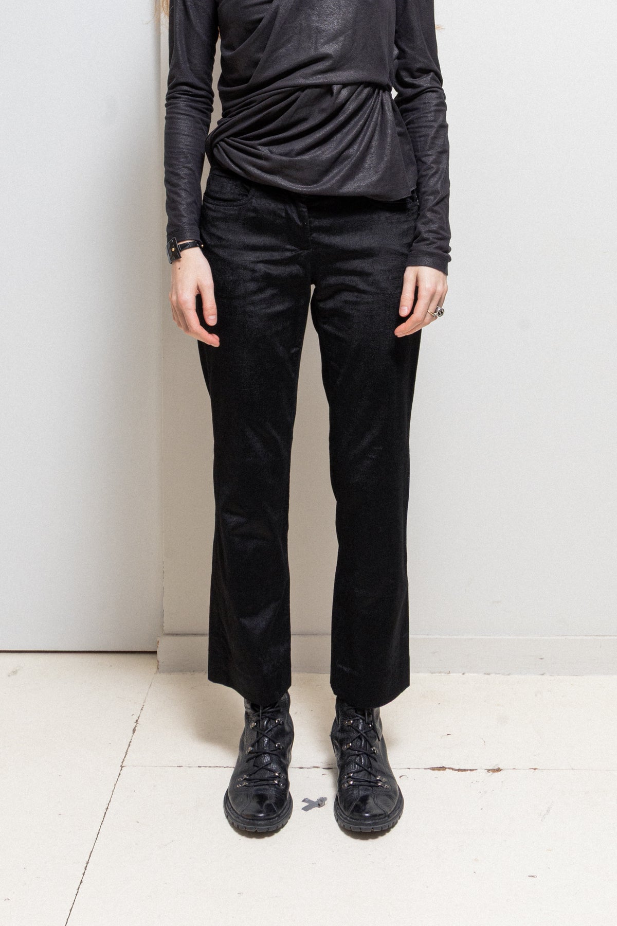 Lovely black pair of pants made of a shiny cotton velvet fabric with a corduroy texture, featuring straight legs shape. Invisible closure on the front with a metal zipper and a single staple. Belt loops. Pockets on the front and flat pockets at the back. Slightly cropped.