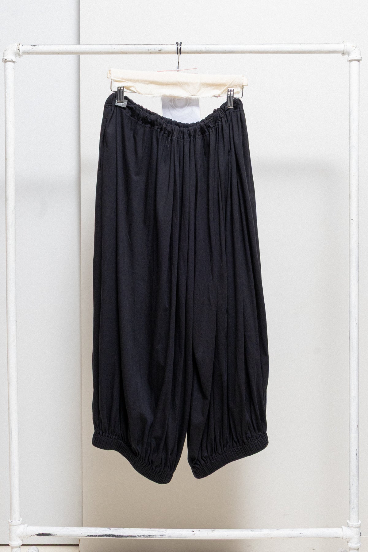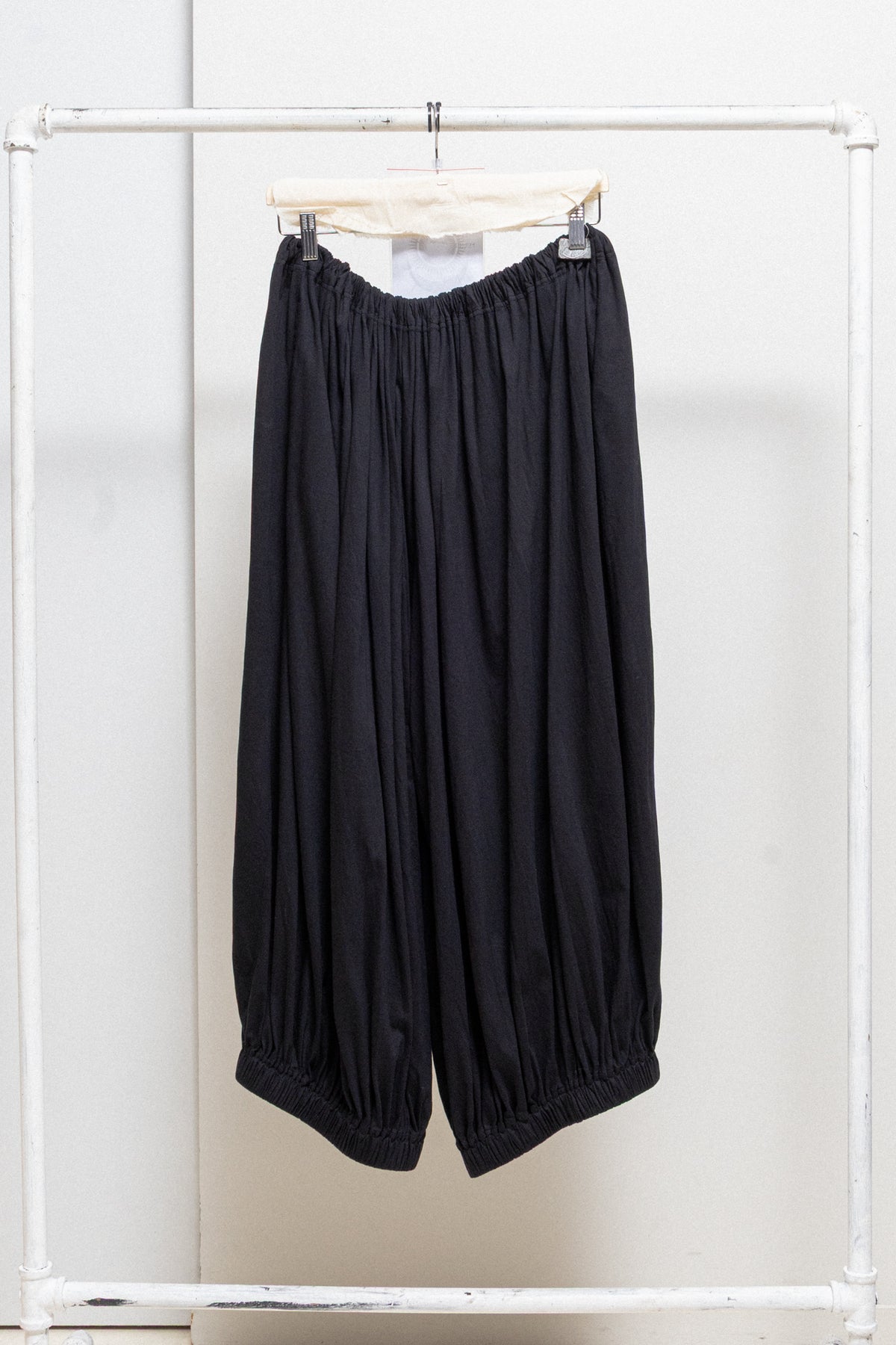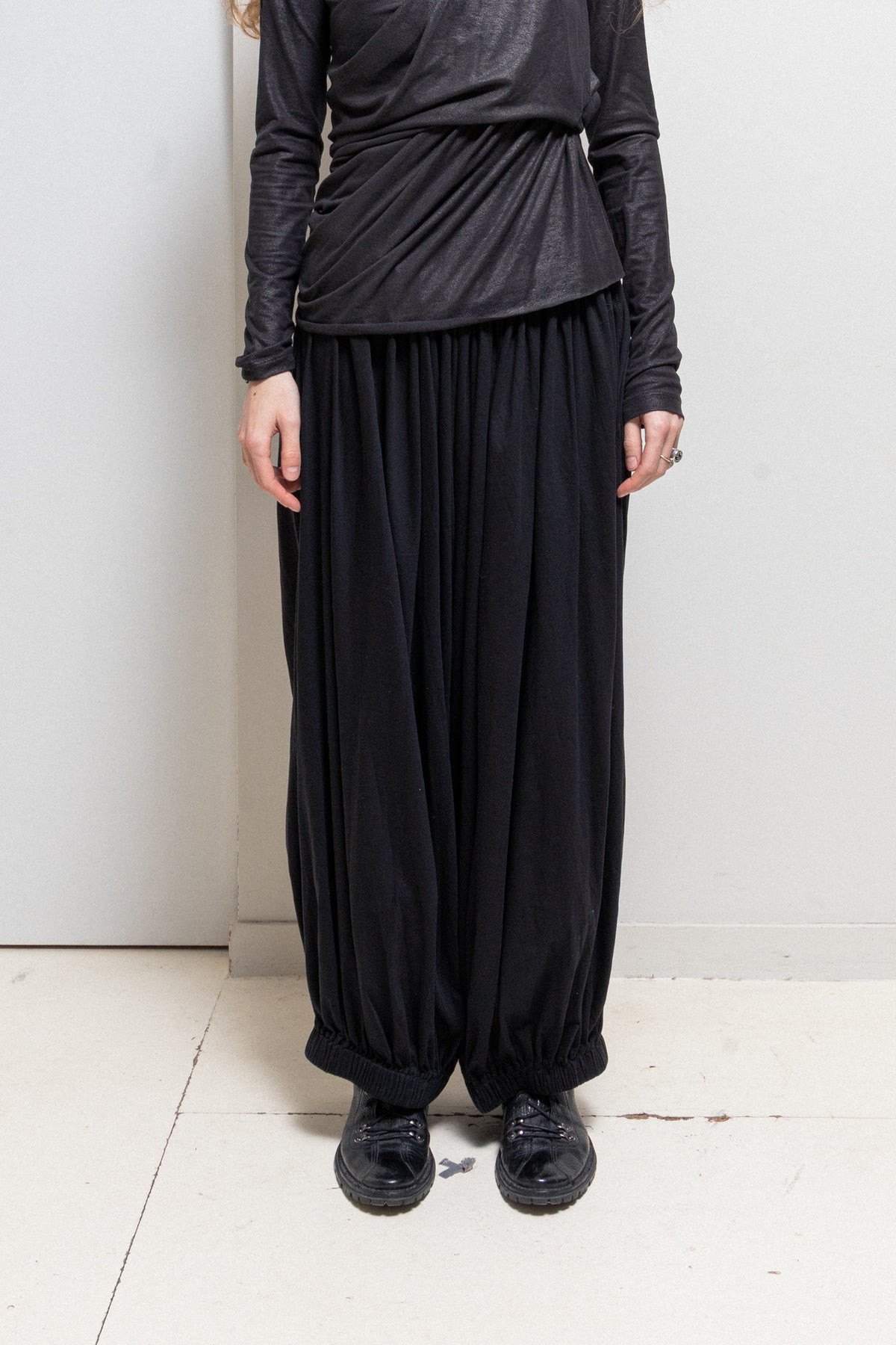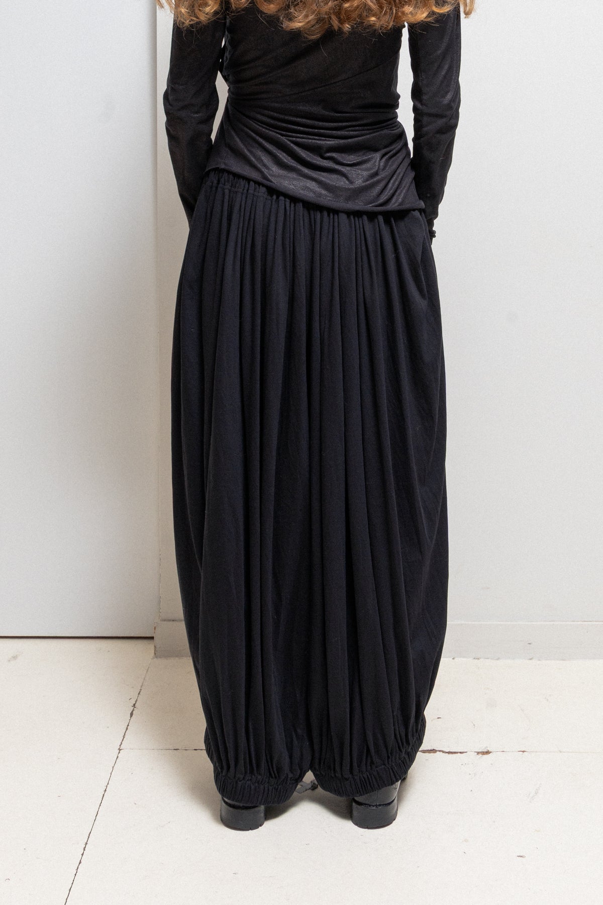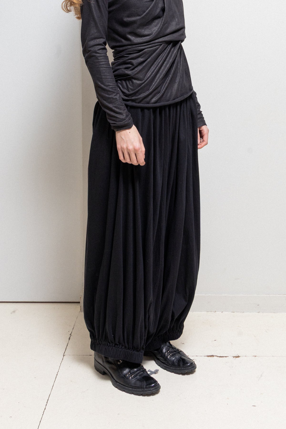 Incredible pair of black pants made of lightweight and soft rayon fabric, featuring a balloon shape and a very detailed work of pleating all over the garment. Waist and ankle elastic bands. No lining and no system of closure.
