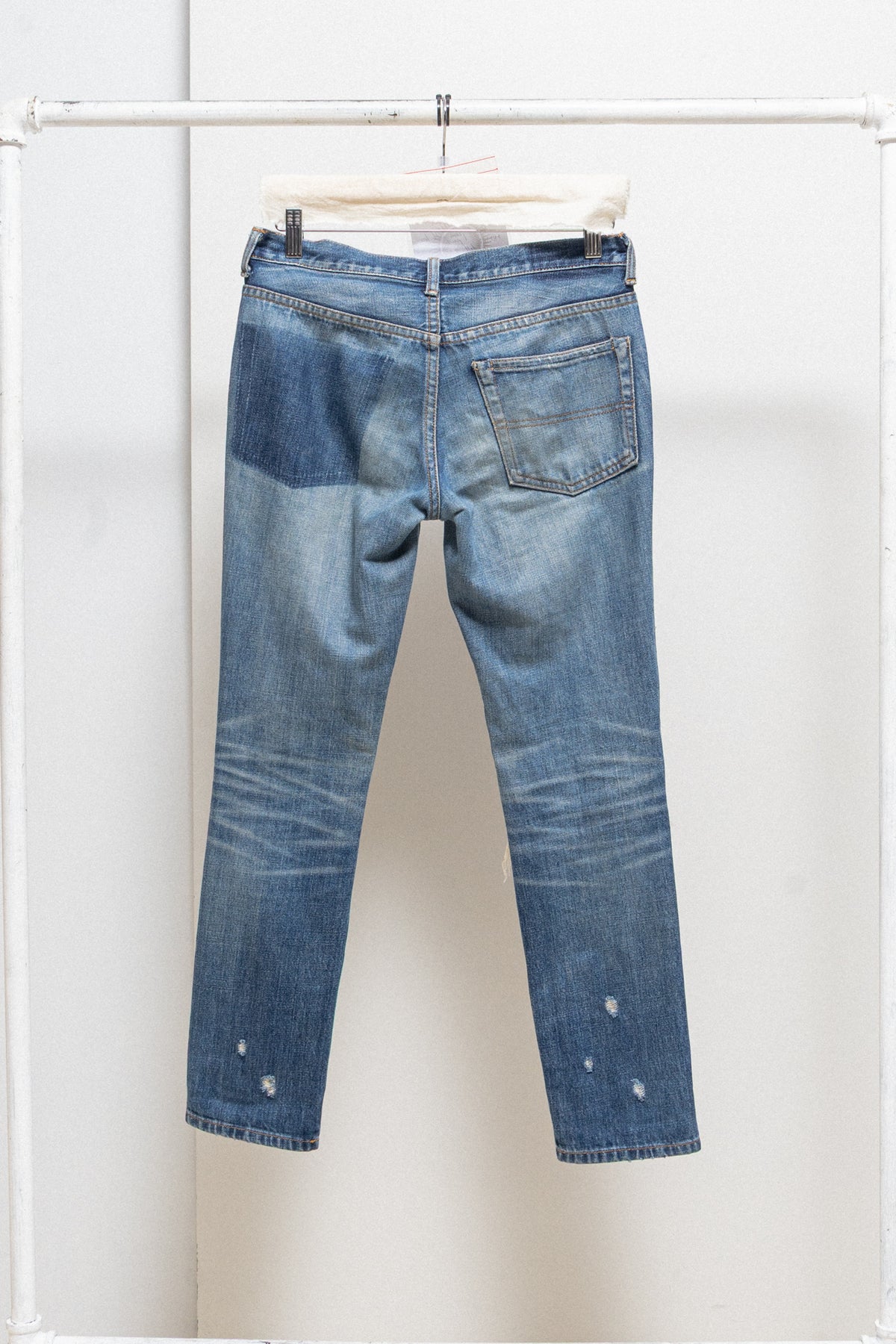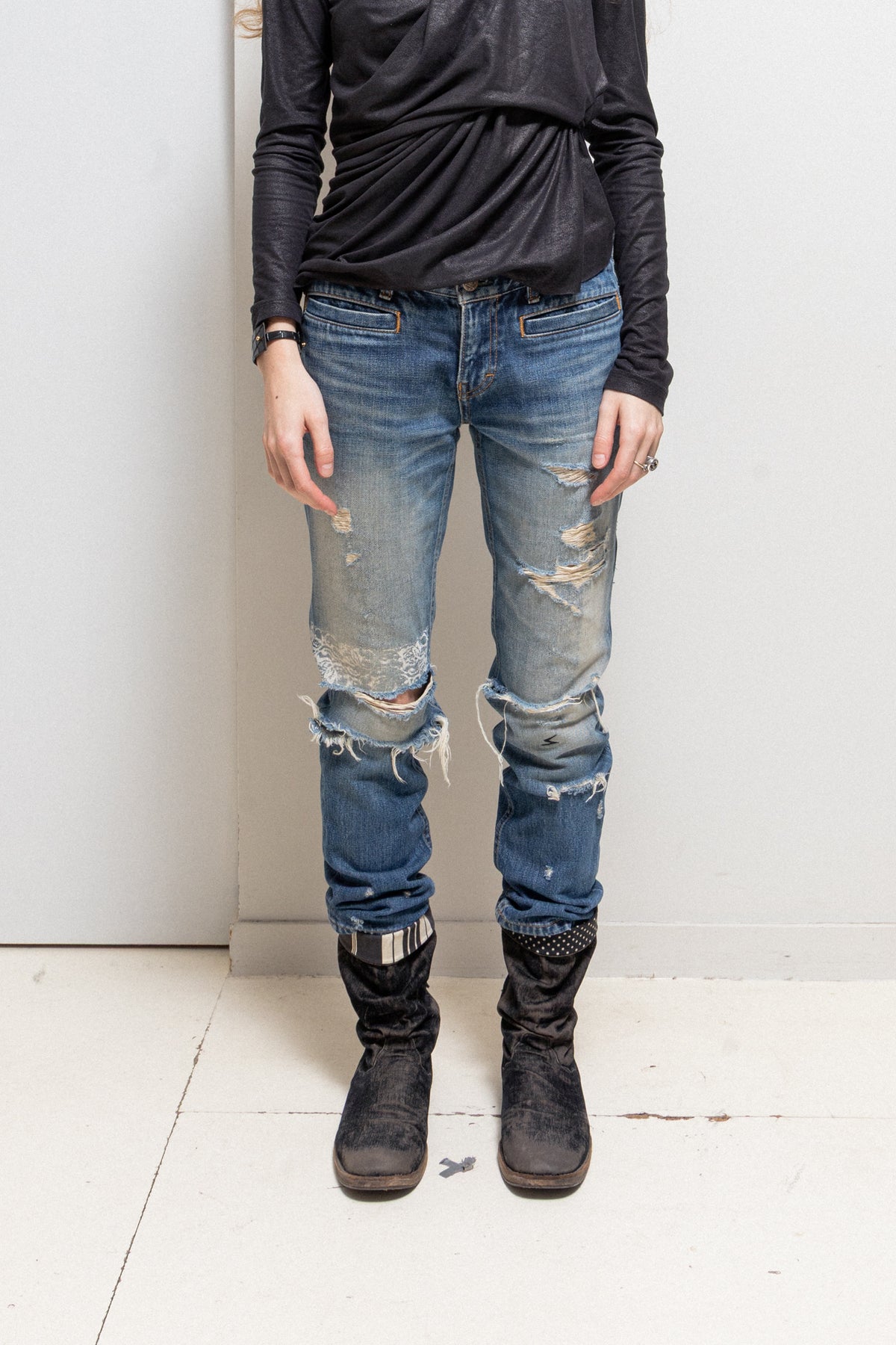 Lovely pair of light washed jeans made of cotton denim, featuring ripped knees and a lace band motif on one leg, as well as signature Patti Smith's lighning embroidery on the other. Slim fit, two pockets at front, one pocket on the back. Belt loops.