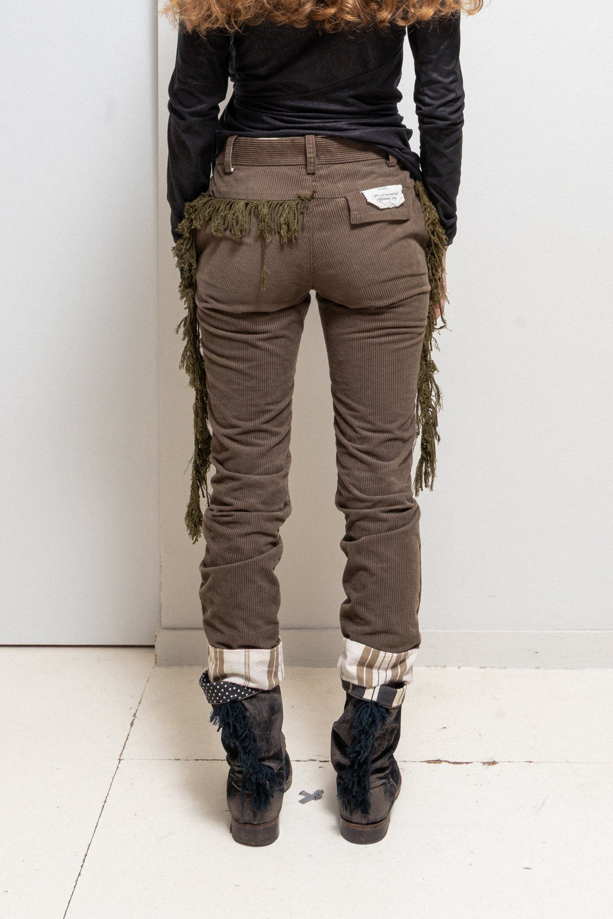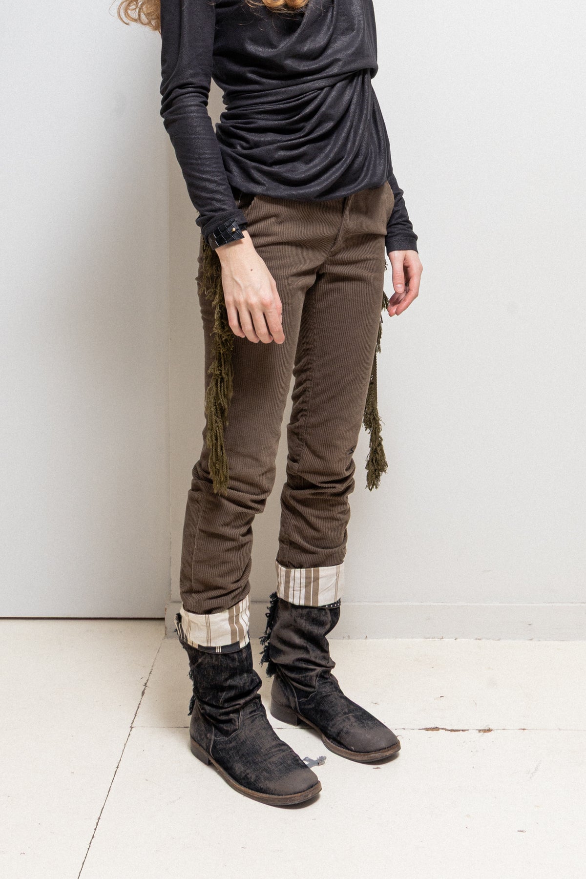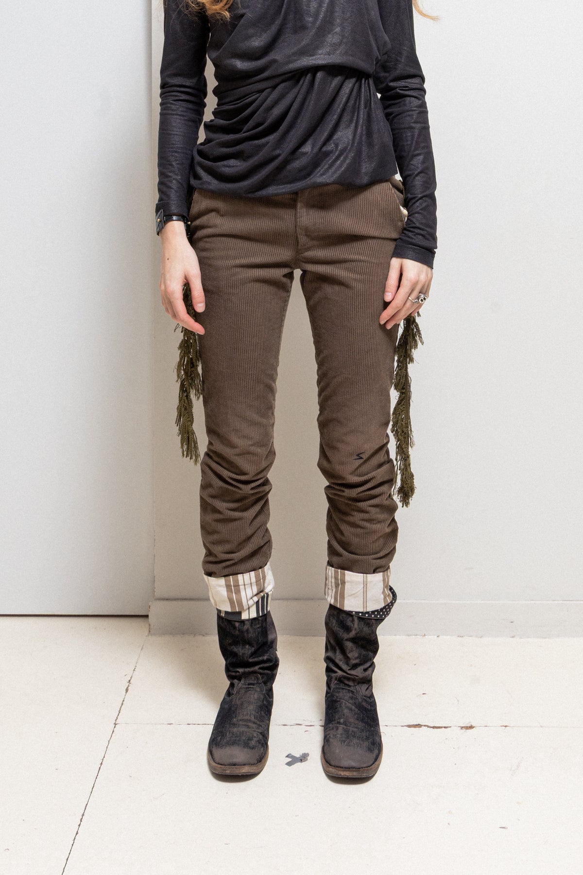 Incredible pair pants made of a ribbed velvet fabric, featuring a straight and slim shape with amazing details. Thinly padded signature plush mismatching lining on the bottom of the legs using a contrasting cream and light brown striped fabric. Closure on the front with a metal zipper and metal staple under the crossing belt. Details of kaki fringes along the sides and in part of the back. Italian pockets on the front and flap pocket in the back all lined with beautiful patterned cotton fabrics. Signature Patti Smith lightning embroidery on one knee.