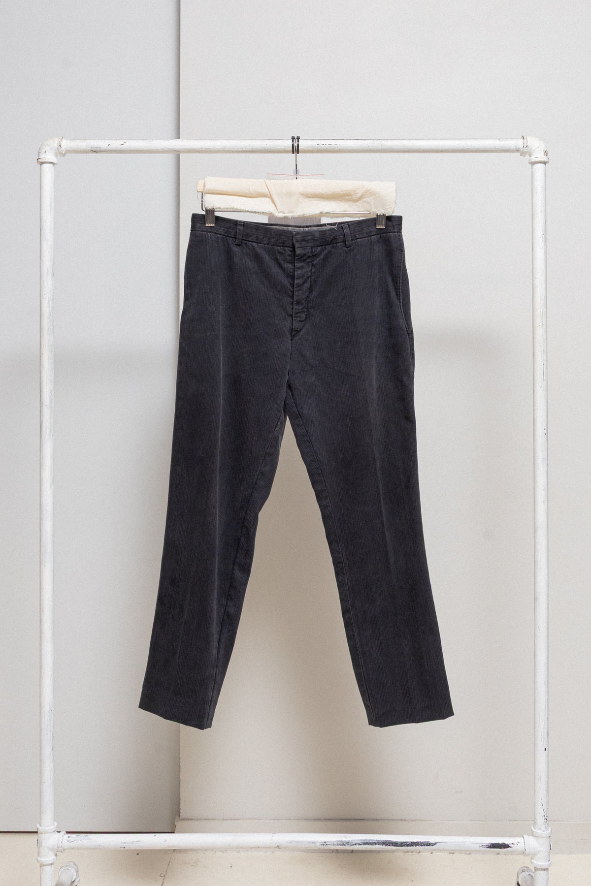 Amazing pair of pants made of a soft cotton with a textured pinstripe pattern, featuring curved side pockets. Straight perfectly tailored cut with front and back pleats, as well as back pockets.