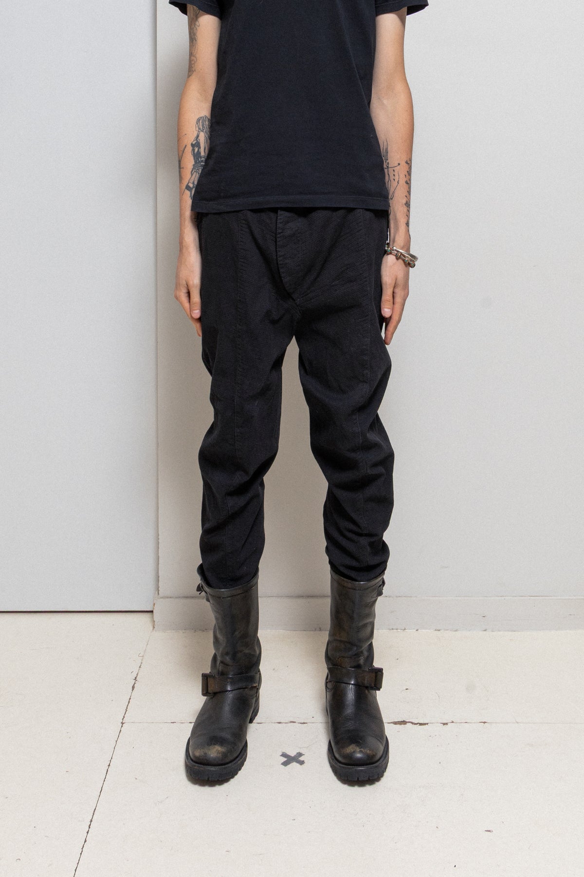 Nice pair of pants made of a textured cotton, featuring a wooden closure button and structuring seams throughout. Straight cut with a low crotch, narrowed bottoms, a pocket each side, back lower pockets and belt loops.