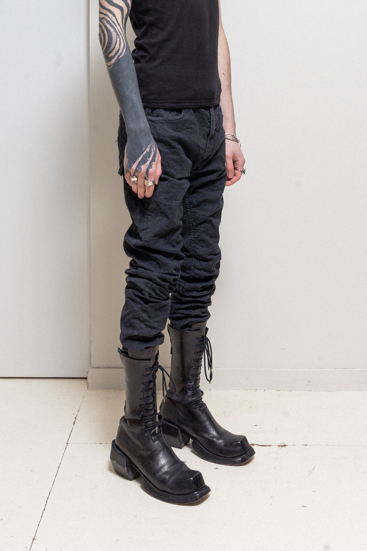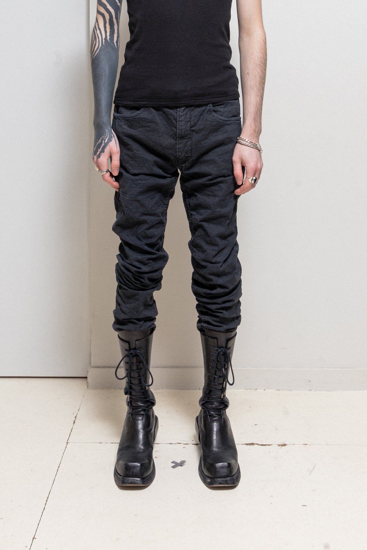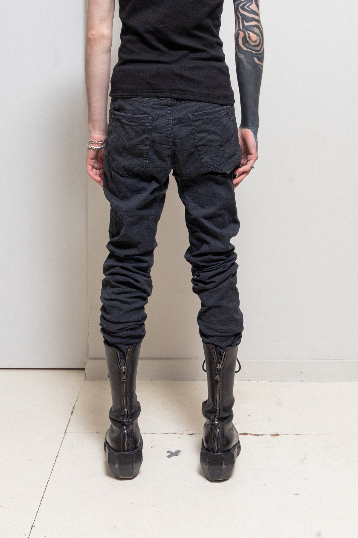 Amazing pair of pants made of a textured cotton blend with a light sheen given by metallic threads woven in, featuring a beautiful brass button at the waist. Slim and elongated cut. Classic four pockets construction with belt loops.