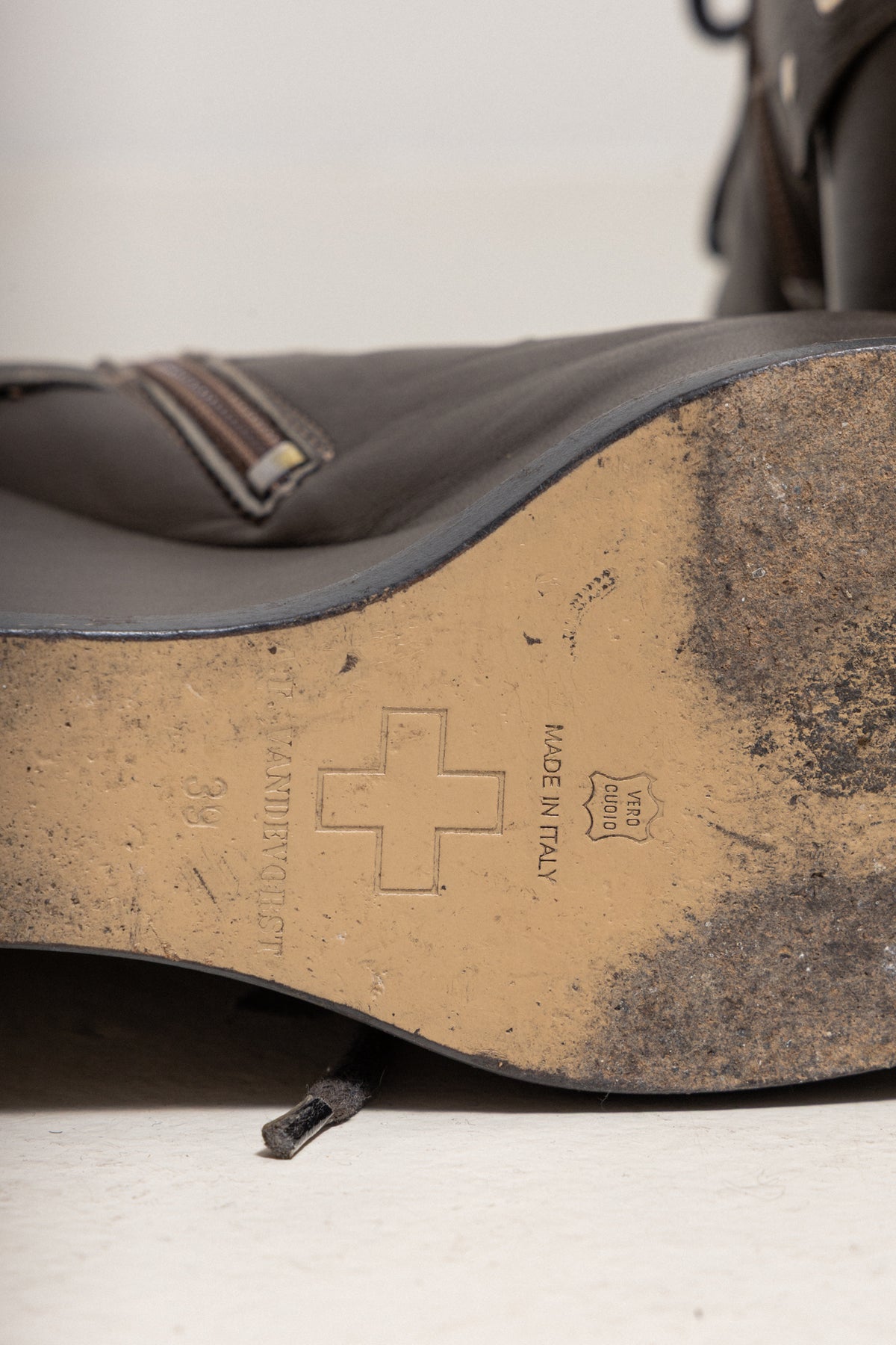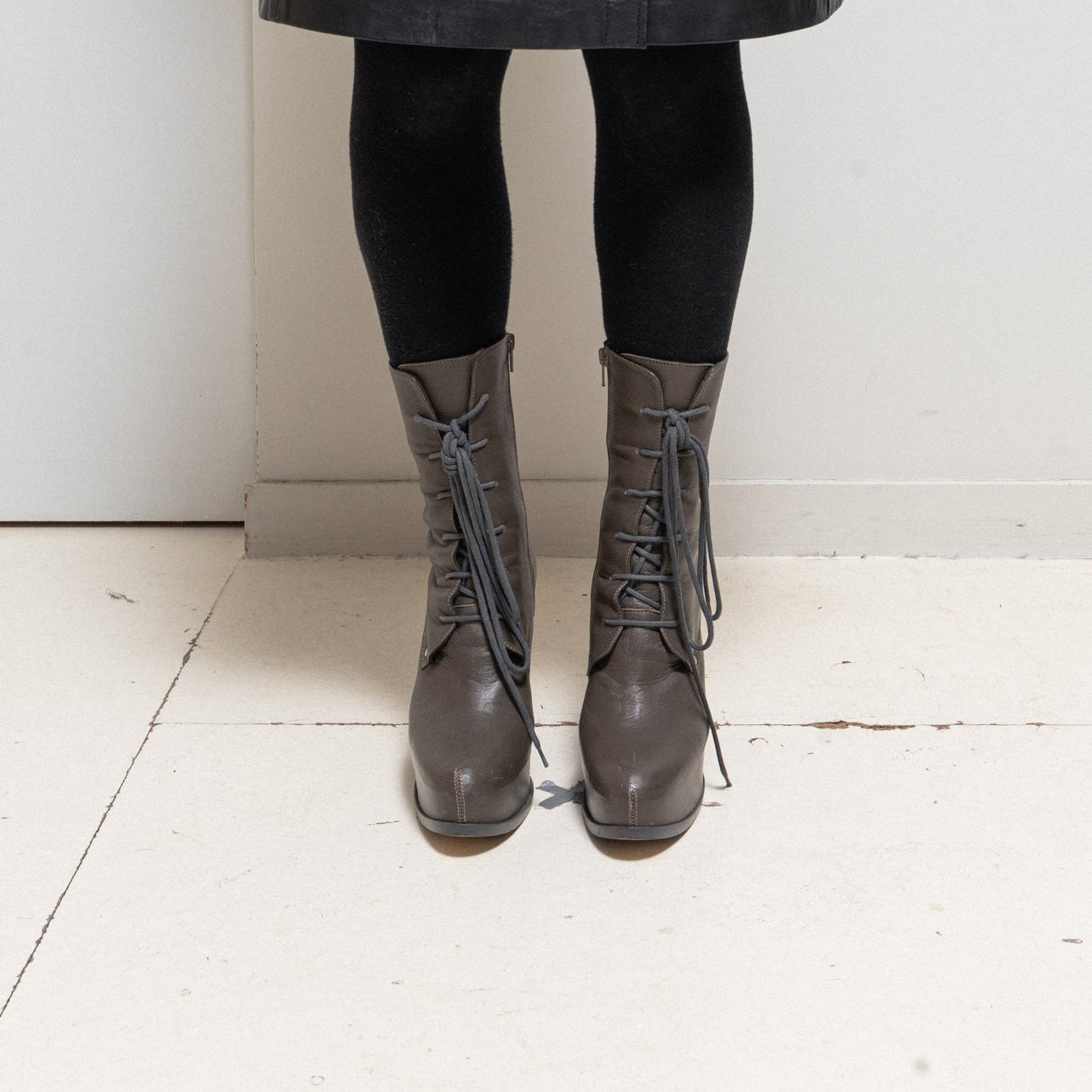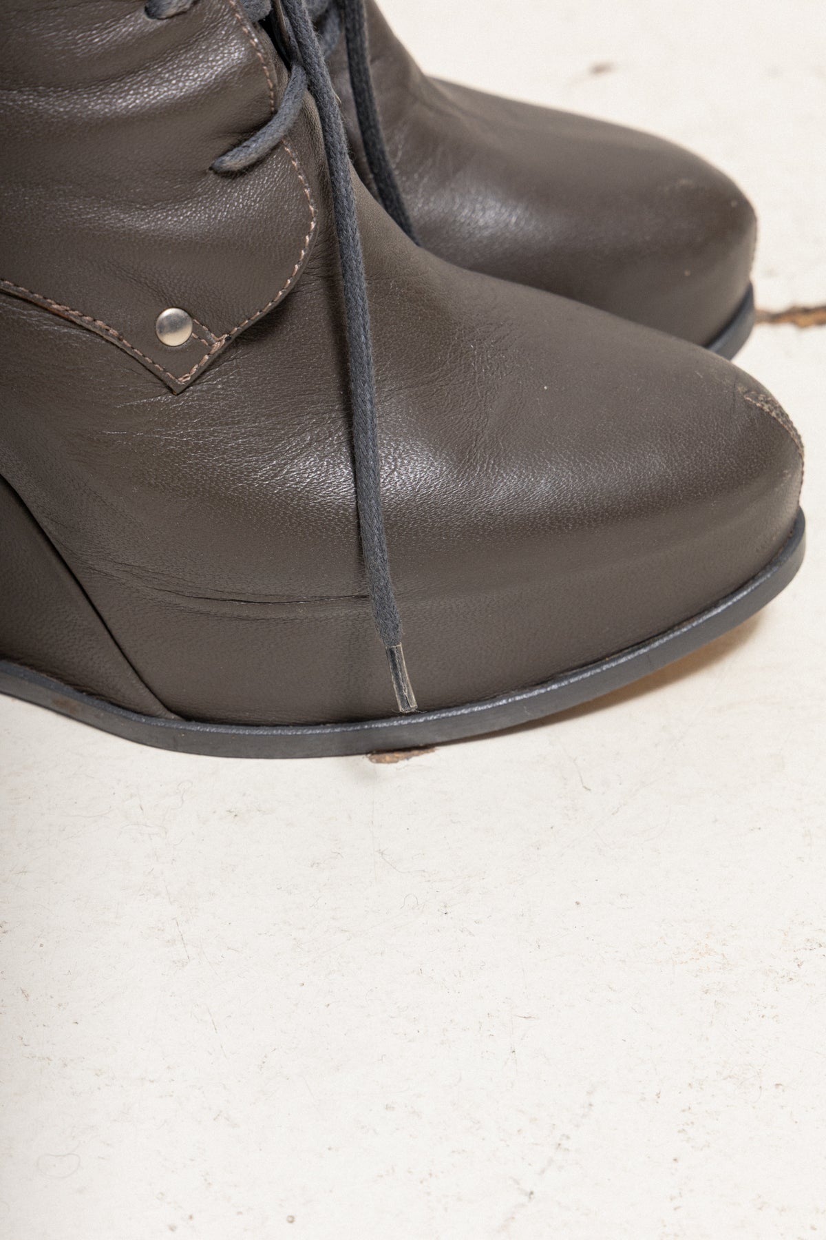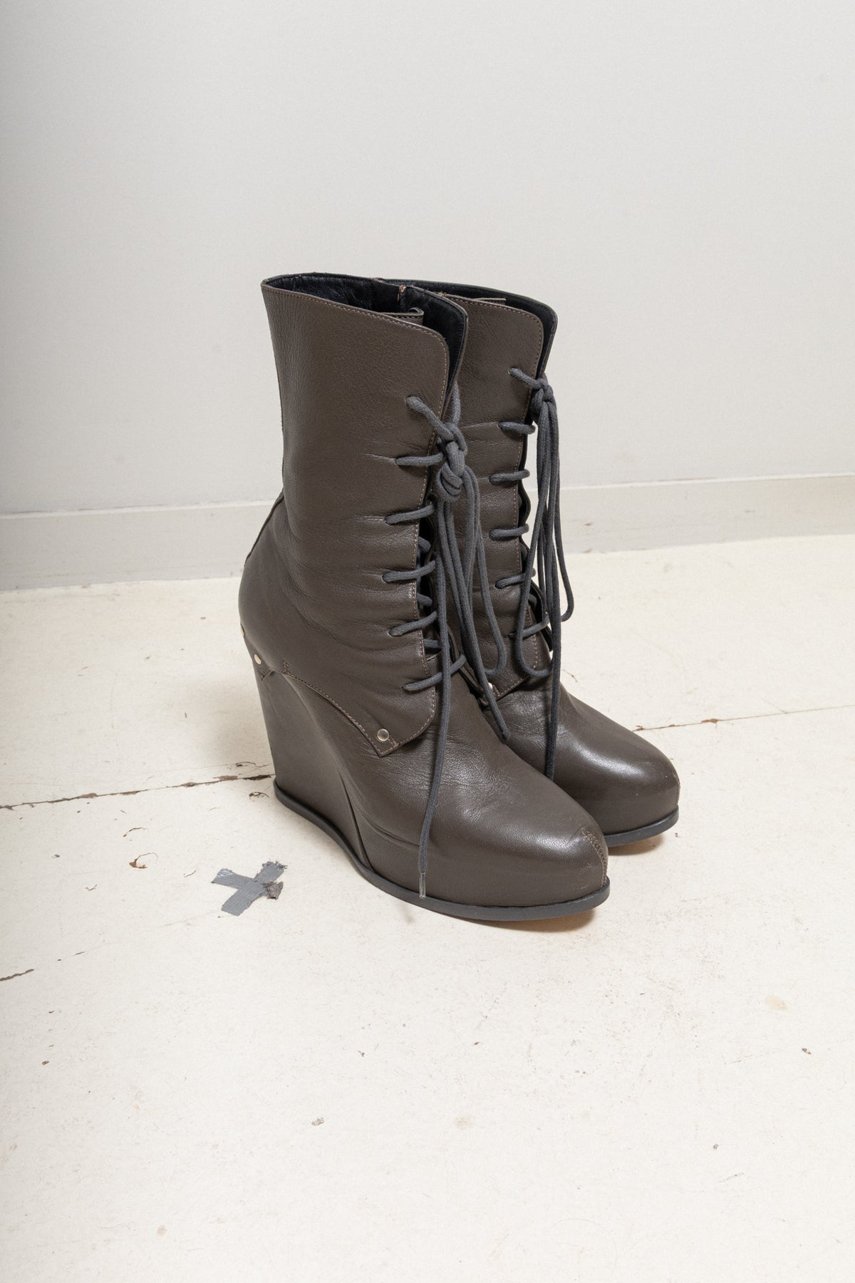 Beautiful pair of boots made of a supple leather, featuring a high wedge heel as well as front lacings. Small decorative stud details.