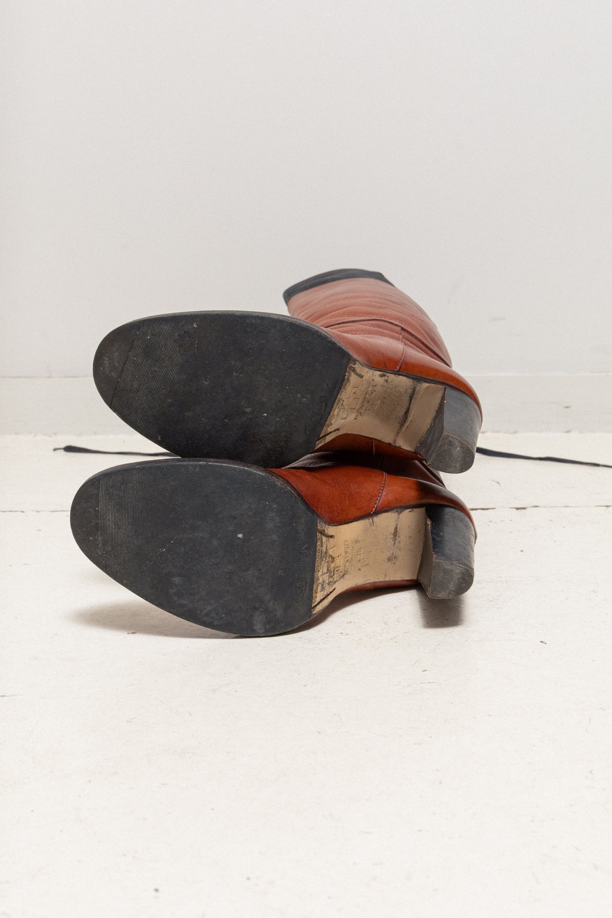 Amazing pair of high boots made of supple leather in a nice reddish brown color with a beautiful shine. Thinner top part in a contrasting black color, with long straps at the back. Slightly pointy toes and a 9cm heel.
