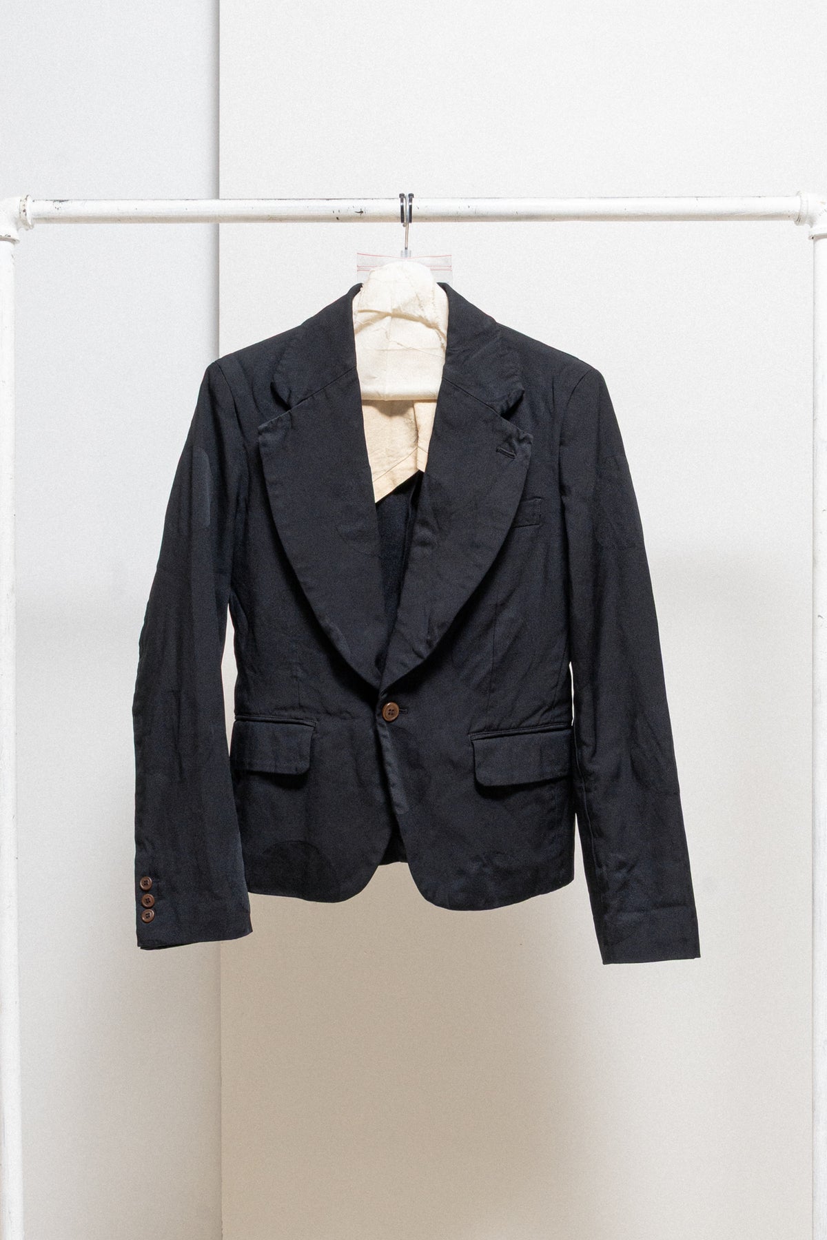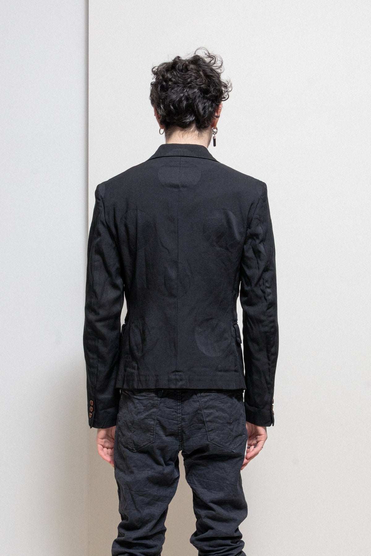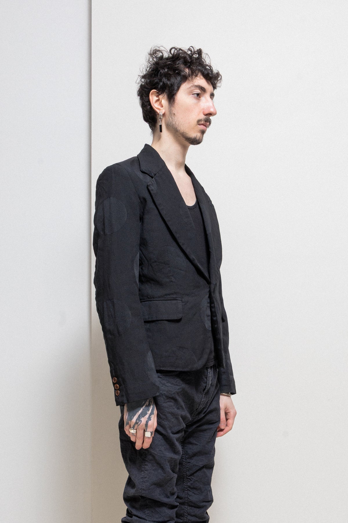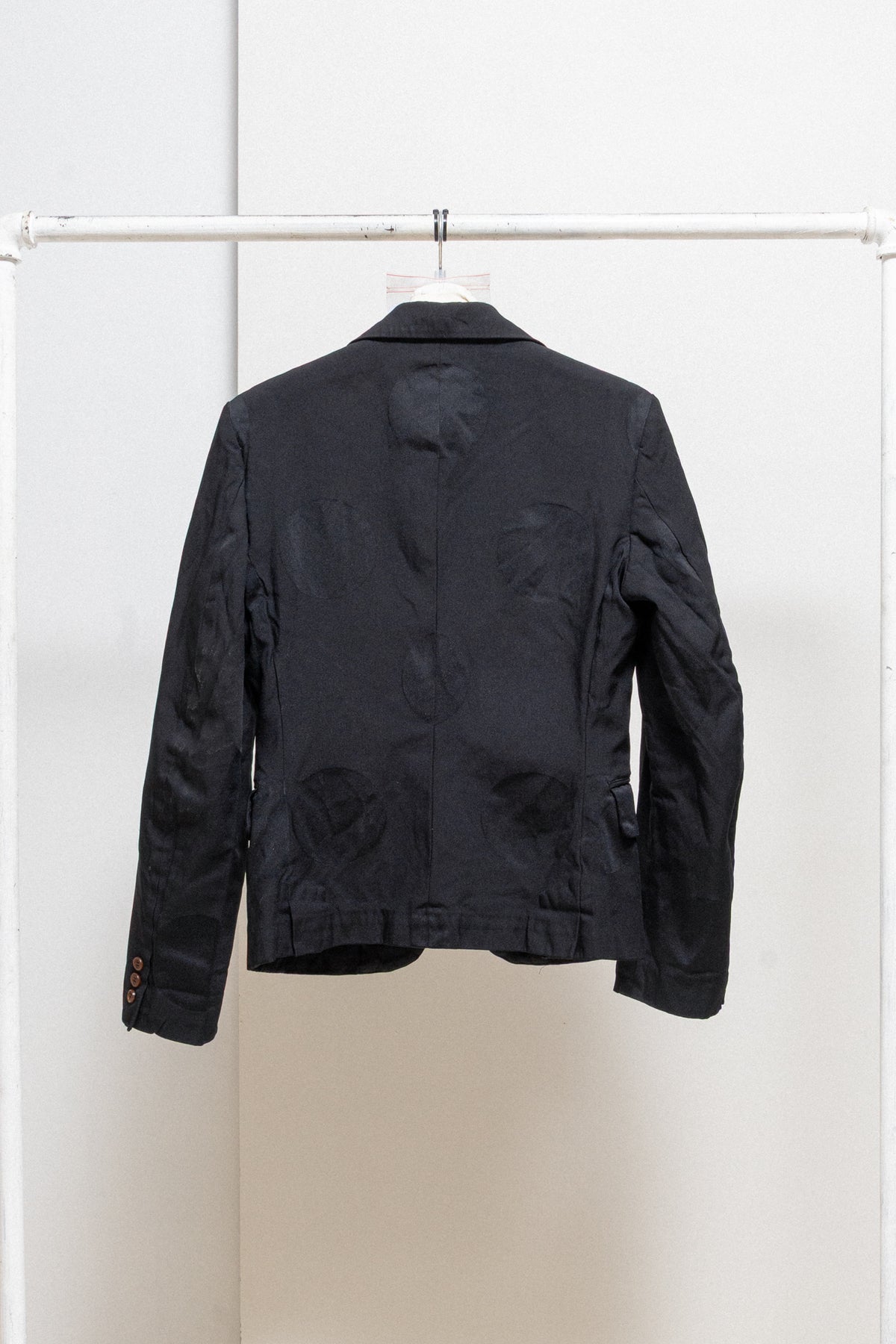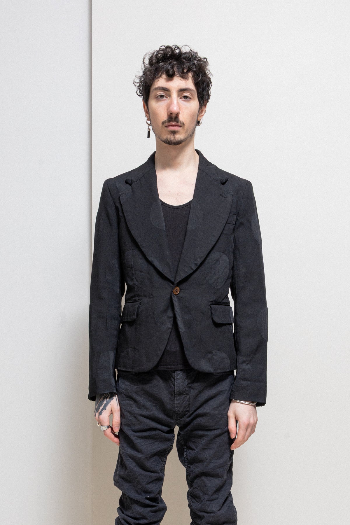 Gorgeous jacket made of signature CDG poly fabric, featuring large circle shaped patterns all over the garment. Cropped cut with oversize notch lapels, single button closure, a pipped flap pocket each side. Cuff splits with three buttons and a contrasting beige half-lining made of a soft fabric.