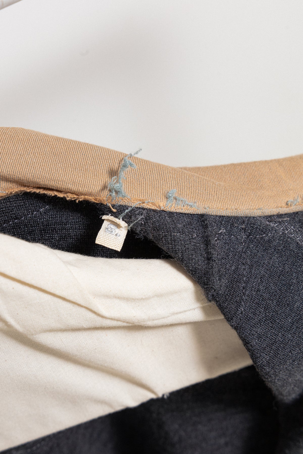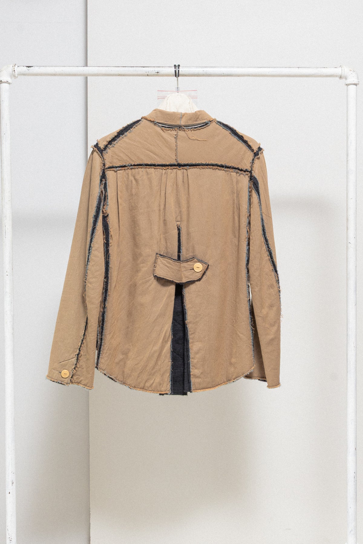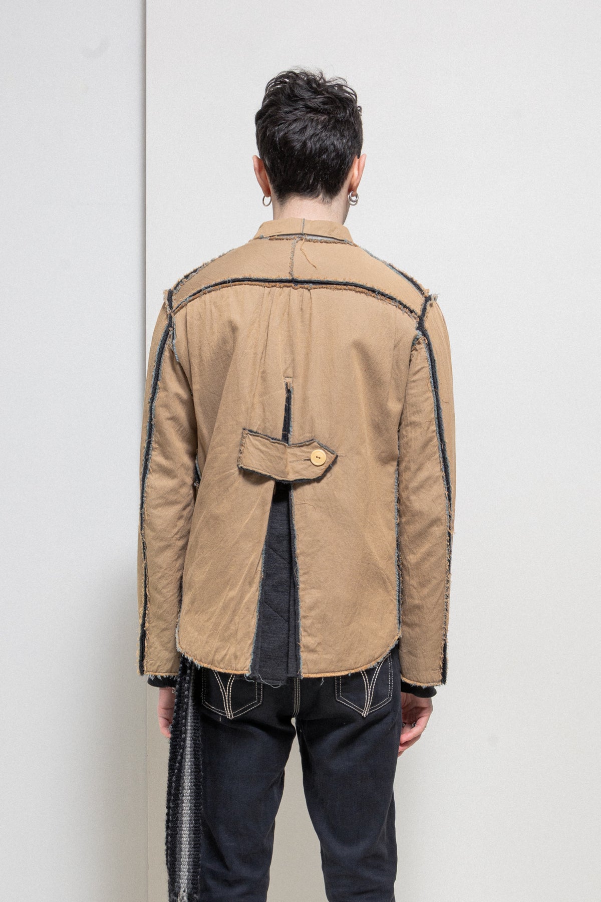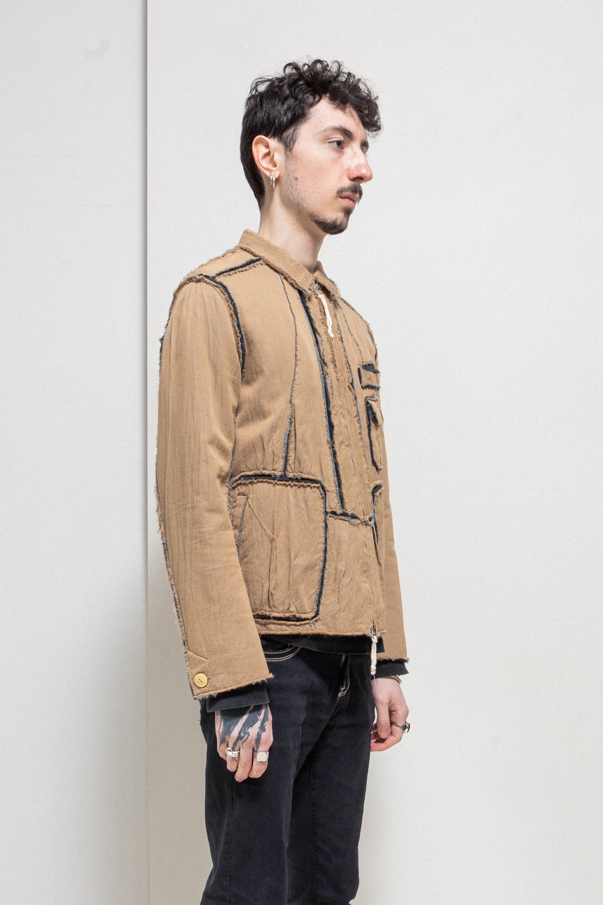 Incredible brown jacket made of a soft blended wool and cotton fabric, featuring details of split frayed seams showing the contrasted dark grey lining in between. Raw edges. Shirt collar. Front closure with a metal zipper and detailed with a white string. Numerous types of pockets on the front from flat to piped. Cuff splits with a single button. Middle back split with three invisible cream buttons. Back strap. Slightly elongated back.