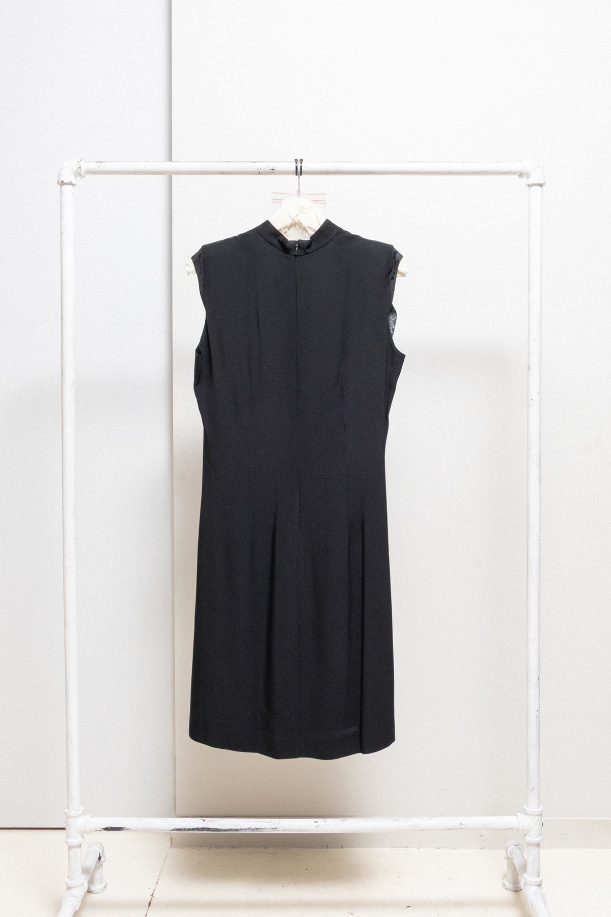 Beautiful sleeveless dress made of a thin and lightweight fleece wool like fabric, featuring a standing neck and padded shoulders. Back zipper closure.