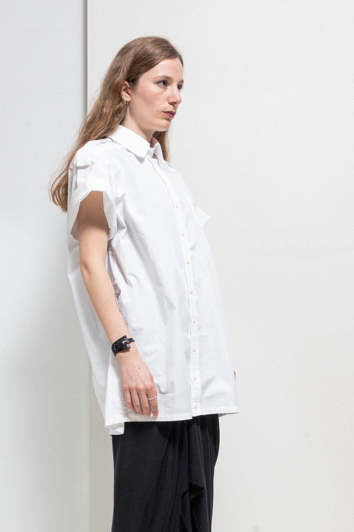 Incredible white shirt made of light cotton fabric, featuring wide short sleeves as well as extra-large adjustable shoulder plackets. Traditional shirt collar. Front closure with ten buttons. Waist loops. Chest patch pocket. Back collar buttoning. Signature red thread cross in the back.