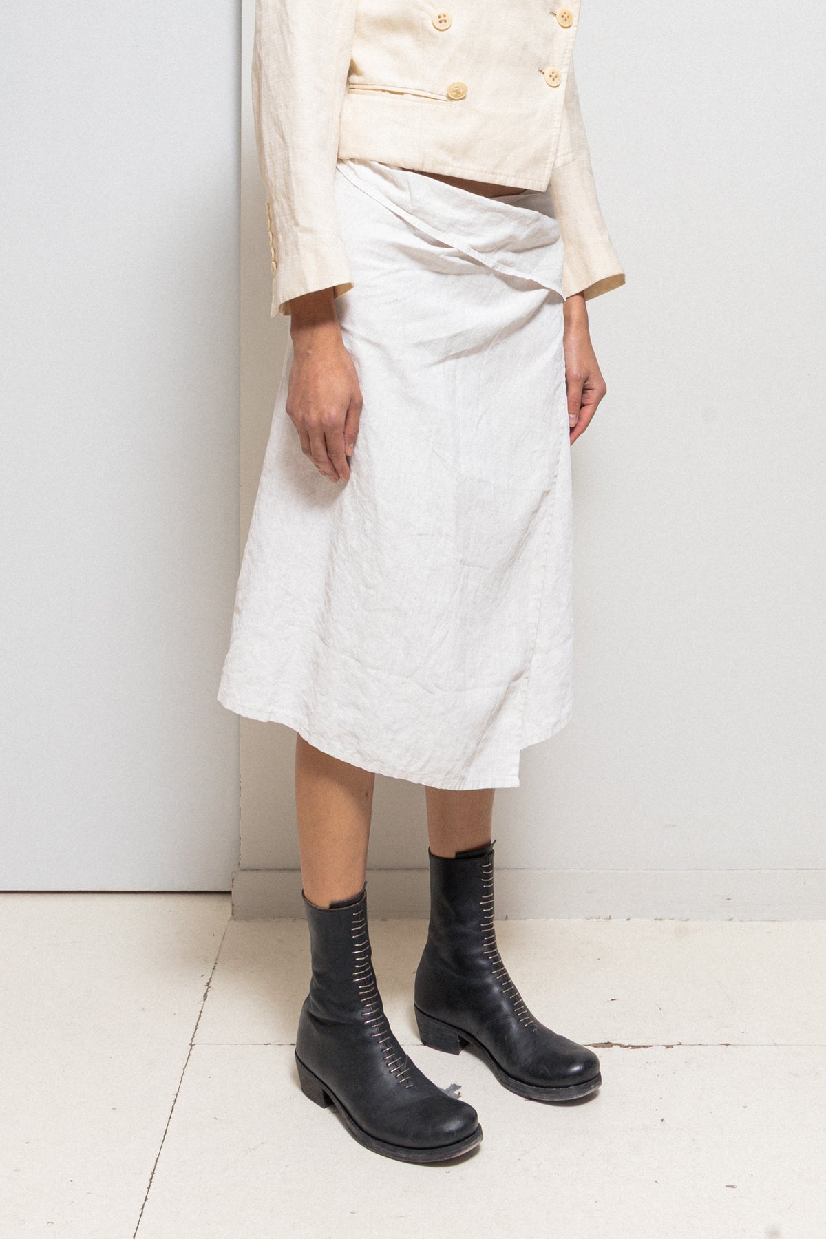 Wonderful skirt made of a thin and supple linen fabric, coated with white paint, creating a very beautiful effect. Midi cut with waist straps to wrap it up, creating asymmetrical shape if tied as seen on the runway.