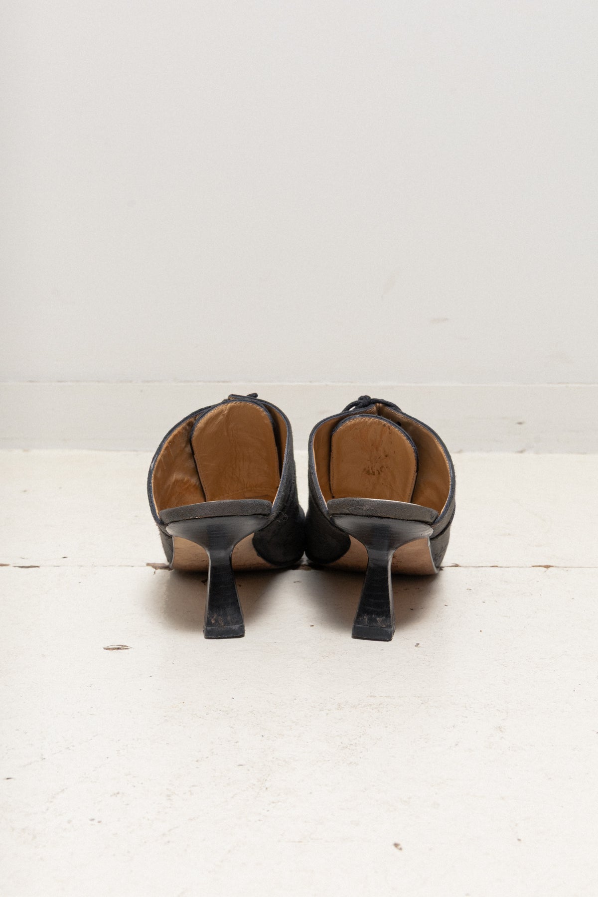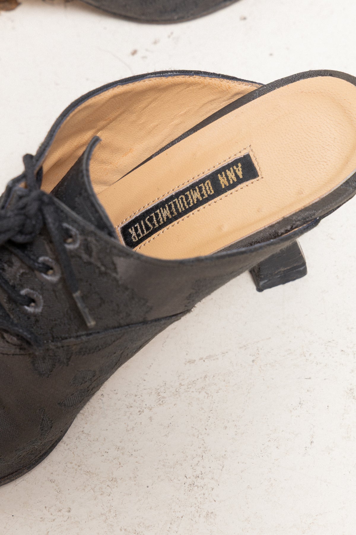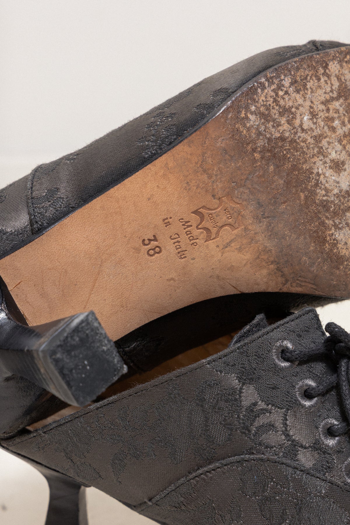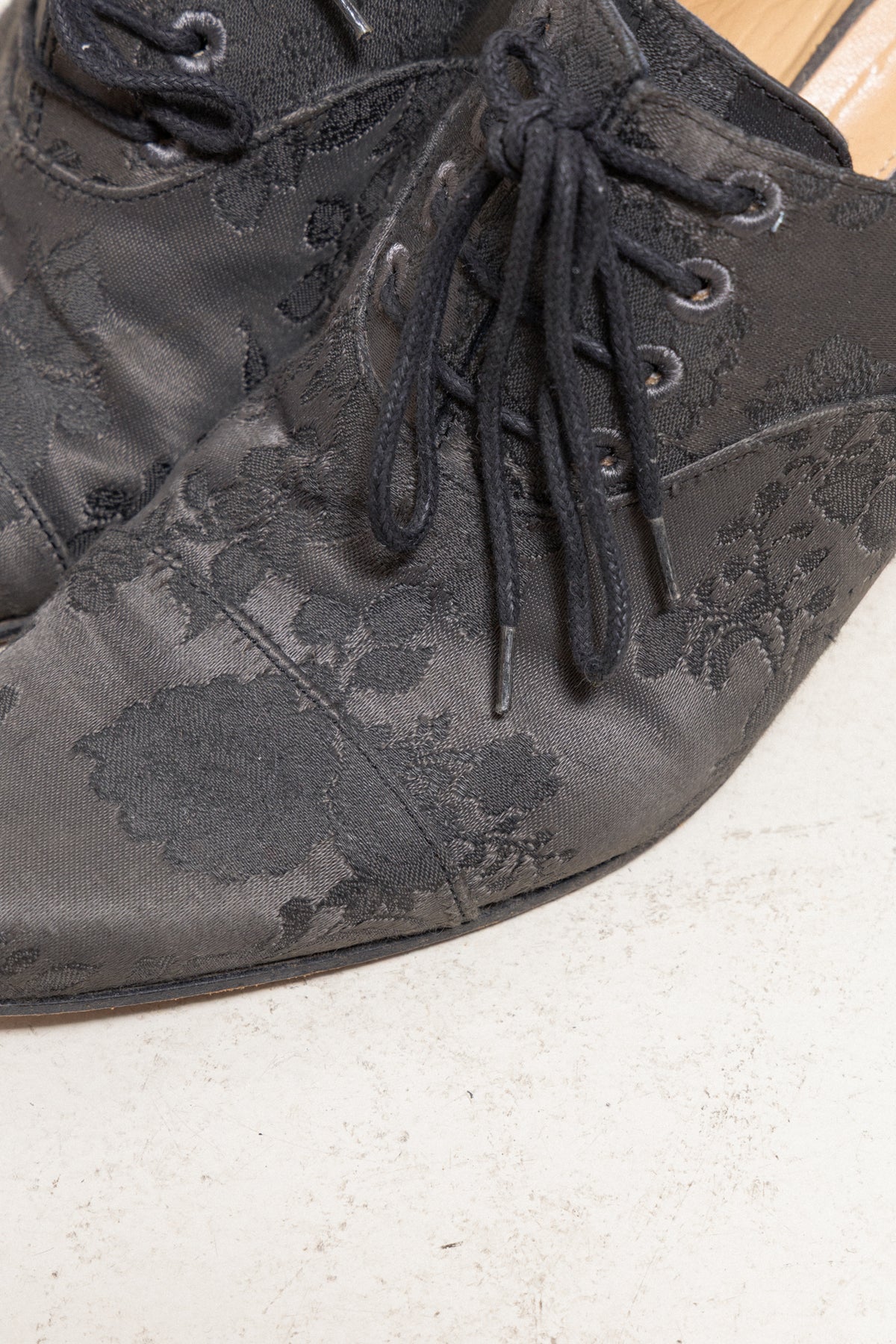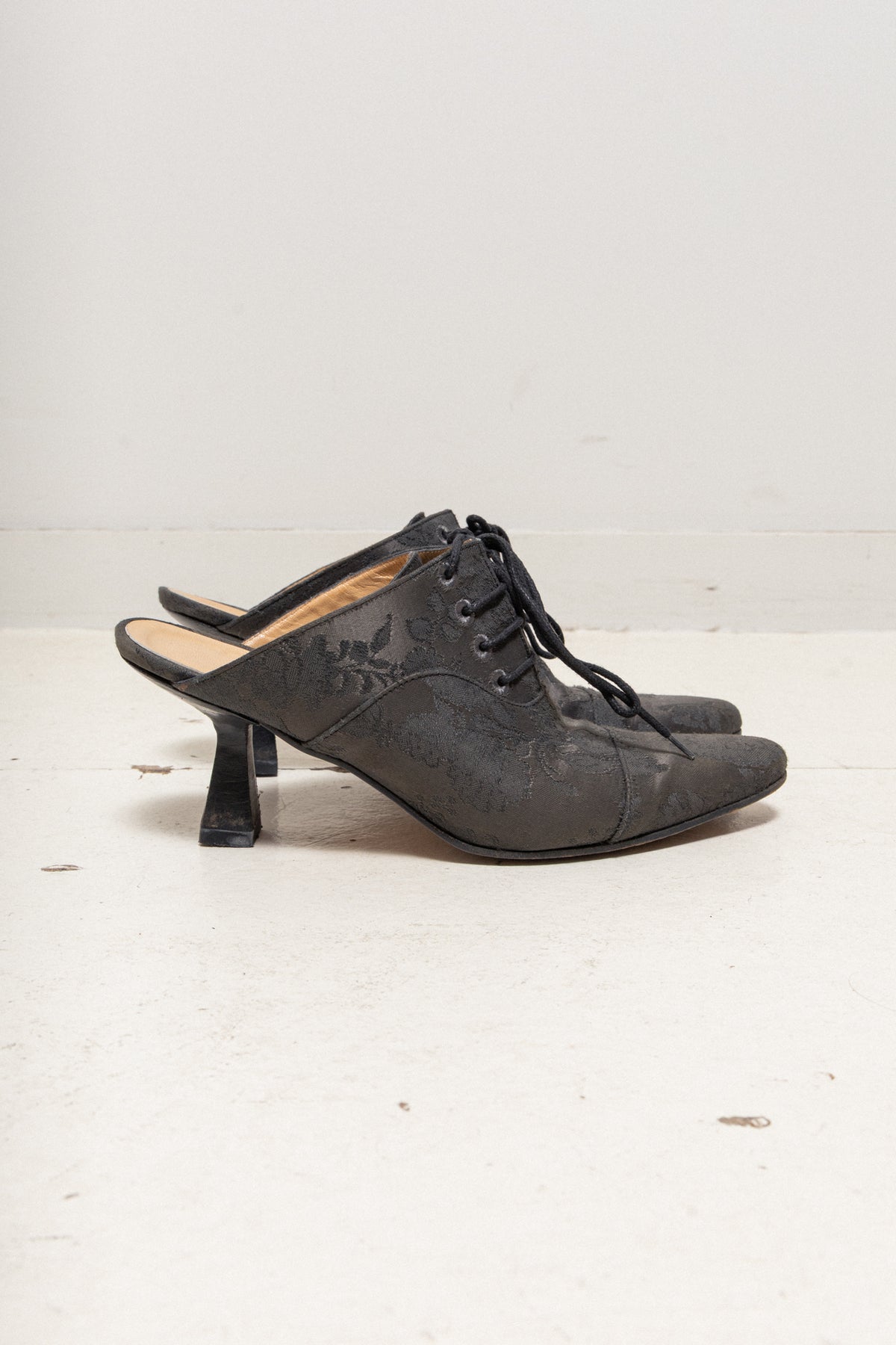 Incredible pair of mules made of a satin fabric with a matching tone floral pattern, featuring upper lacing and a curved inside wooden heel. Open back and very pointy toes.