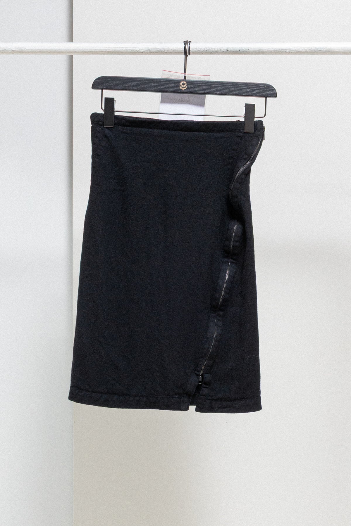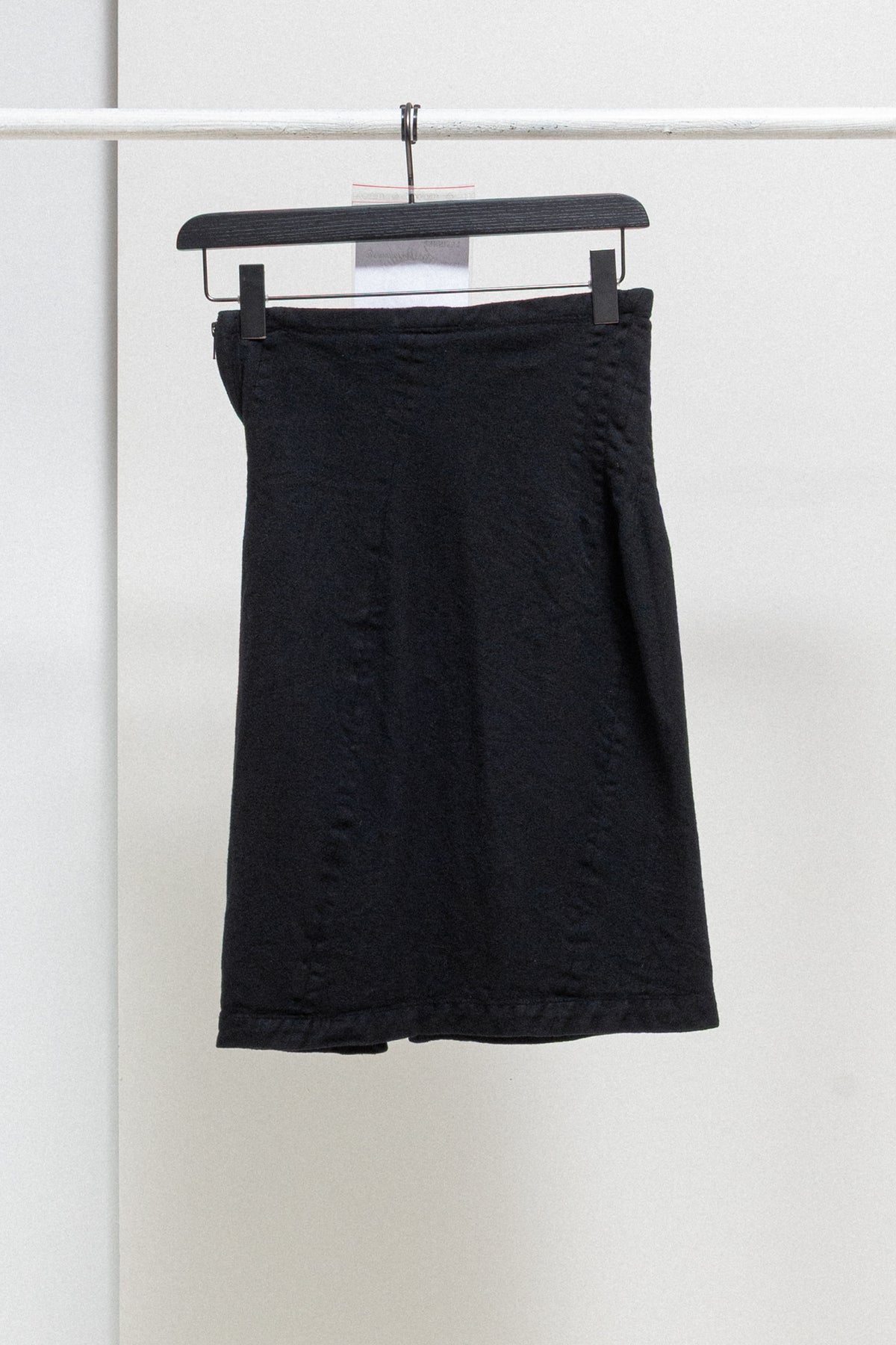 Amazing black straight skirt made of a soft wool fabric, featuring a side zipper that follow the length of the garment across. Side dart details. No lining and no pockets.