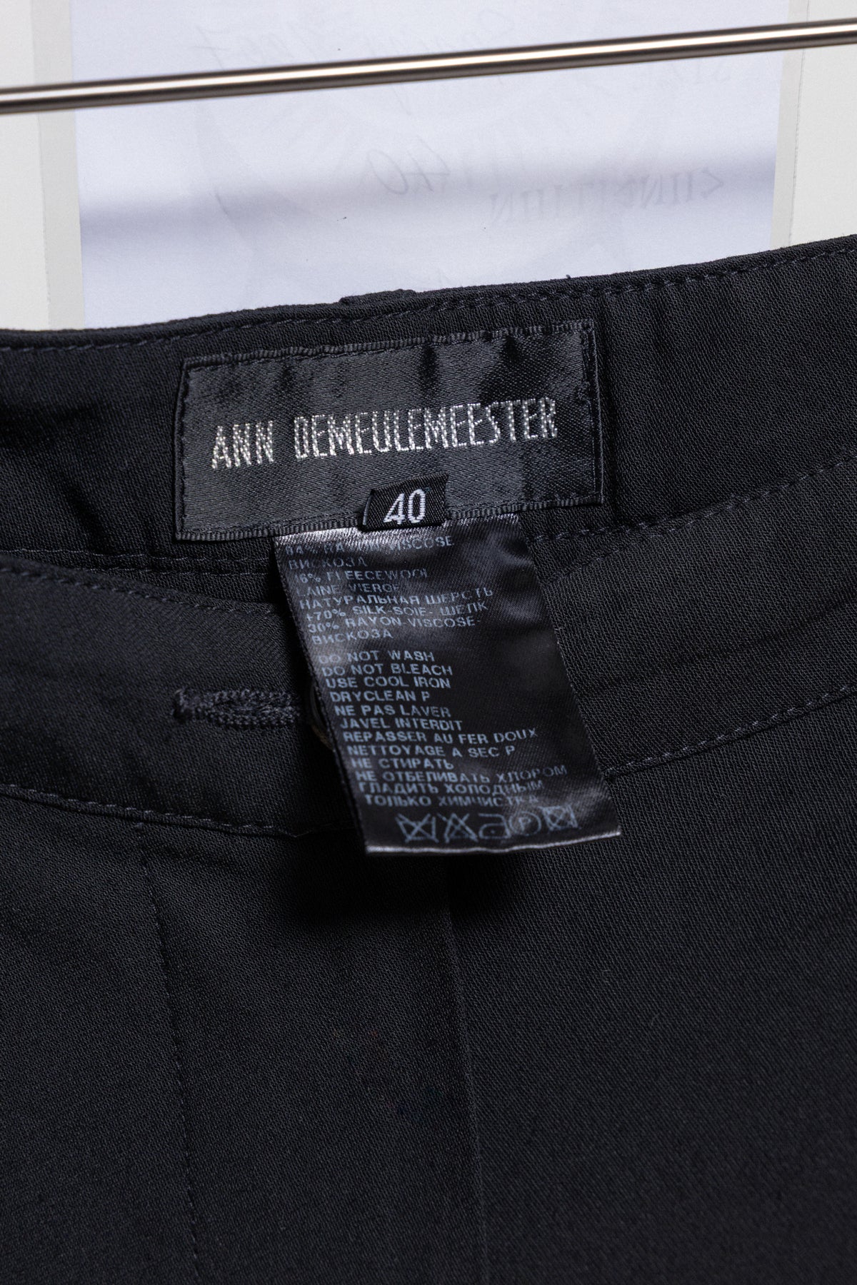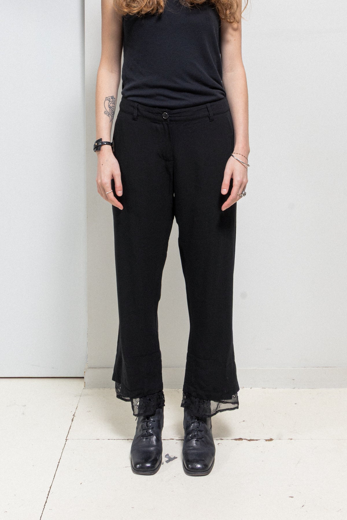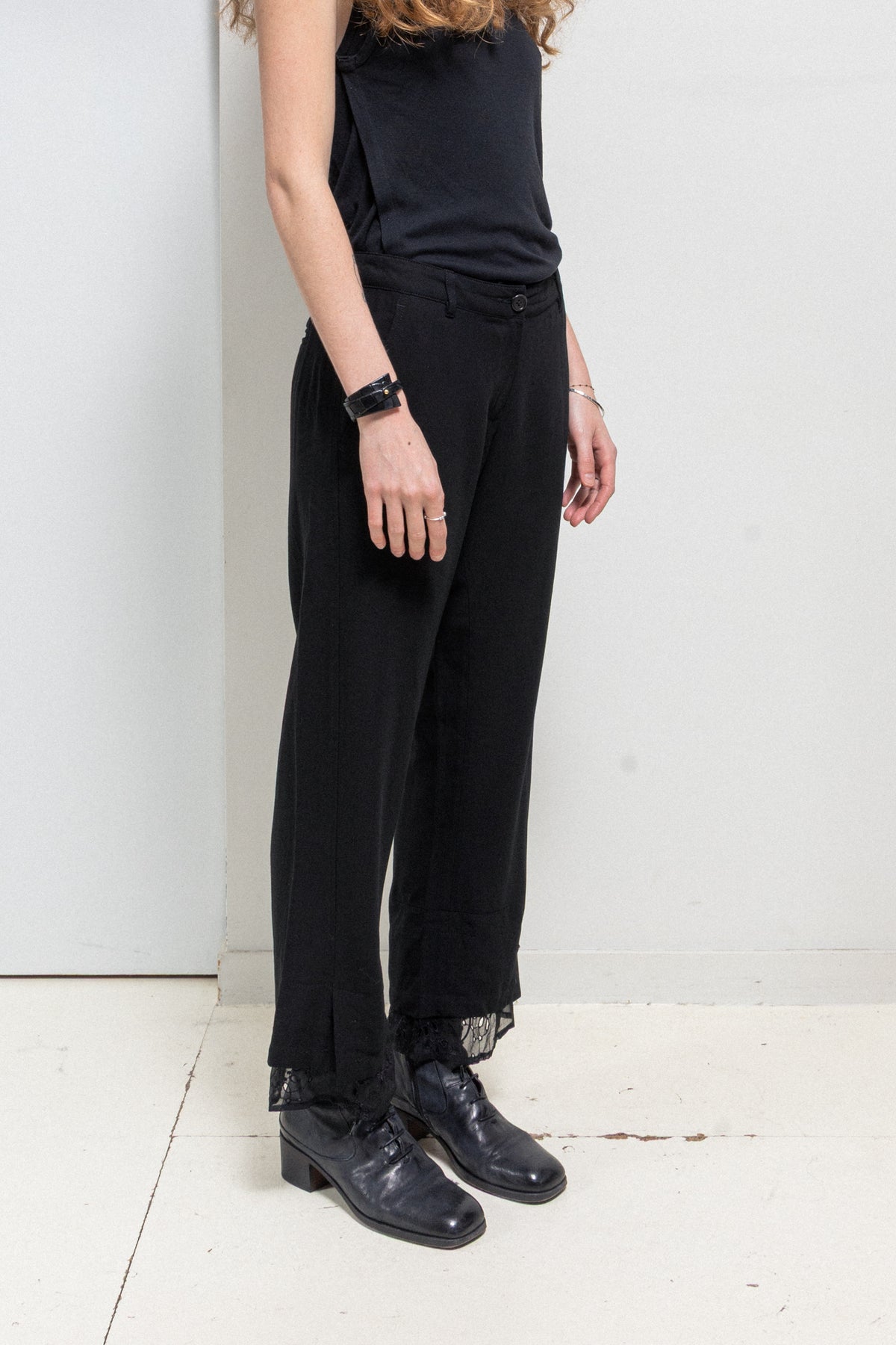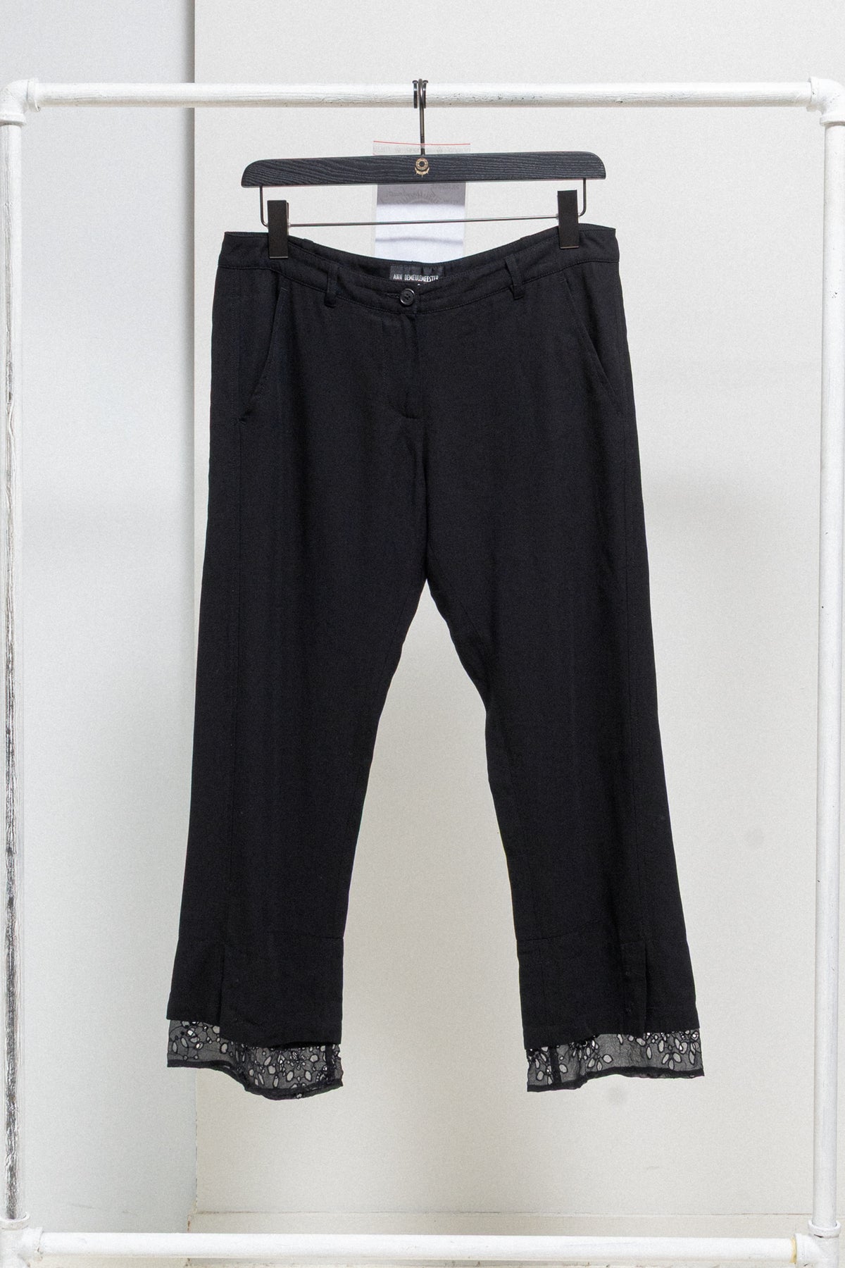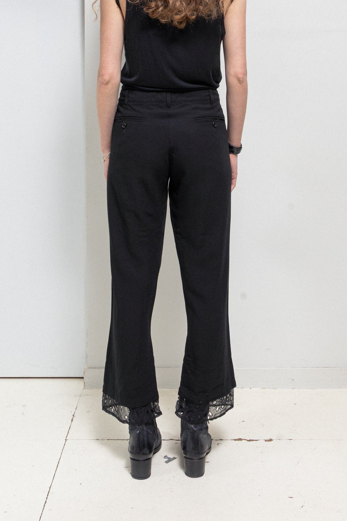 Incredible pair of pants made of a light blended wool fabric, featuring button up slits at the bottom of the legs that are layered with beautifully detailed lace hems. Front closure with a single button and a zipper. Belt loops. Front Italian pockets. Back darts and piped pockets with buttons.