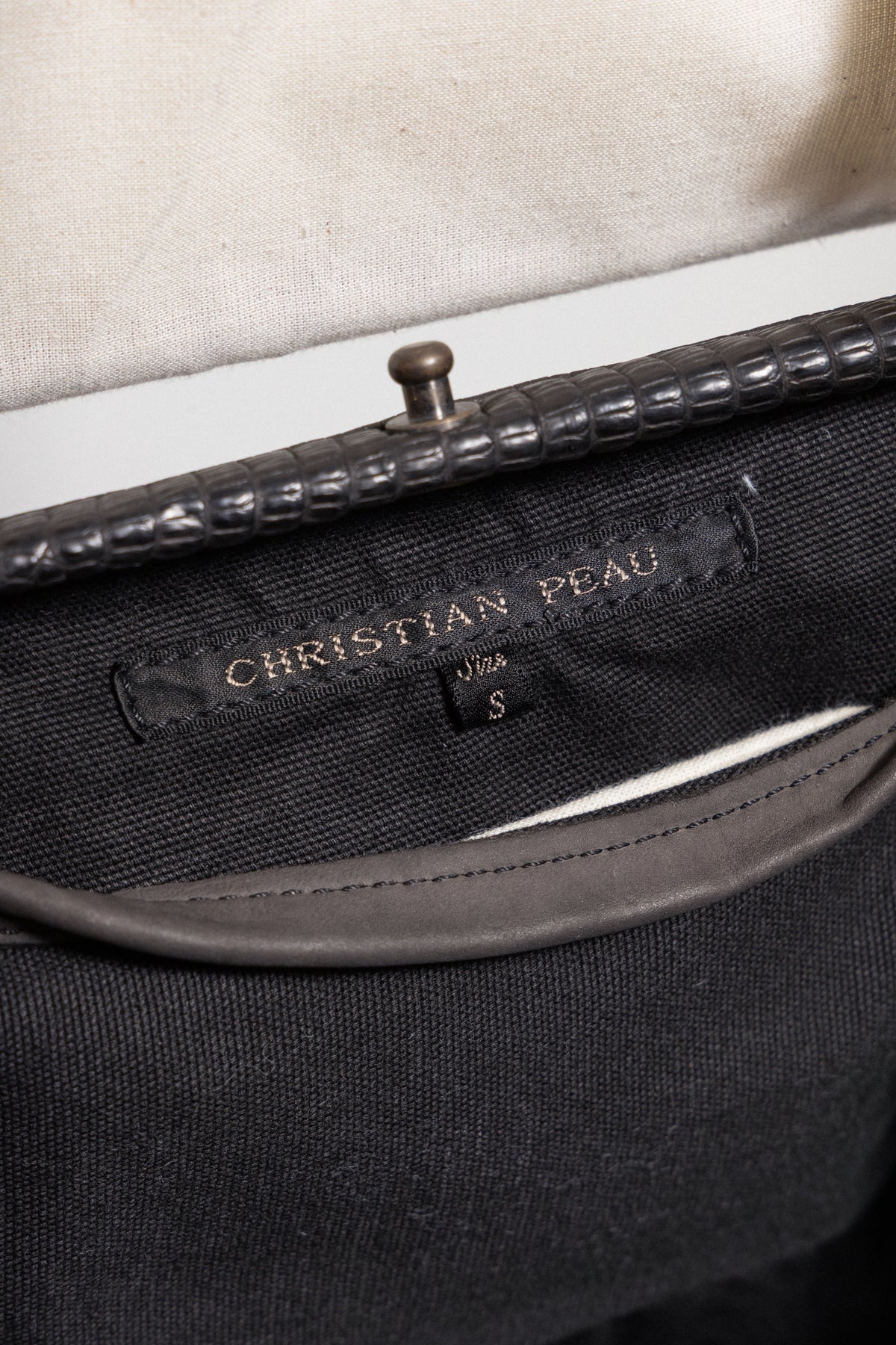 Sublime black purse style bag made of lizard skin, featuring two different sized handles ended by aged metal hardware.