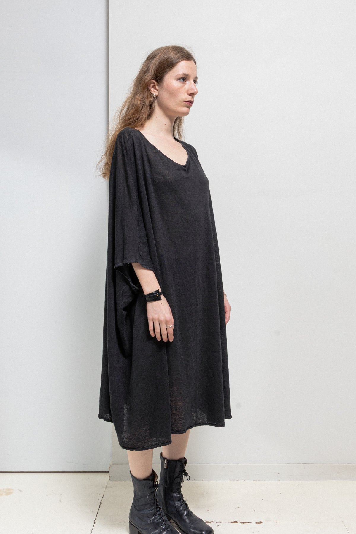 Amazing faded black tunic dress made of a light and slightly see-through linen fabric, featuring a round neckline and extra low armholes. Very wide shaped.