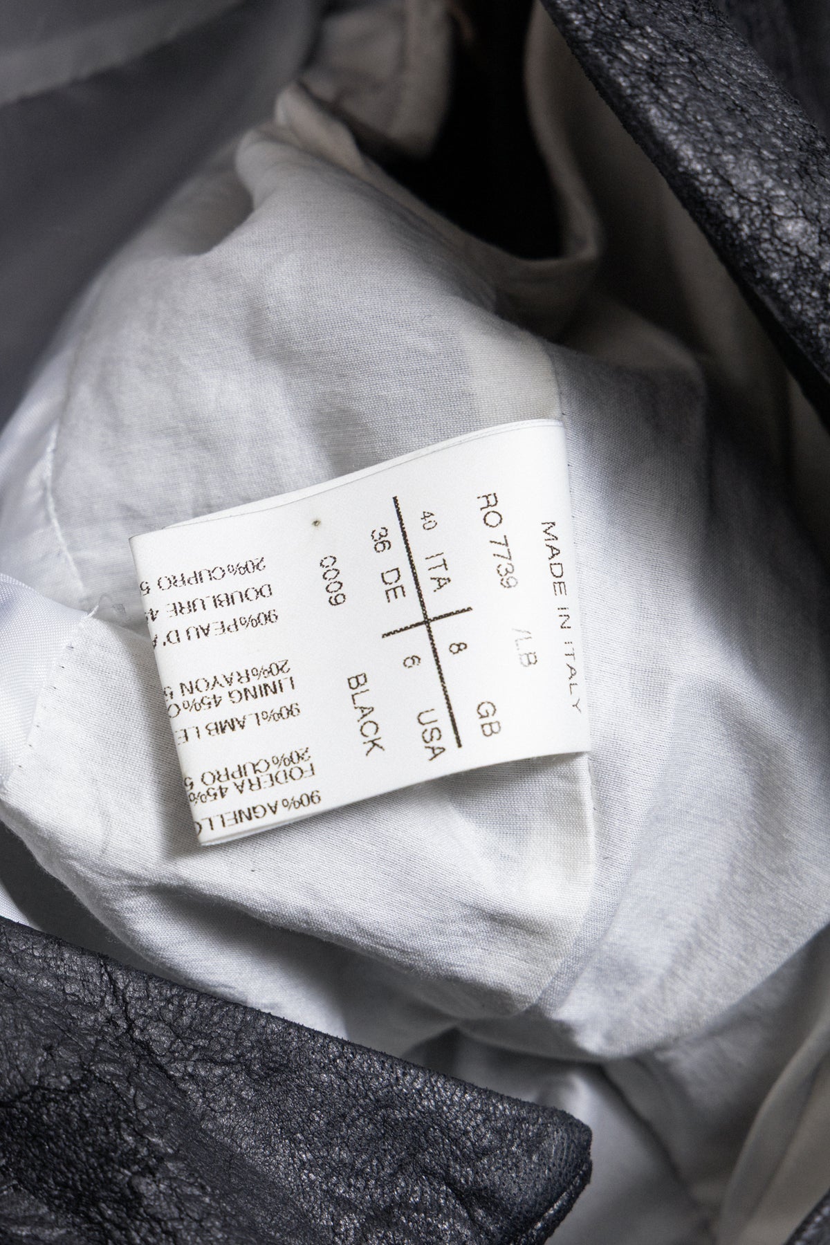 Amazing jacket made of a very textured and grainy blistered lamb leather, assembled in straps at front, creating a beautiful effect. Cropped cut with tight elongated sleeves featuring wool inner arms. Cinched waist with small straps at front to tie up, signature of the collection.