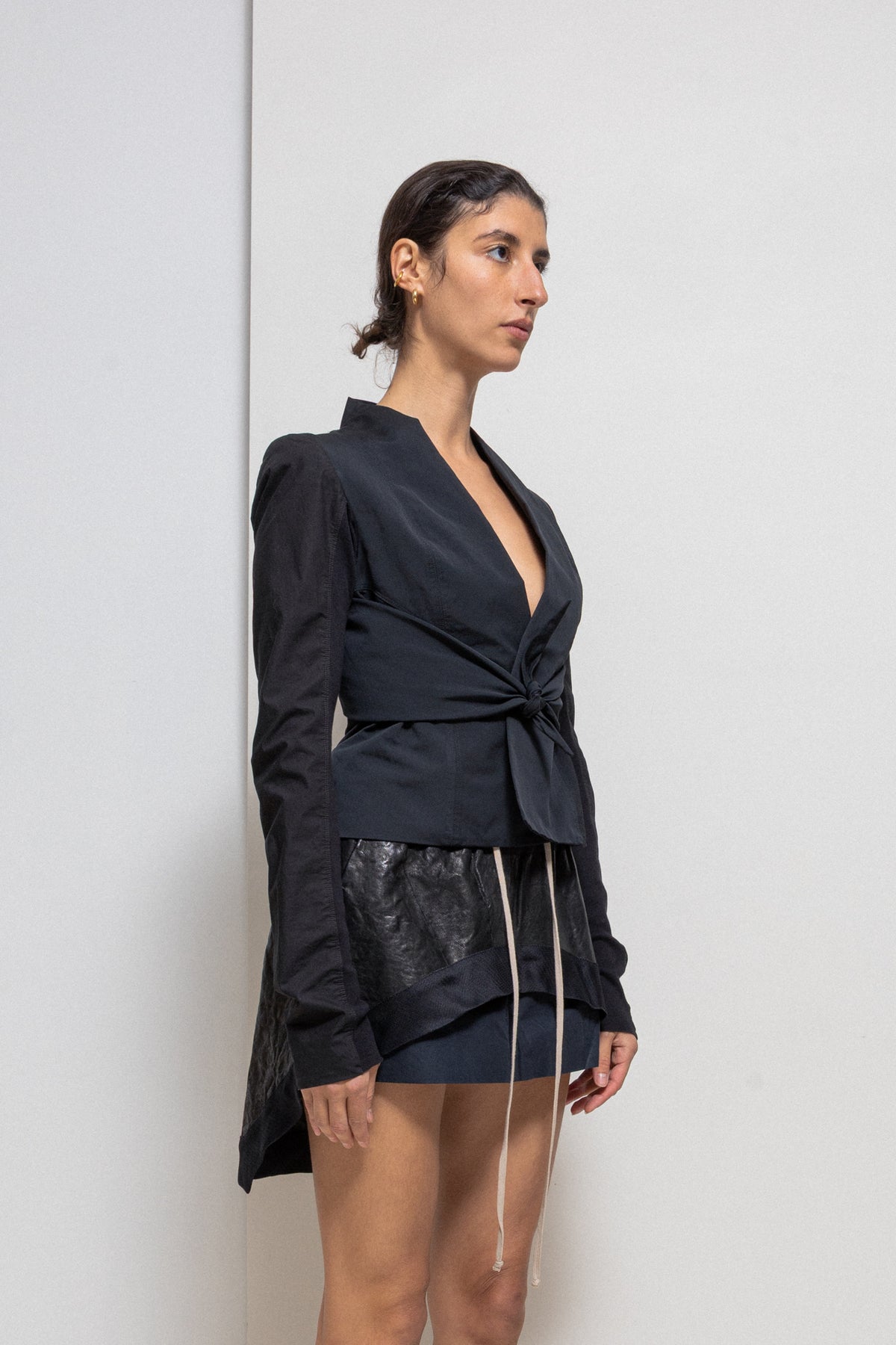 Incredible jacket made of a rigid textured cotton blend with a subtle sheen. Slim sculptural silhouette with an open front part and beautifully falling straight lapels, featuring long silky straps below the chest to tie up at front, creating a slightly flared bottom. Front darts accentuating the waist. Elongated tight sleeves with ribbed wool inner arms.