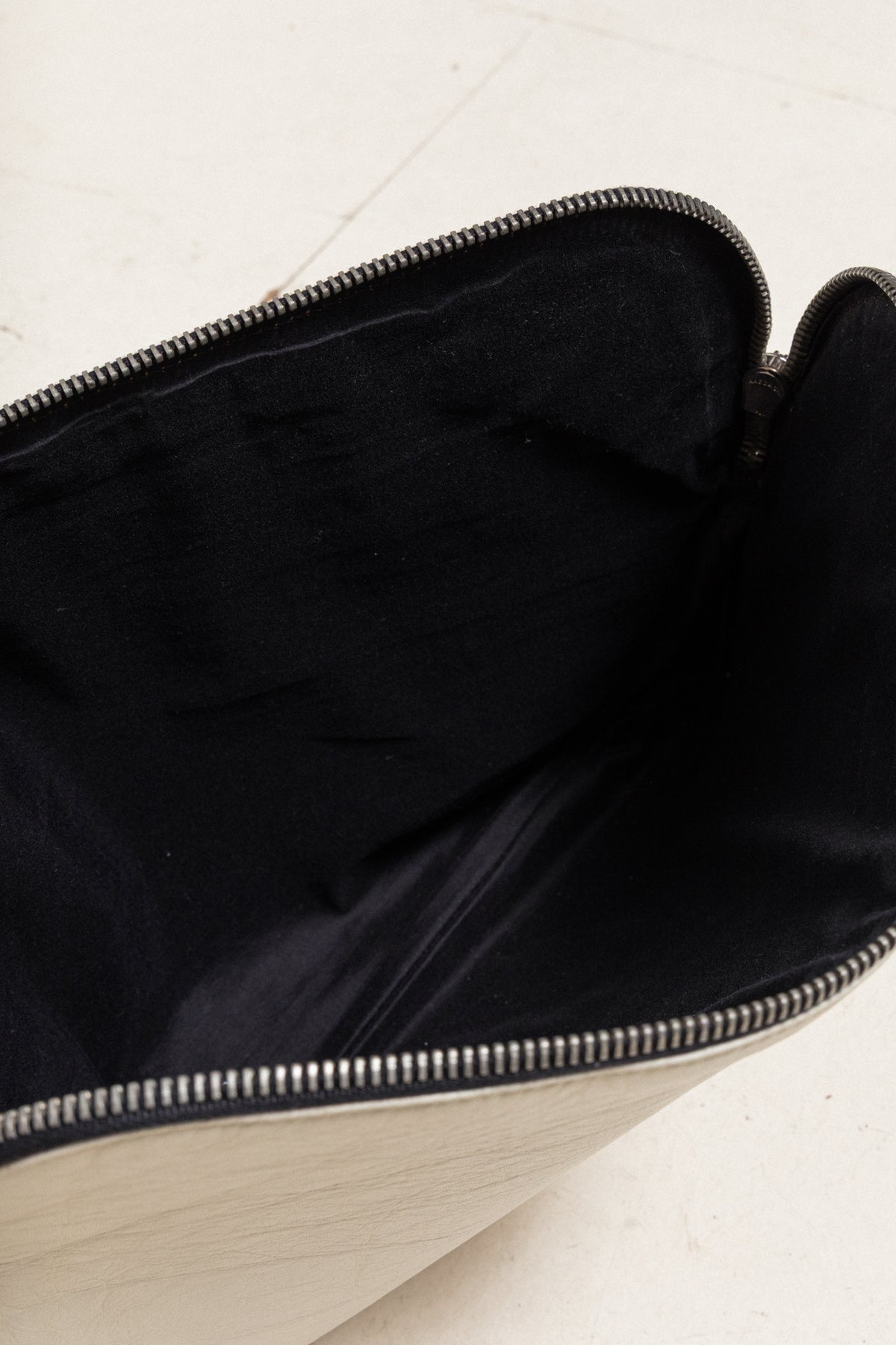 Nice computer case made of a soft calf leather with a padded texture, in a milk color. Features rounded corners and thick zippers. Can be used as a bag or storage pouch.