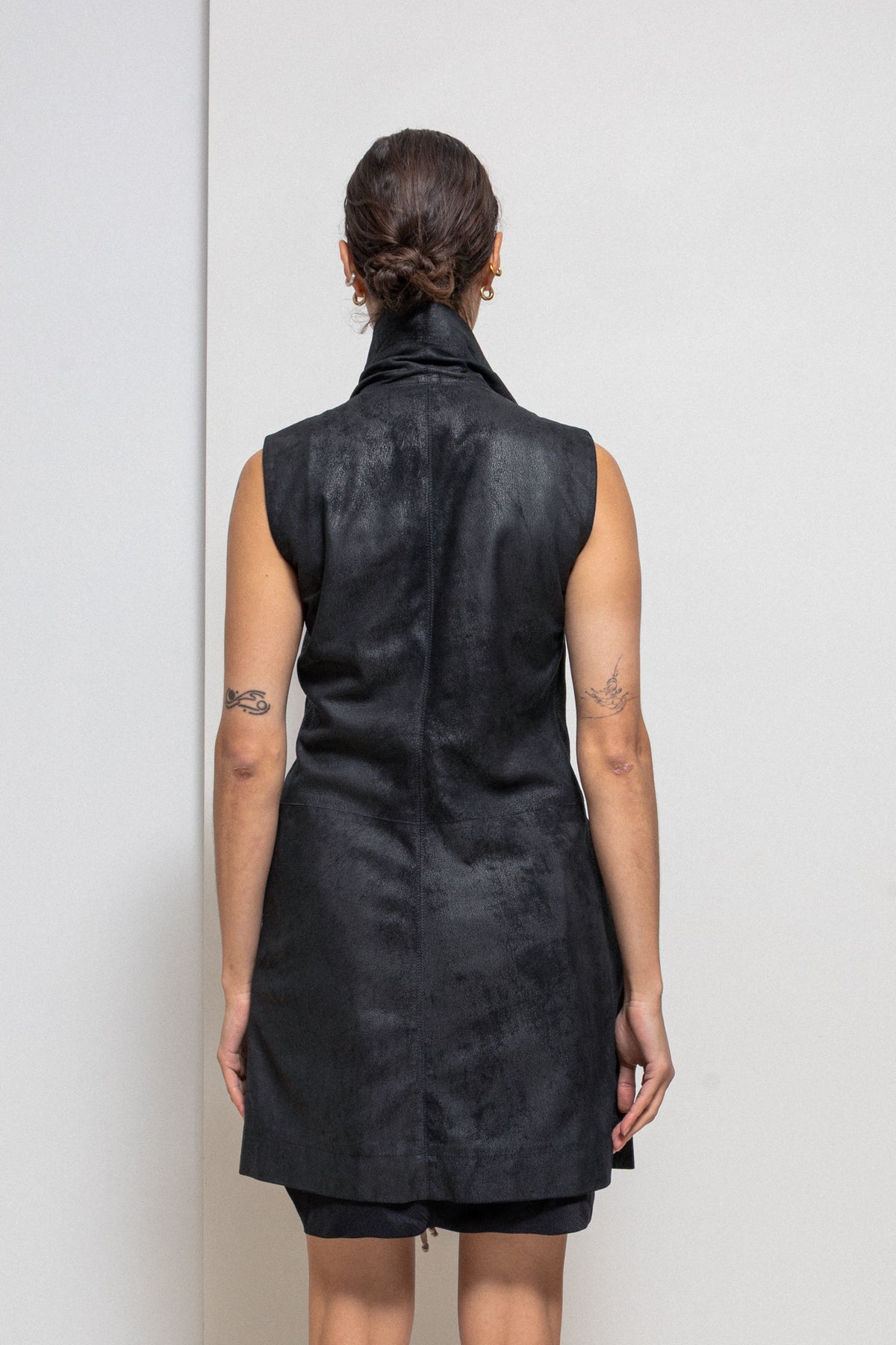 Beautiful sleeveless jacket made of a thin and supple blistered lamb leather, featuring a high neck and front zipper closure. Elongated cut with side slits and pockets.