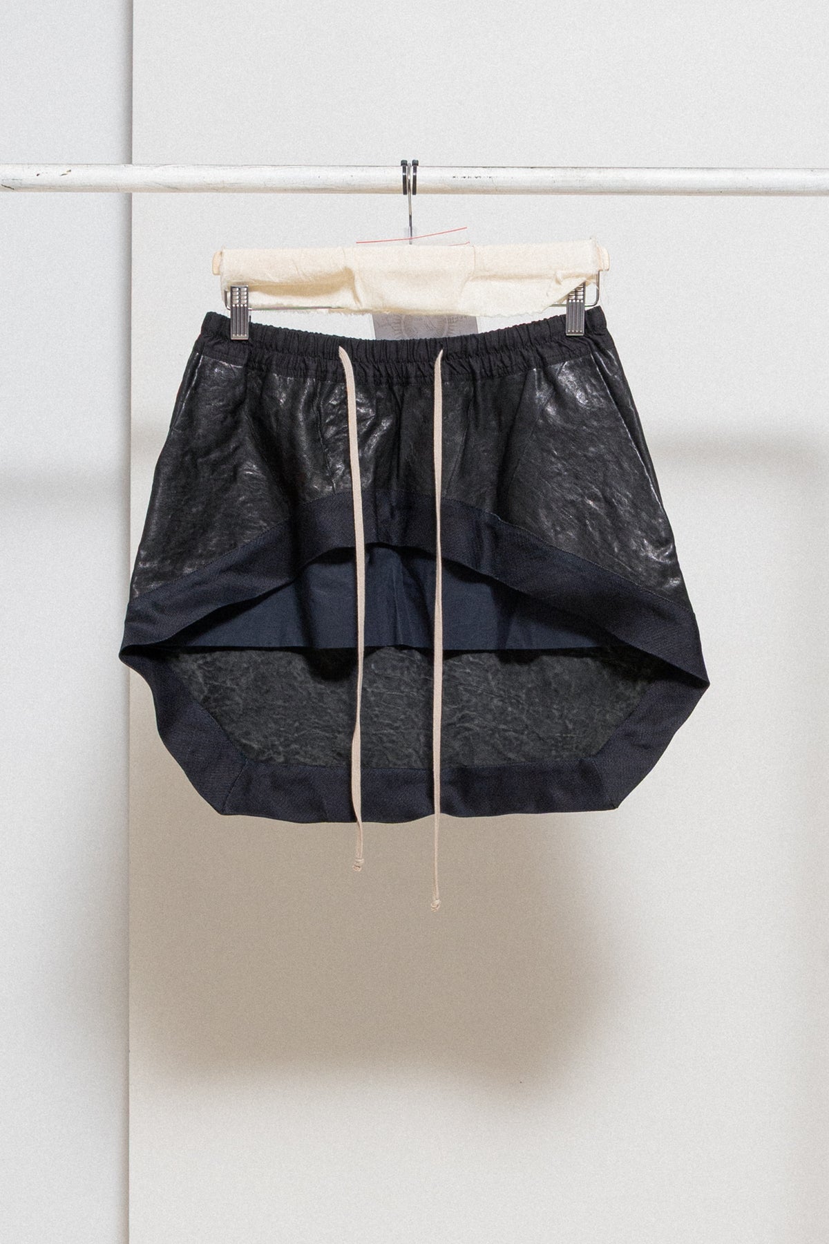 Beautiful mini skirt made of a textured lamb leather with a nice sheen, featuring an underneath blue cotton panel. Longer back cut in a geommetrical shape. Signature drawstrings, elastic waistband.