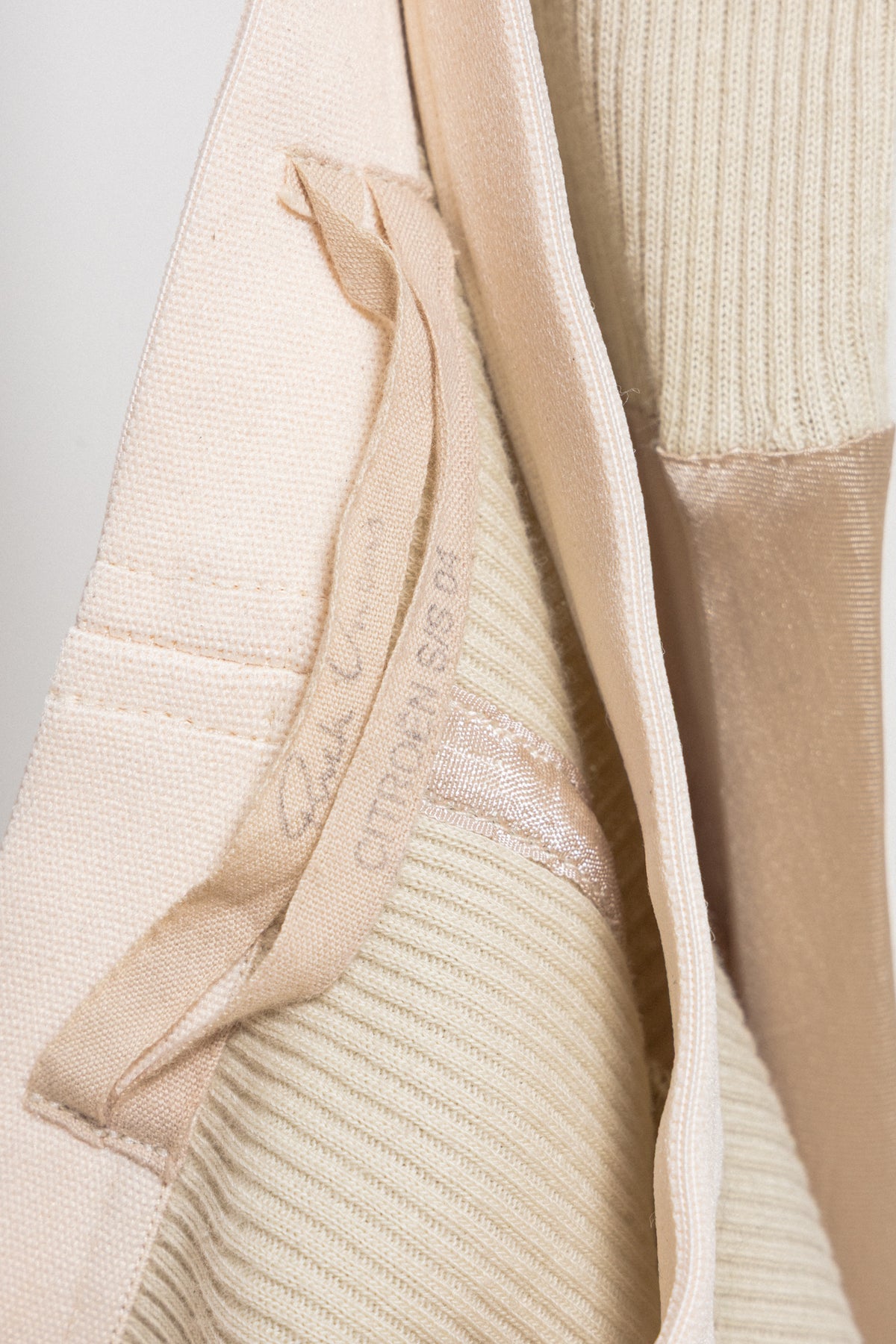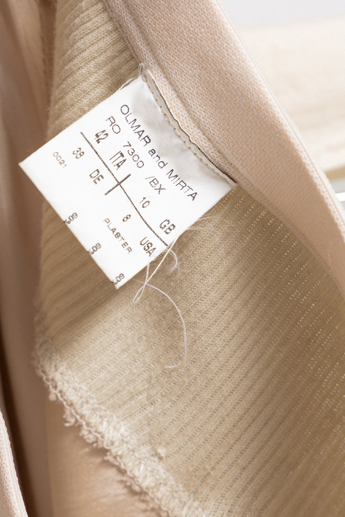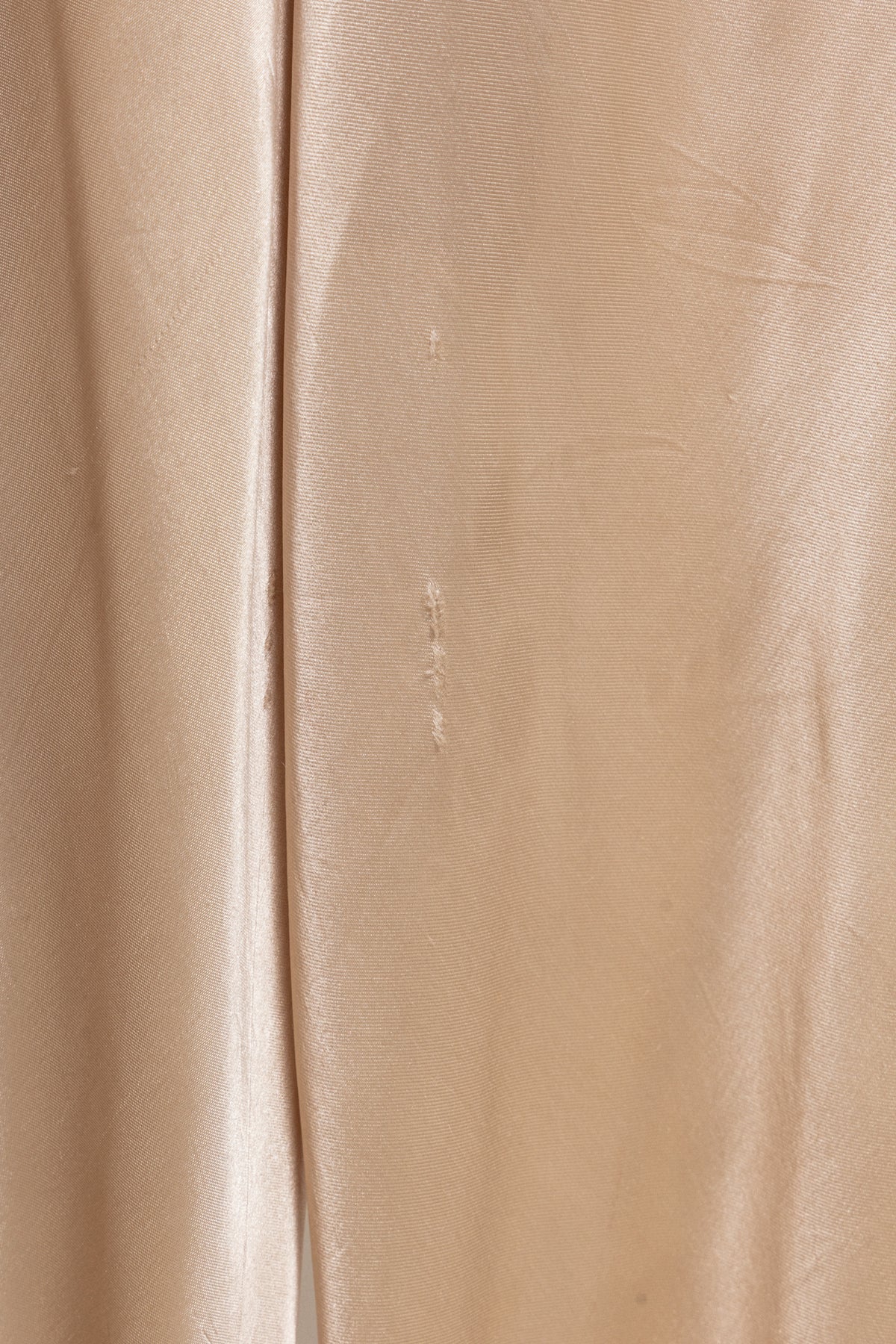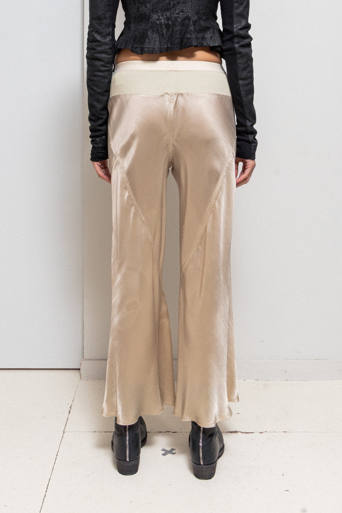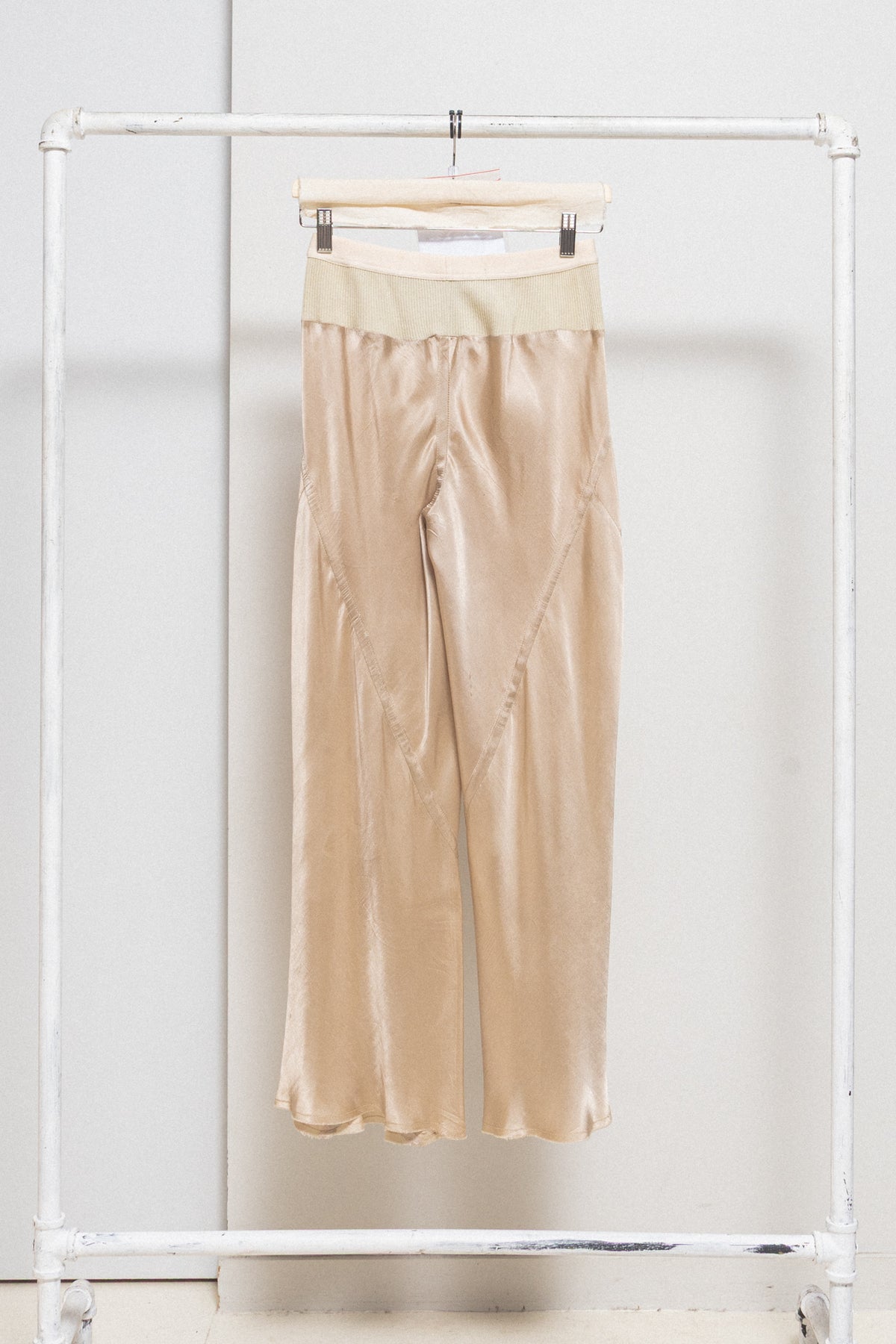 Beautiful pair of pants made of a very shiny and lightweight satin like fabric in a nice champagne color. Features a large, elastic ribbed wool waistband. Wide cut with bias seams details.