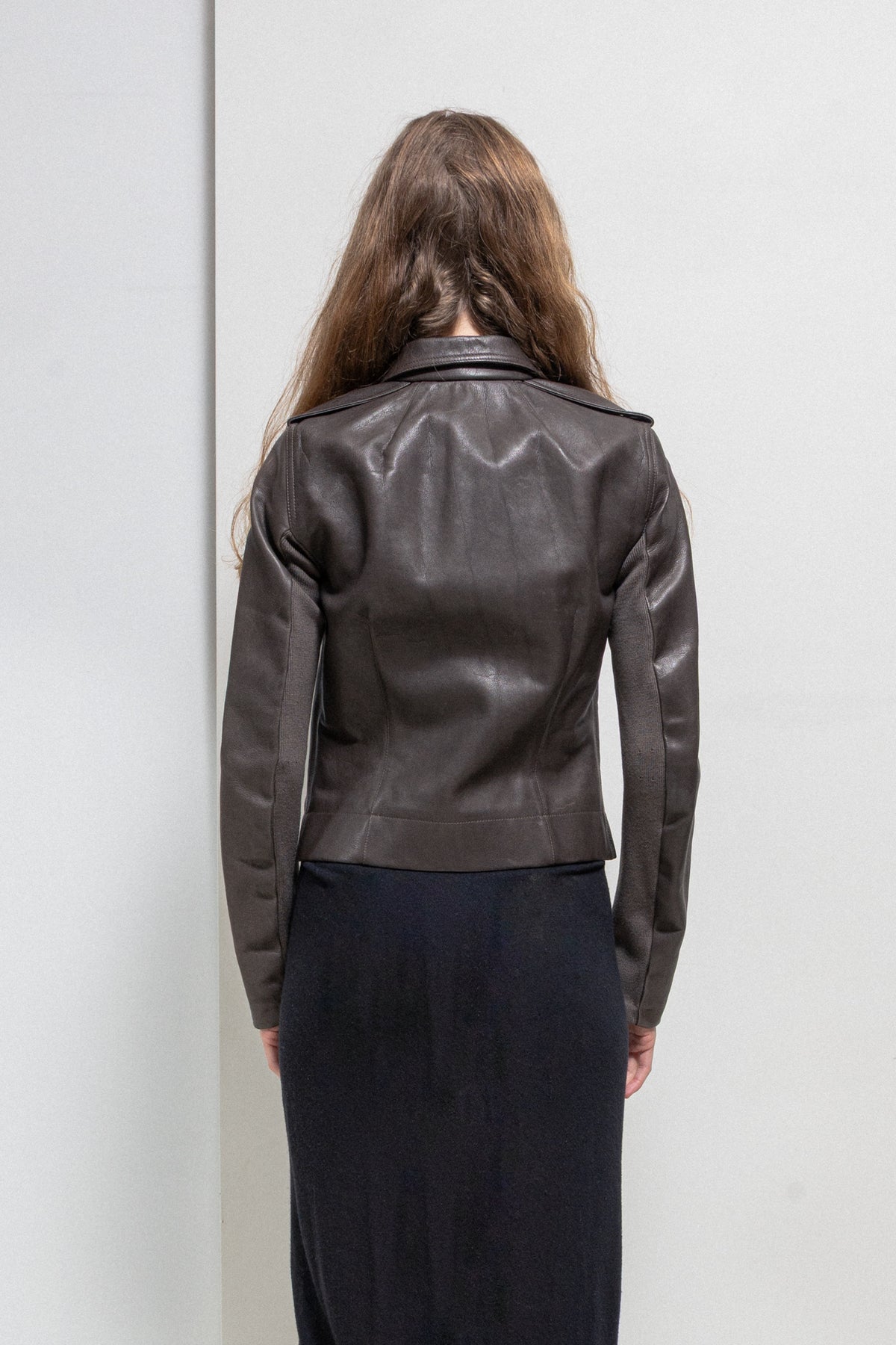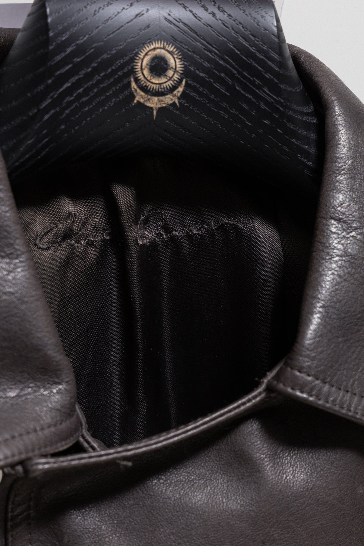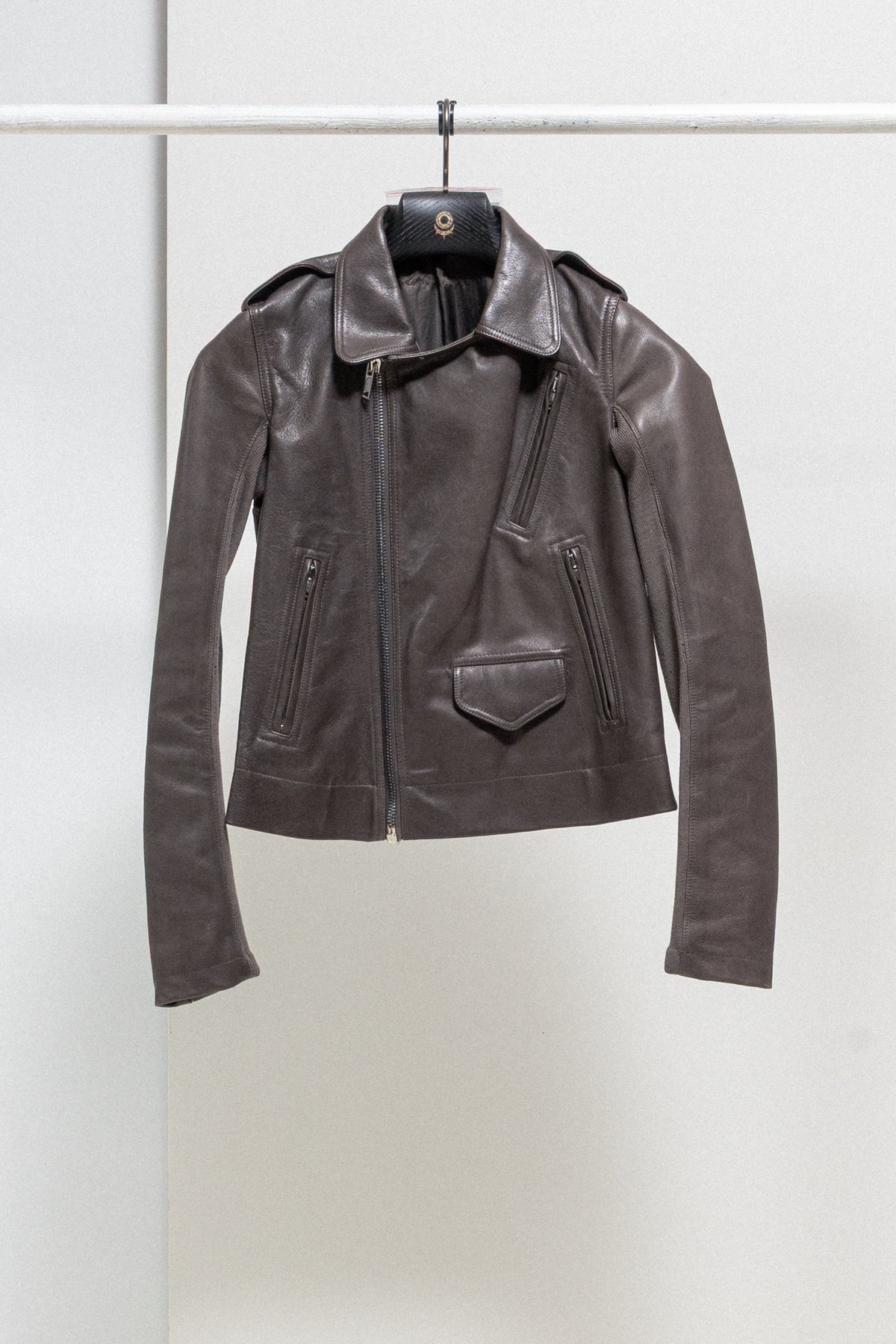 Amazing dark dust jacket made of thick calf leather, featuring a crossing front zipper closure revealing imposing lapels when opened in half as well as some contrasting signature ribbed undersleeves panels. Front numerous pockets including three zip up and a single piped with a flap. Shoulder plackets. Back neck darts. Dark dust lining with pockets on the inside.
