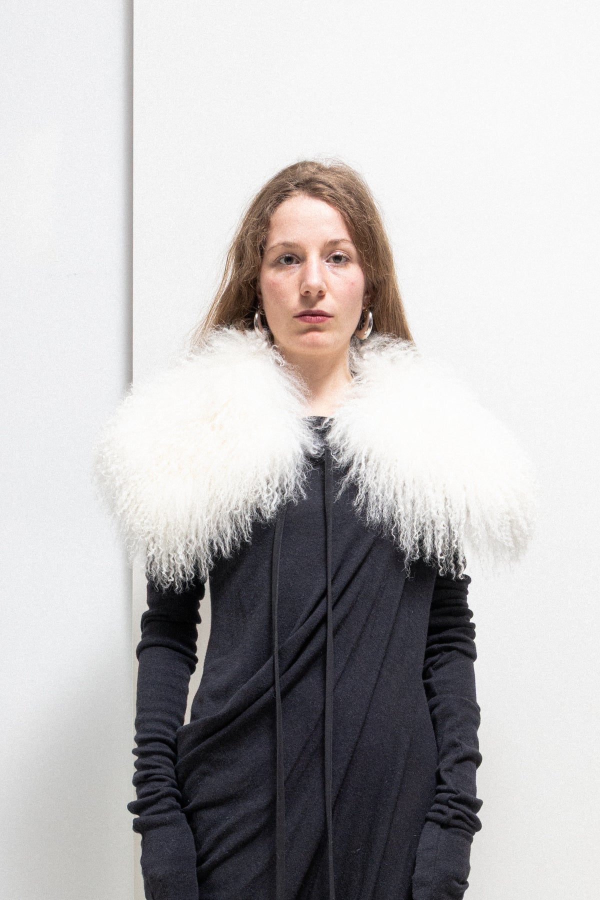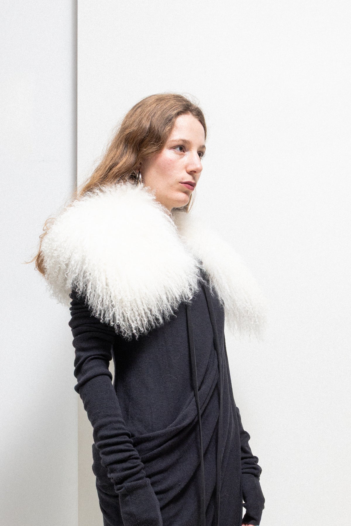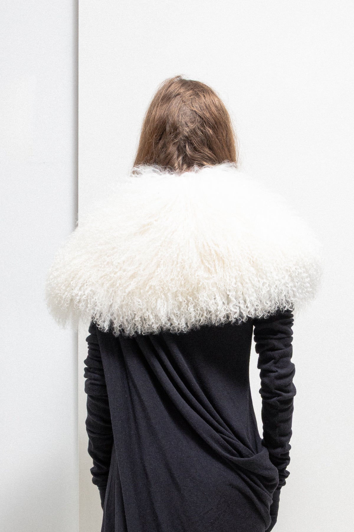Amazing collar made of a very soft, fluffy and voluminous Mongolian lamb fur, featuring straps to tie it in many different ways, even as a belt. Durable Alcantara lining.