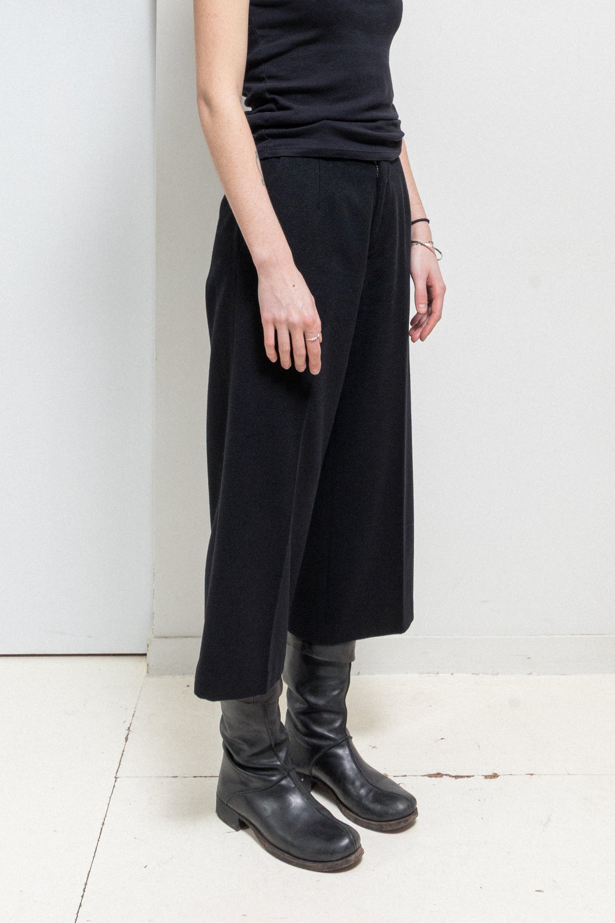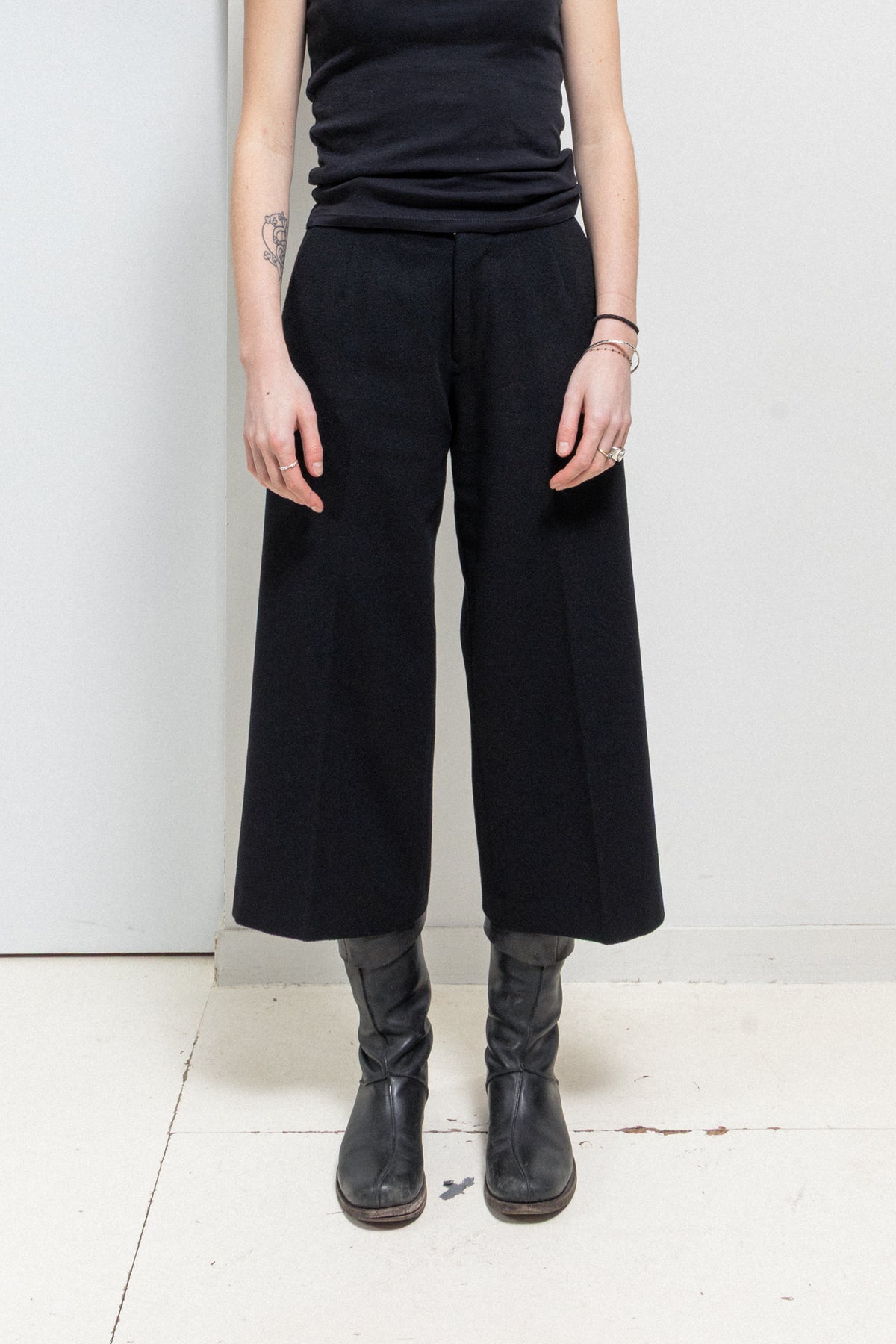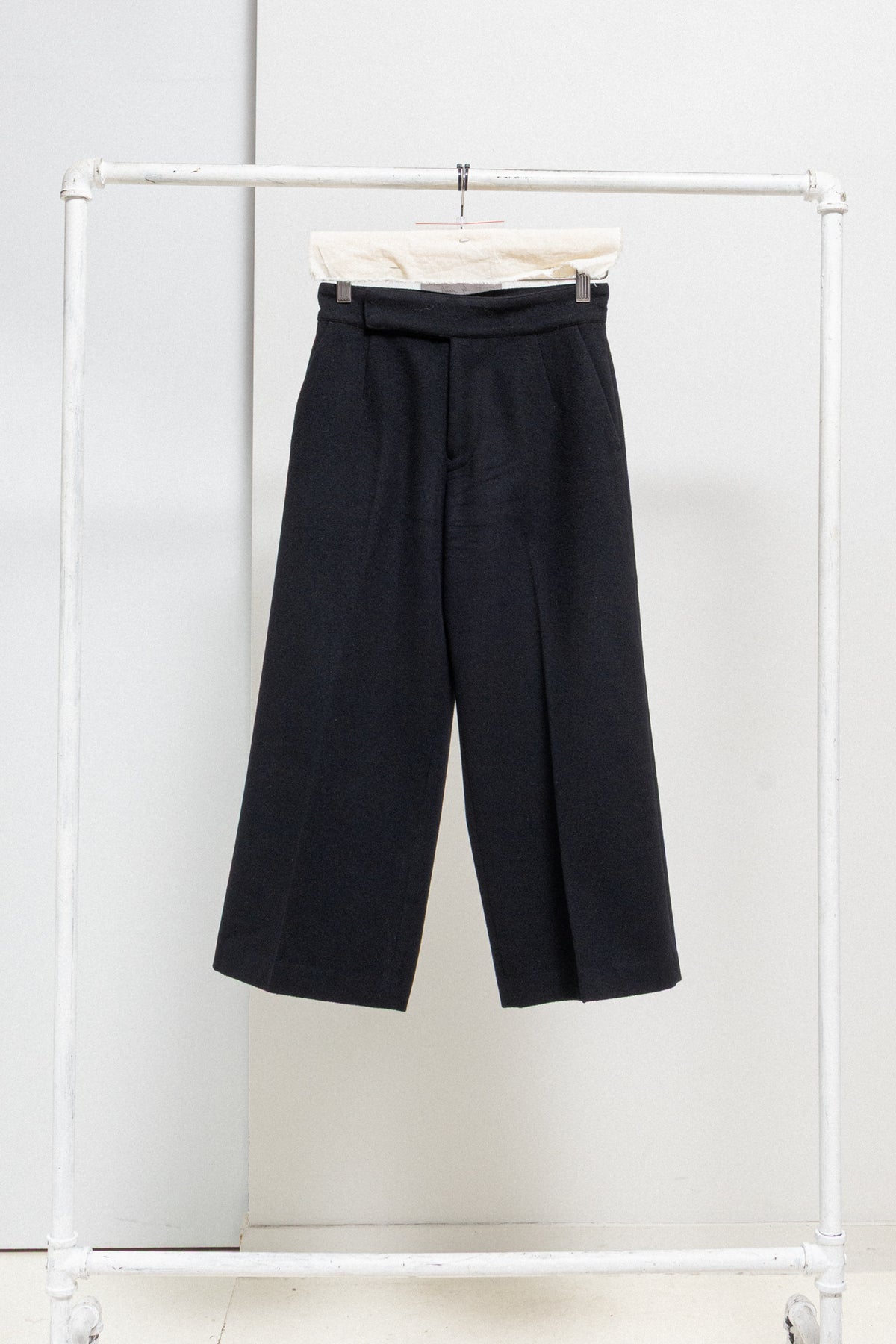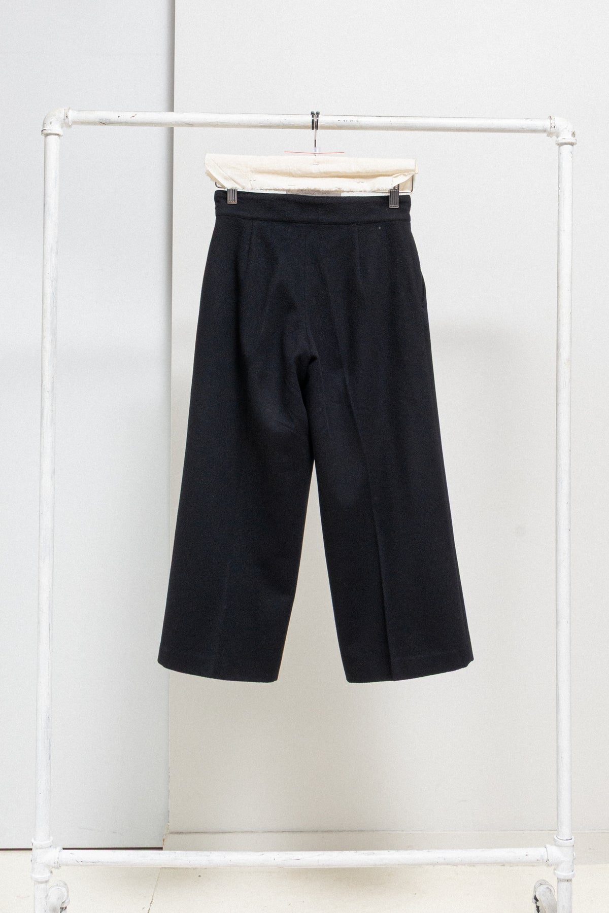 Fantastic pair of pleated pants made of thick and soft wool blended with cashmere, featuring wide legs and a front closure with a metal zipper, a single button and a staple at the end of the crossing belt. Back and front darts. Front pockets. Black lining.