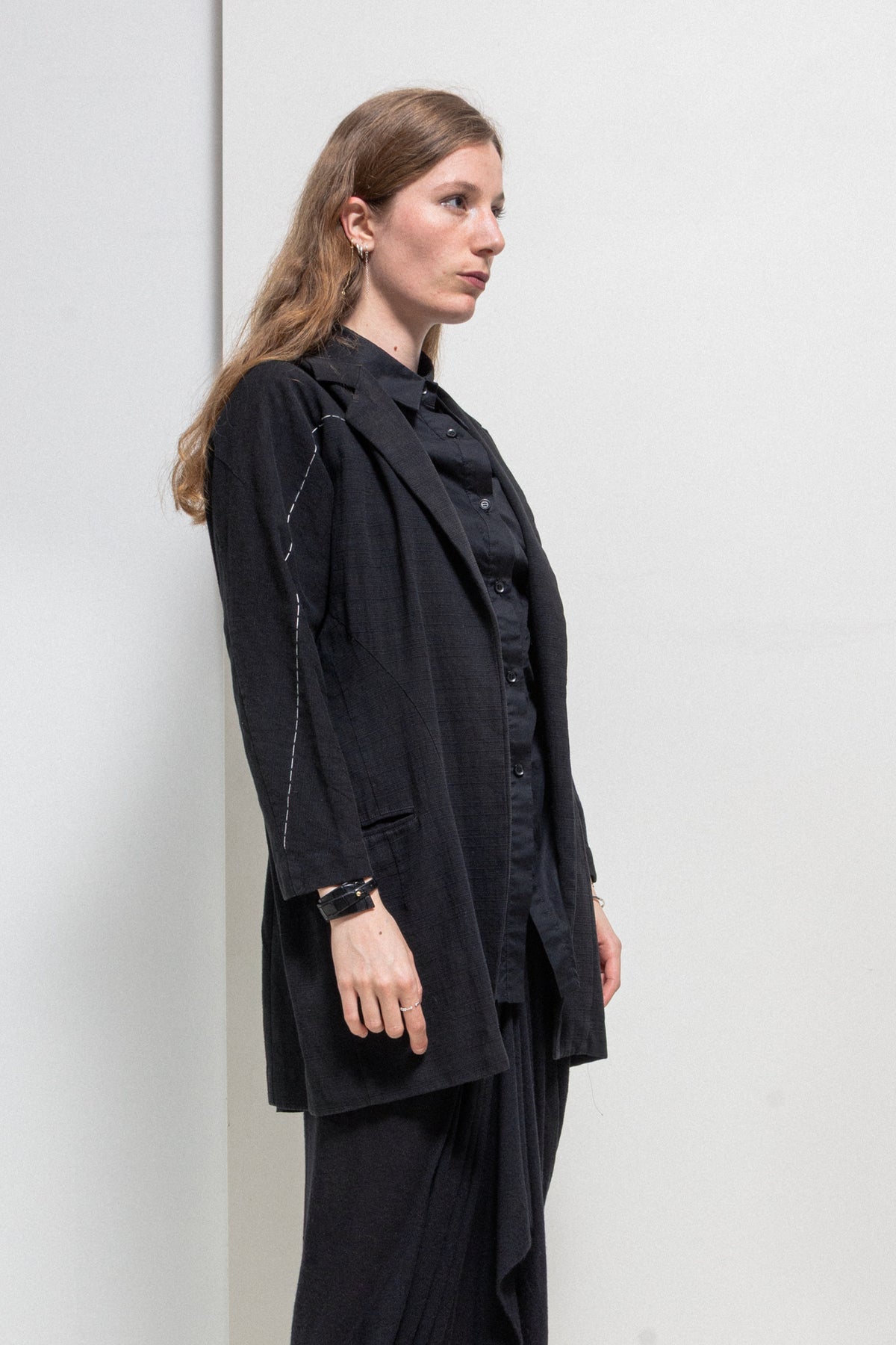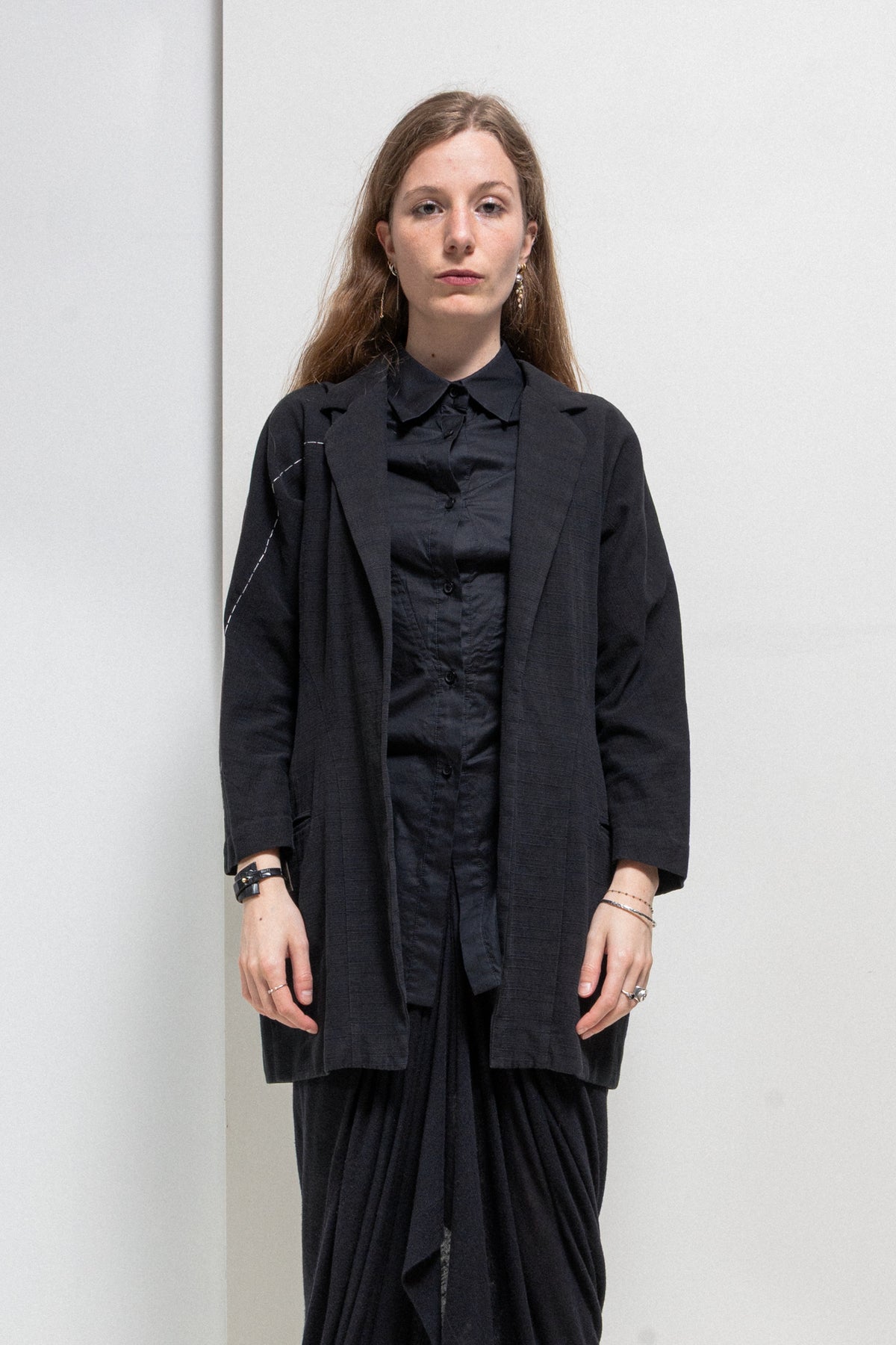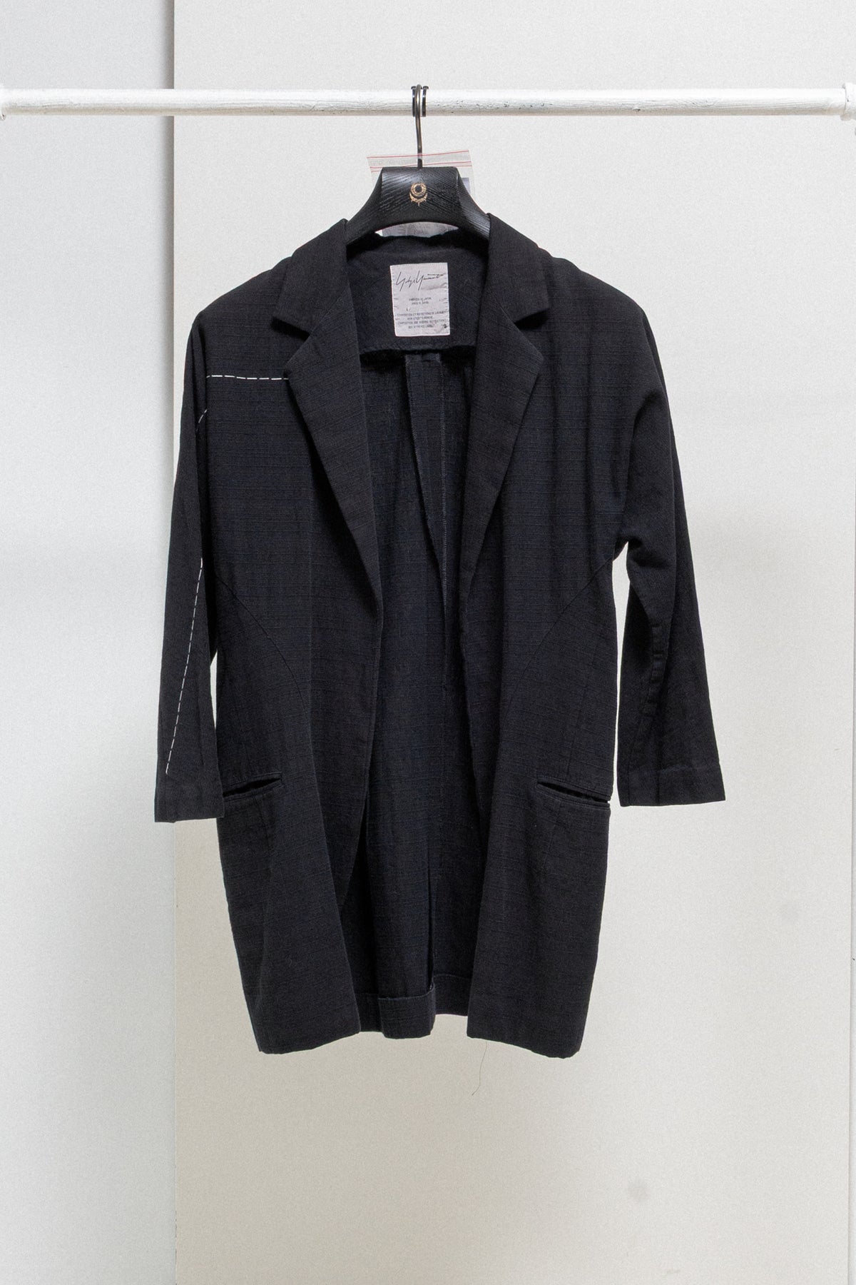 Beautiful jacket made of soft and textured cotton fabric, featuring a traditional tailor collar and lapels mixed with inspired kimono sleeves. Front and back darts. Contrasting hand stitched white sashiko thread going along the right arm in a straight line. Front piped pockets. No closure and no lining.