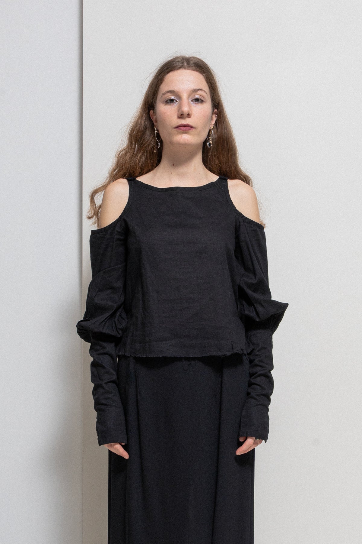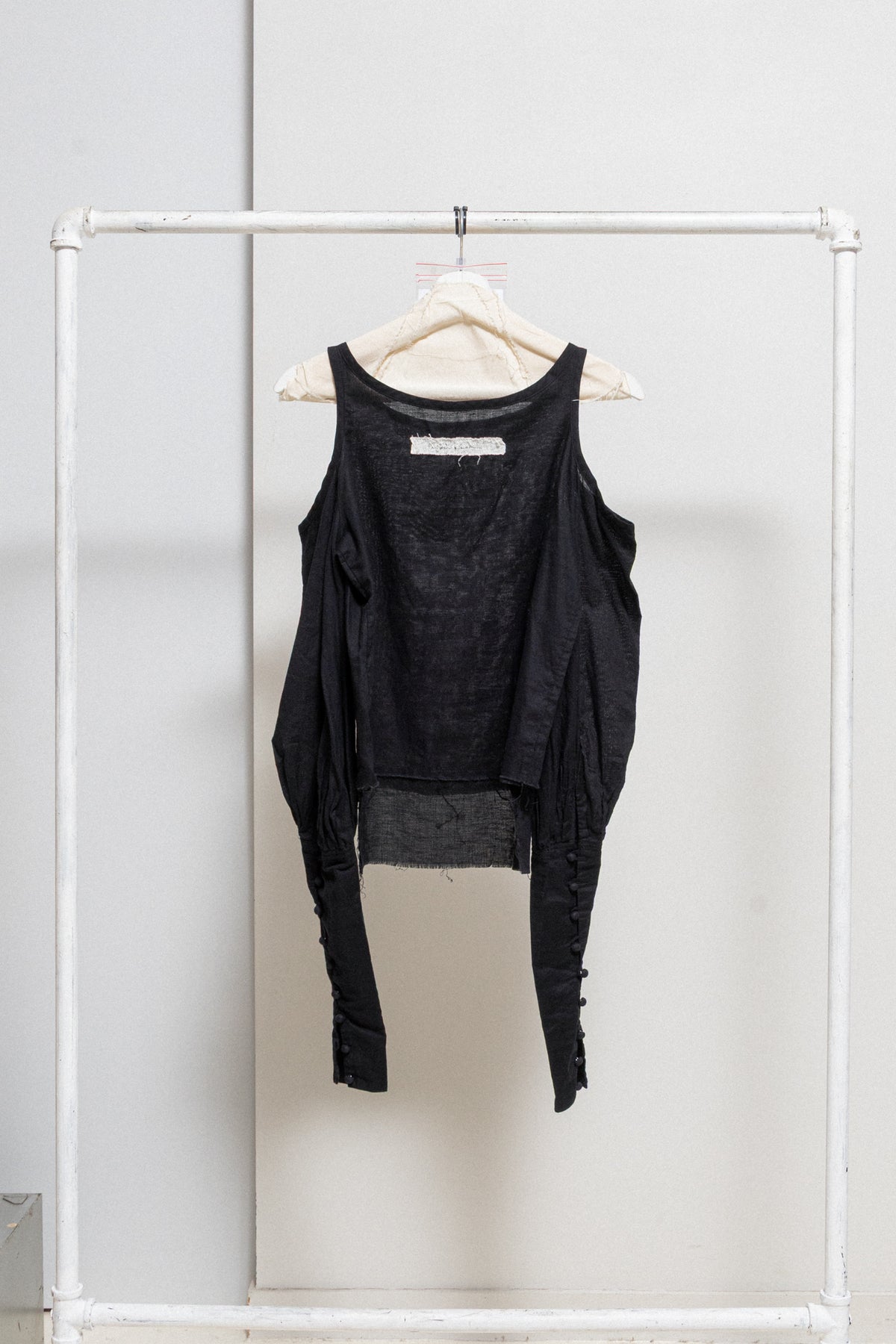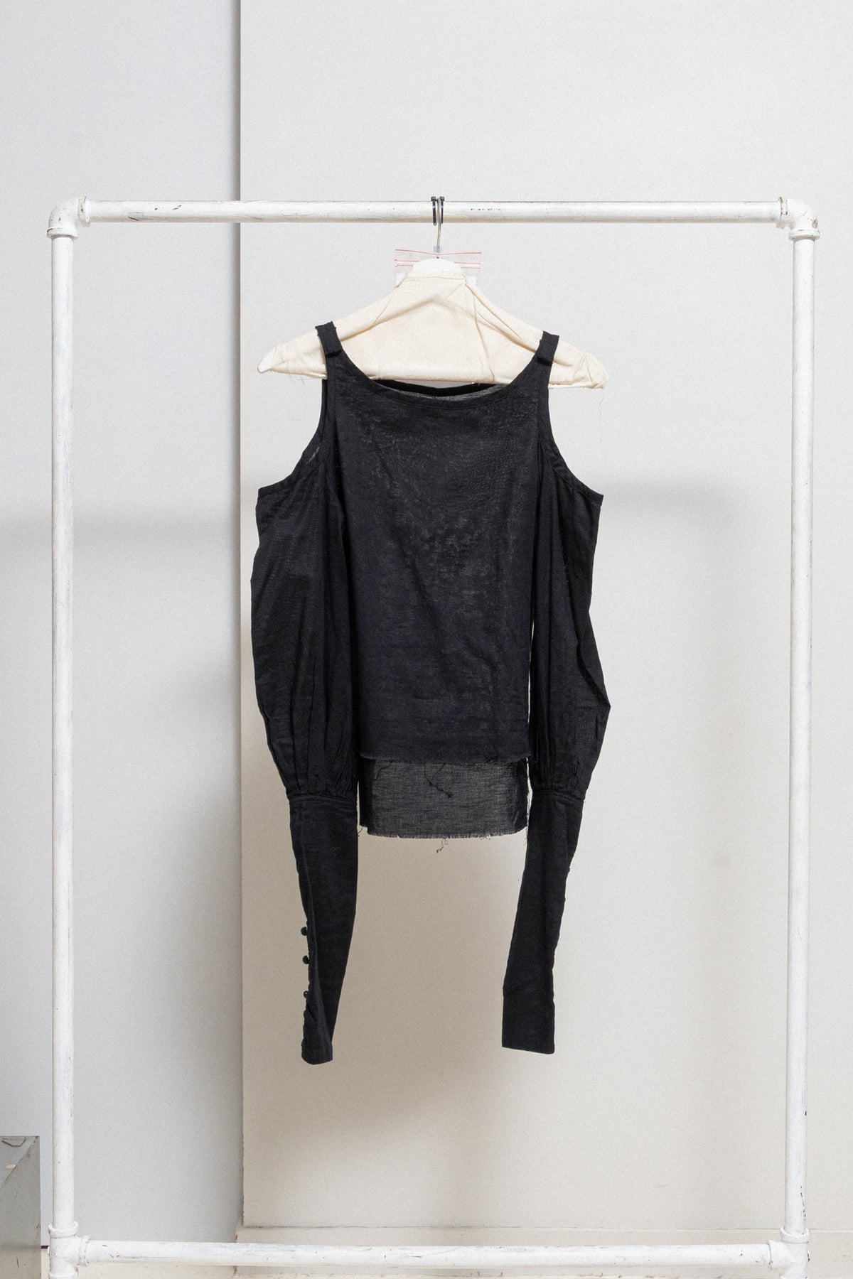 Incredible shirt made of a lightweight and soft cotton gauze fabric, featuring open shoulders and extra long sleeves with pleats and slits accessorised with nine buttons wrapped in fabric. Cropped front, a scoop neckline and frayed bottom edges.