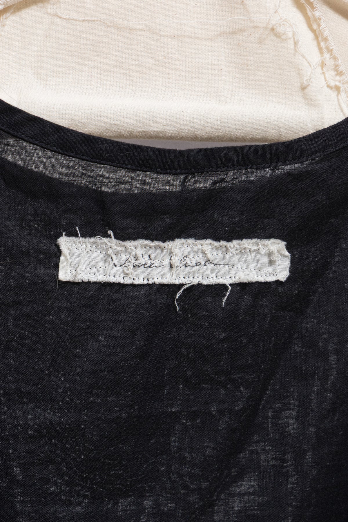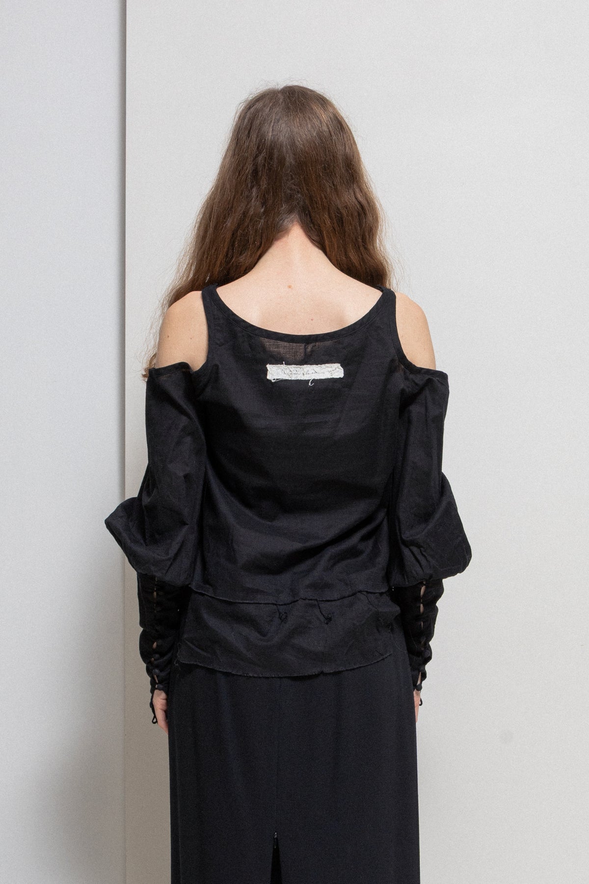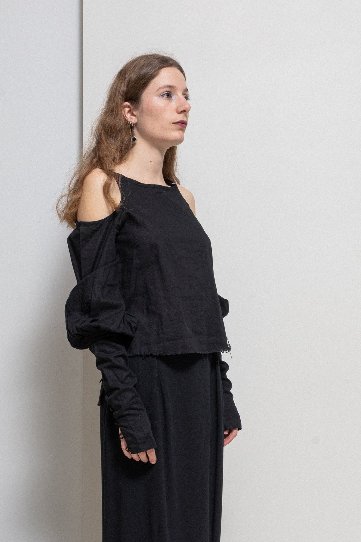 Incredible shirt made of a lightweight and soft cotton gauze fabric, featuring open shoulders and extra long sleeves with pleats and slits accessorised with nine buttons wrapped in fabric. Cropped front, a scoop neckline and frayed bottom edges.