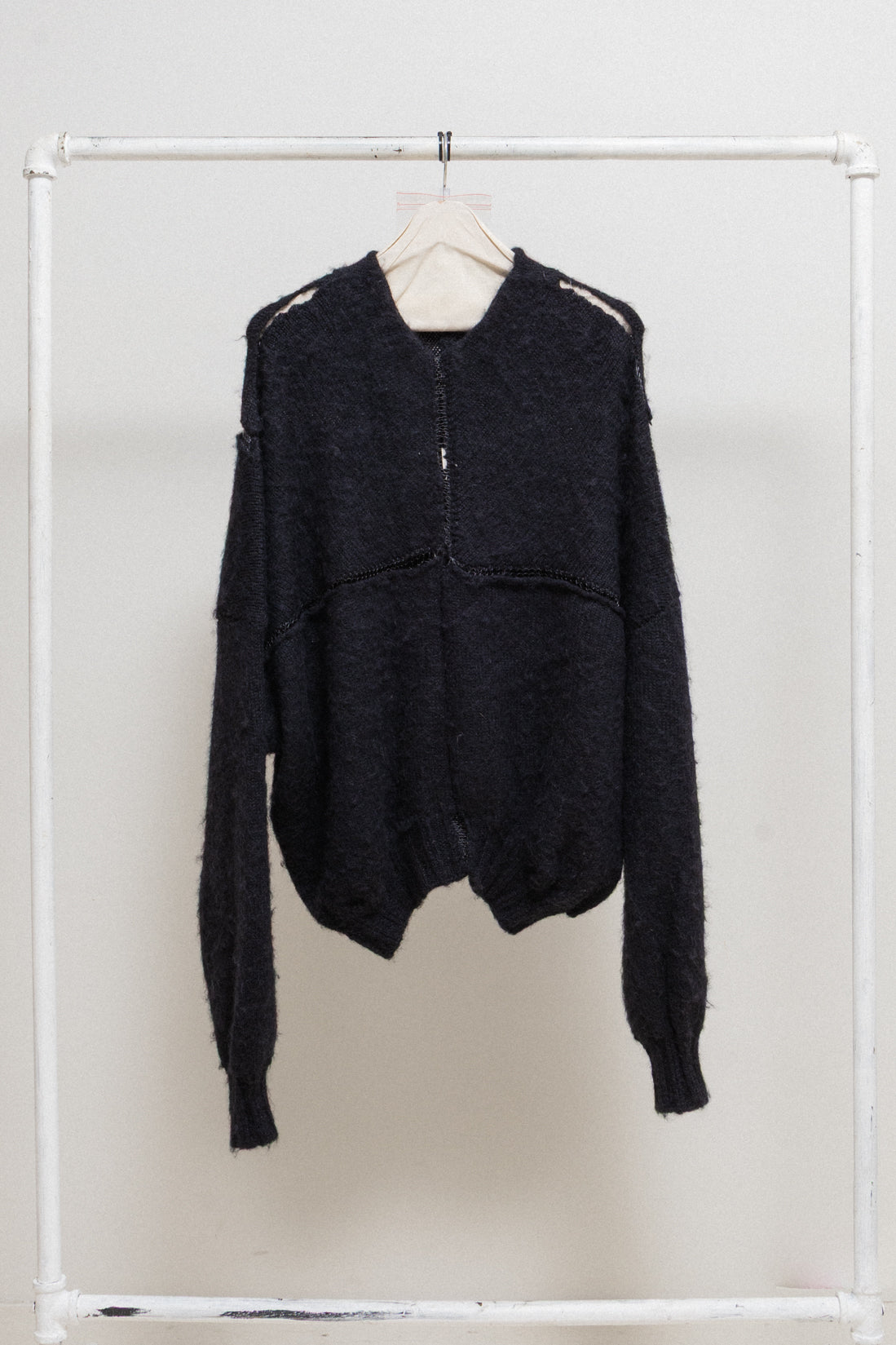 Beautiful sweater made of a very warm, thick and soft wool fabric, featuring clear nylon threads woven on the shoulders as well as on the front part in a cross shape, revealing a little bit of skin in a subtle way. Wide cut with large and elongated sleeves ending by tight ribbed cuffs.