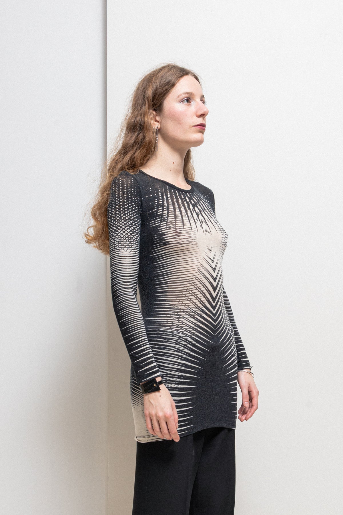 Beautiful black and white longsleeves made of a soft, stretchy and see through blended cashmere fabric, featuring an optical illusion graphic pattern. Close to the skin cut with a scoop neckline.