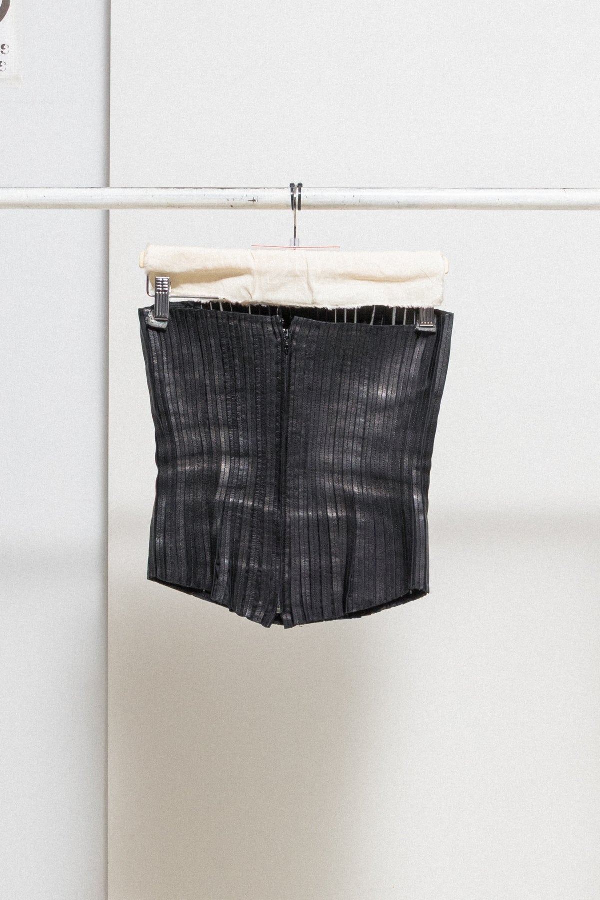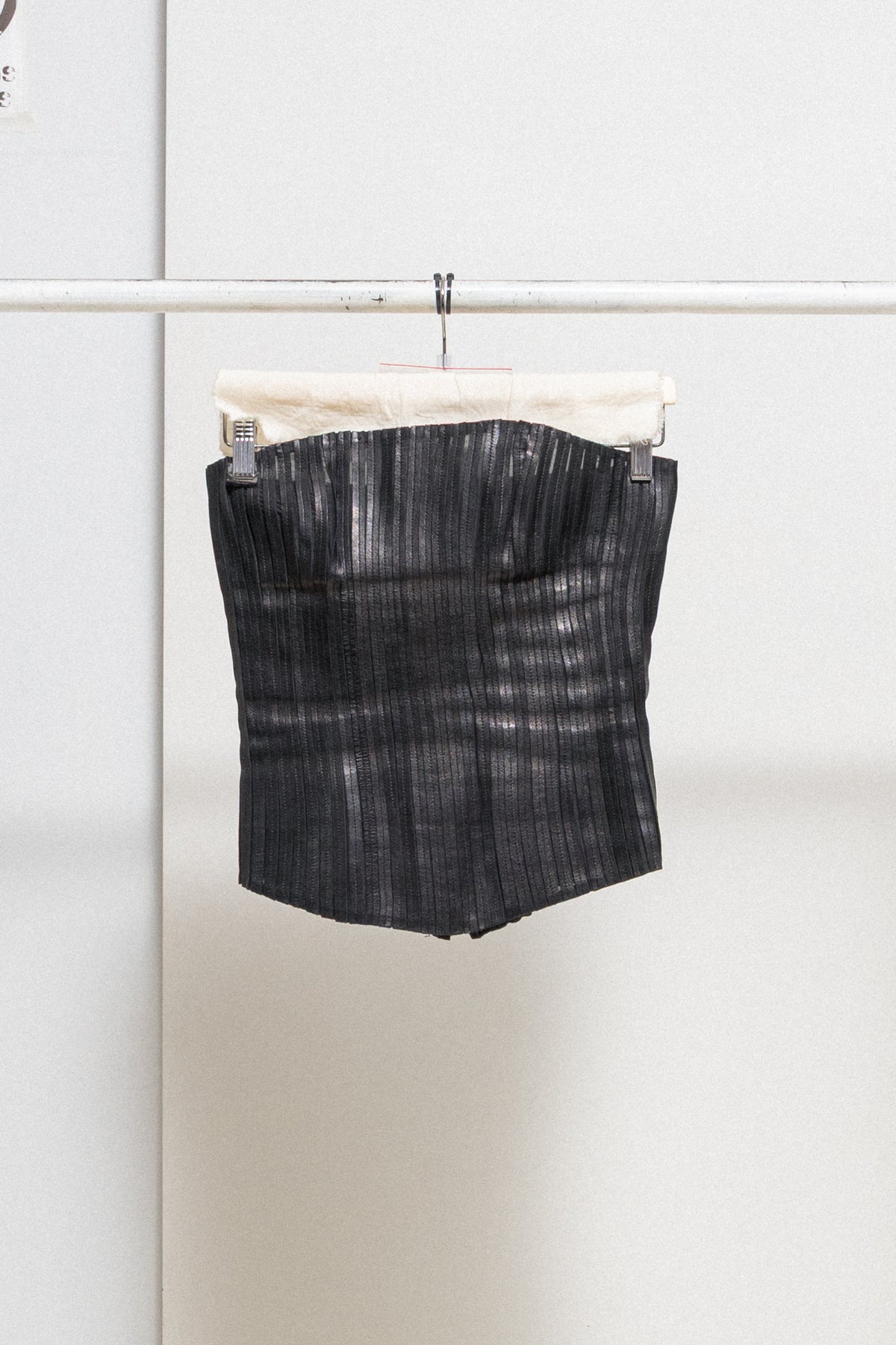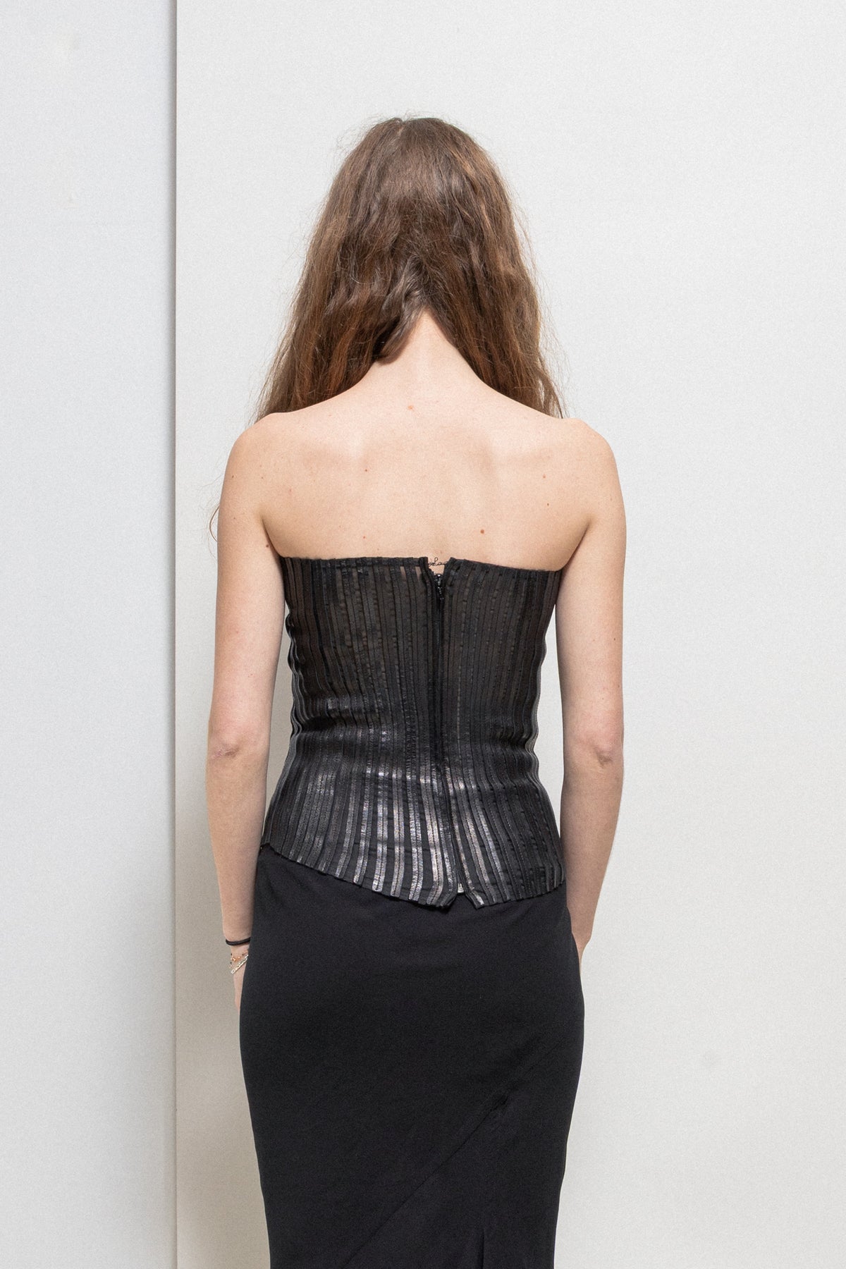 Beautiful black corset top made of a silk mesh fabric, featuring layers of dipped lamb leather straps sewn on top of the main fabric and covering all the surface of the item. Back closure with a zipper.