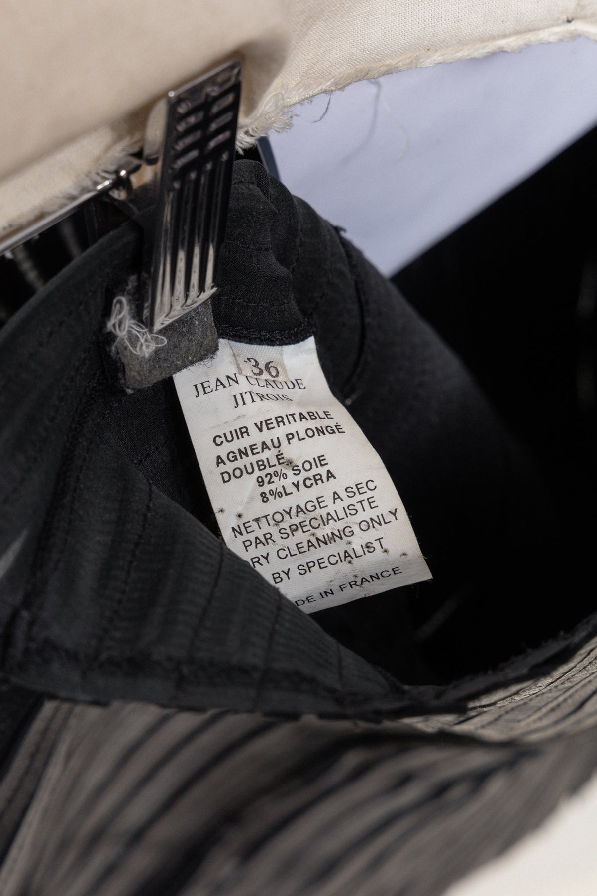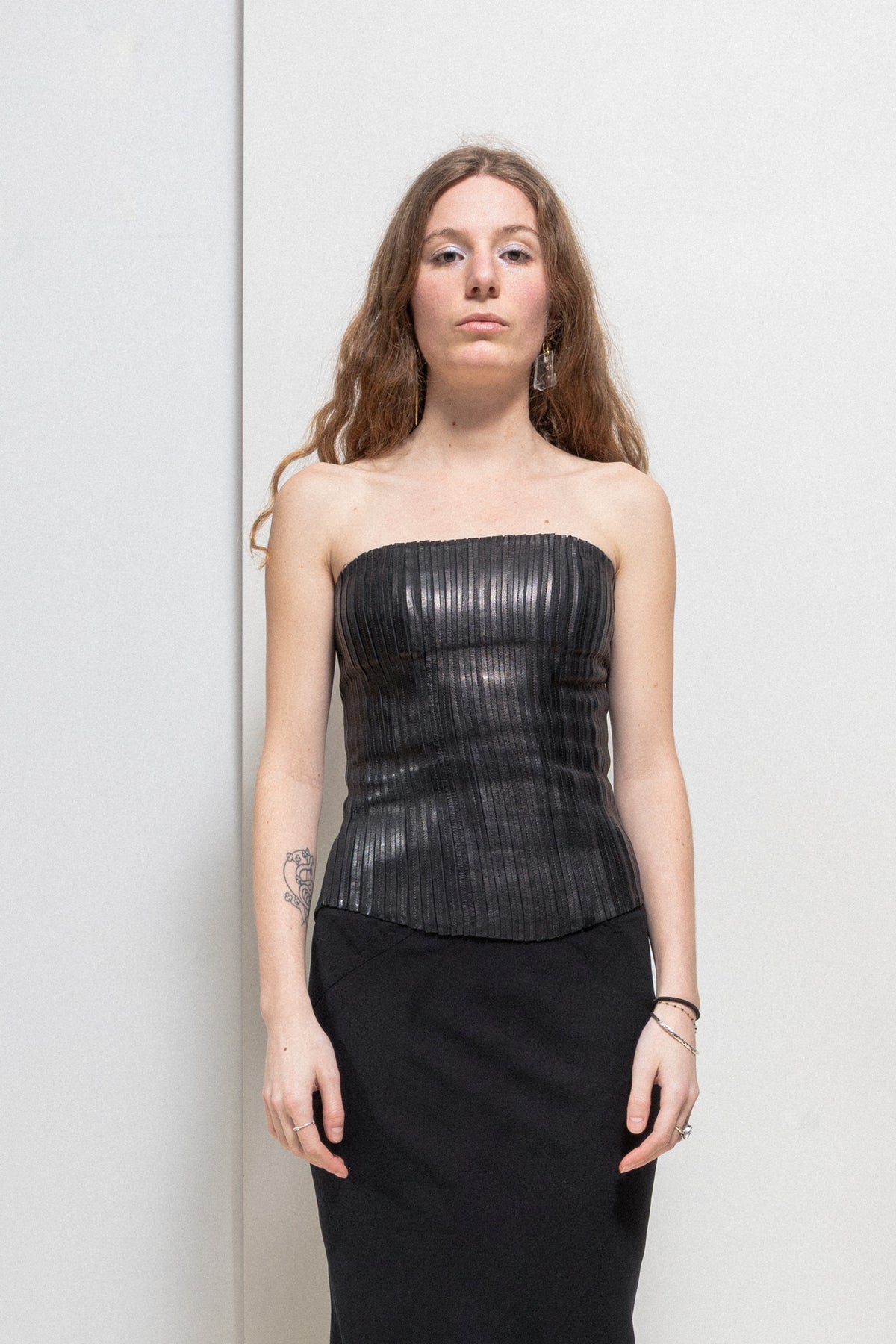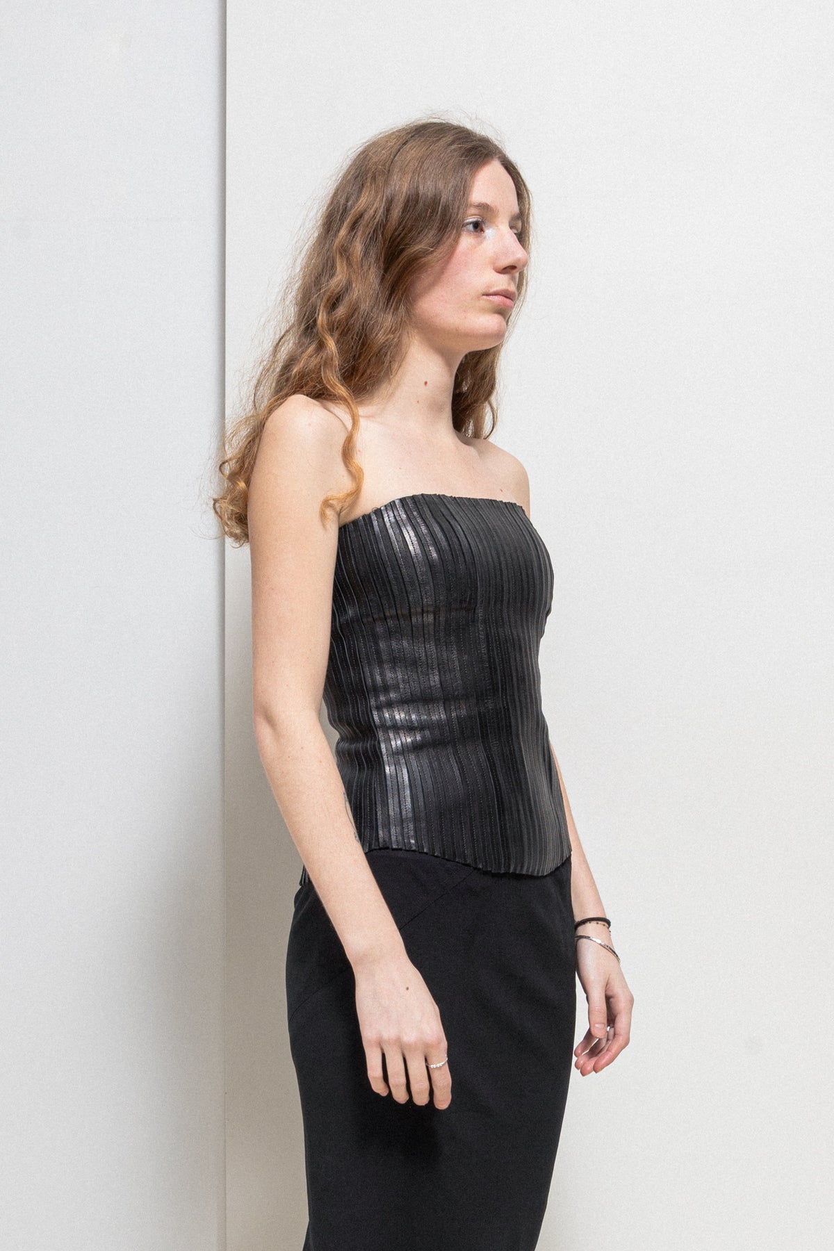 Beautiful black corset top made of a silk mesh fabric, featuring layers of dipped lamb leather straps sewn on top of the main fabric and covering all the surface of the item. Back closure with a zipper.