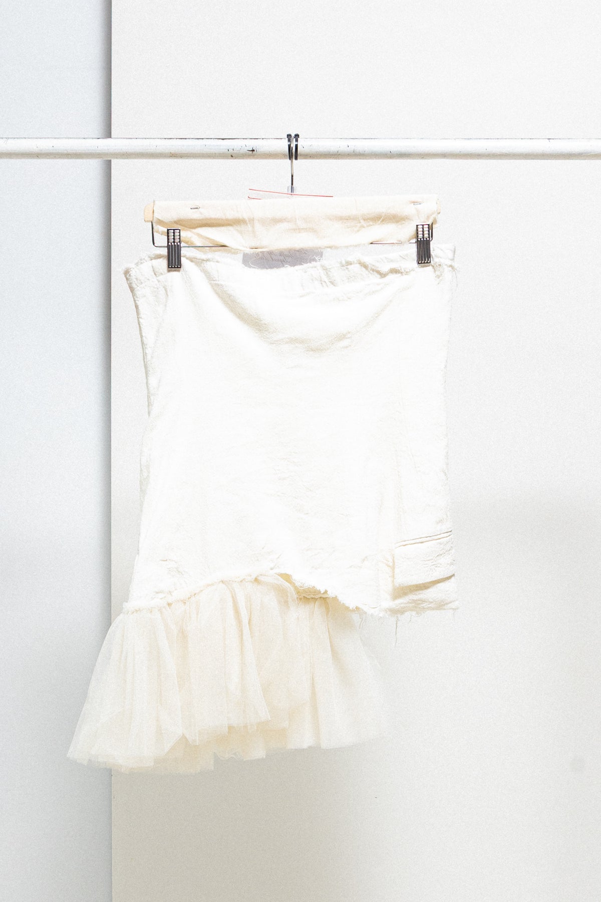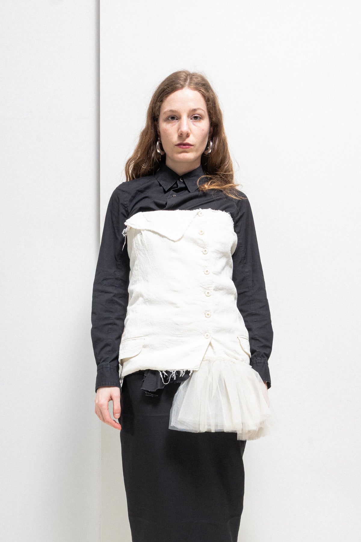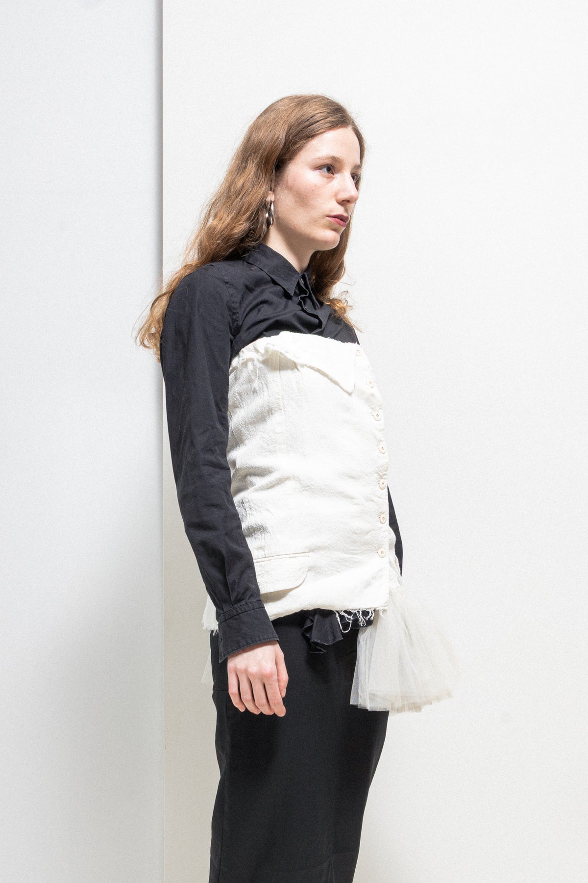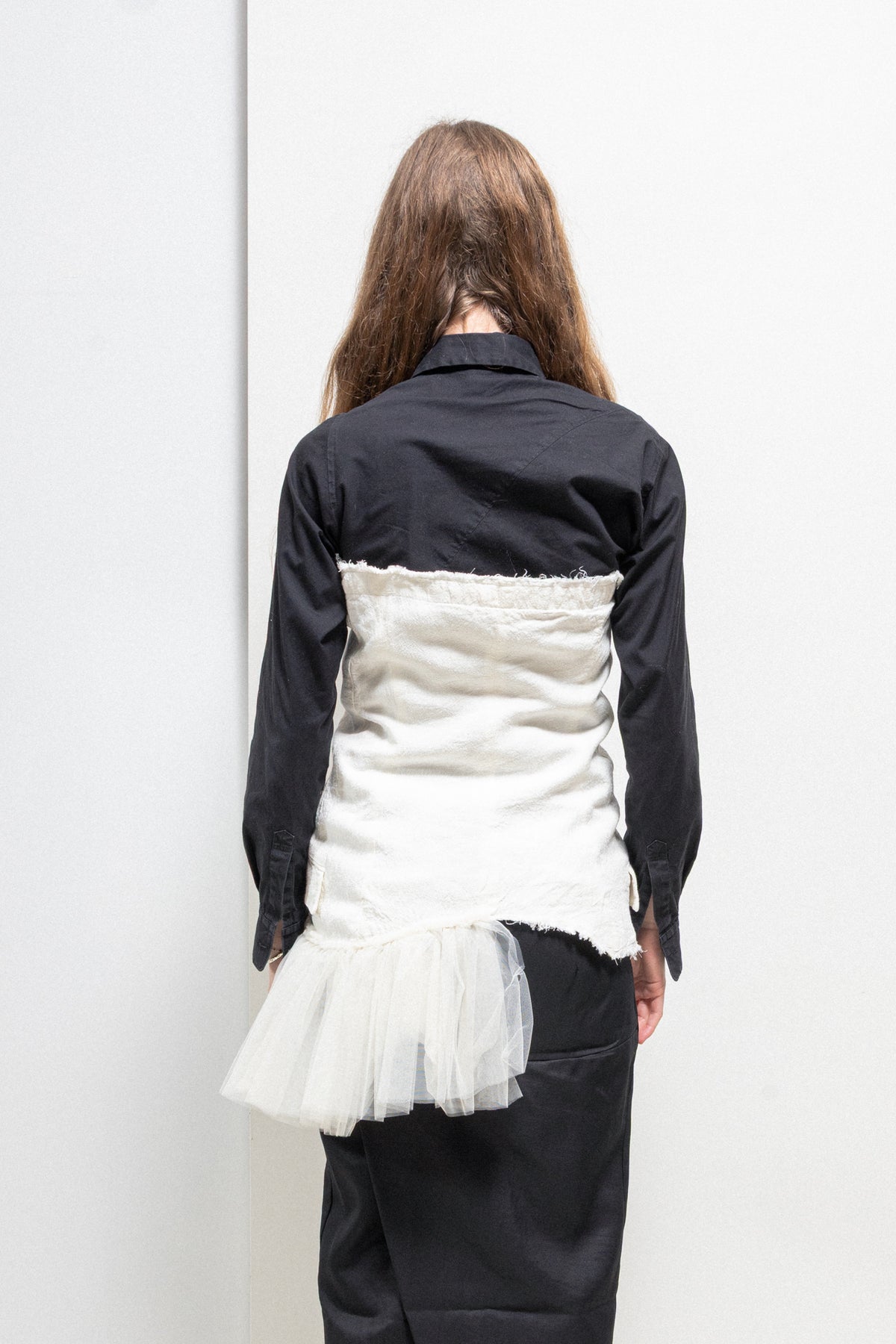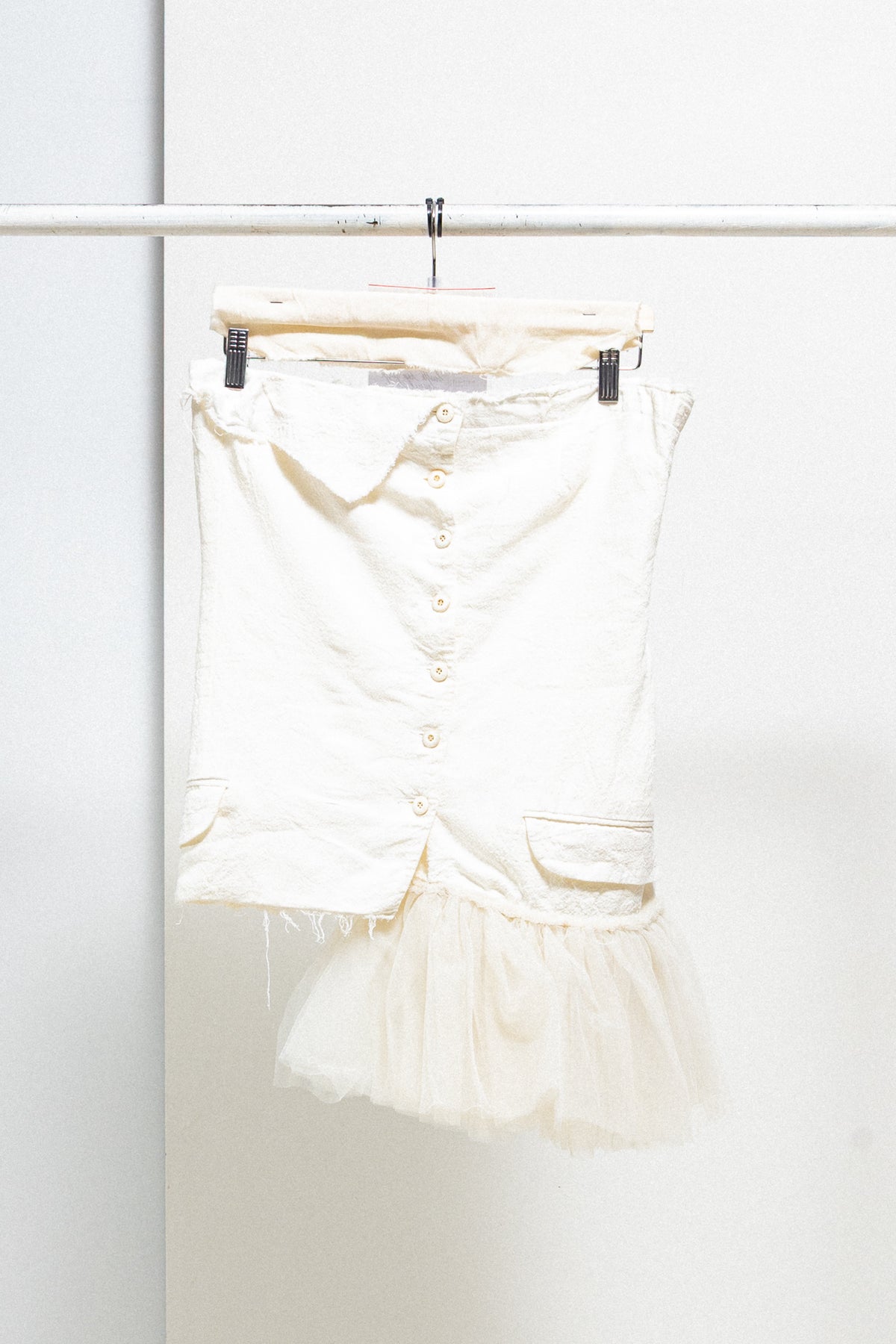 Wonderful bustle top made of a soft textured cotton fabric, featuring a front button up closure as well as lovely details such as a folded fabric panel on one side, and voluminous pleated tulle sewn on the opposite bottom edge. Raw cut edges, small flap pockets on each side. Can be worn by itself or over another garment.