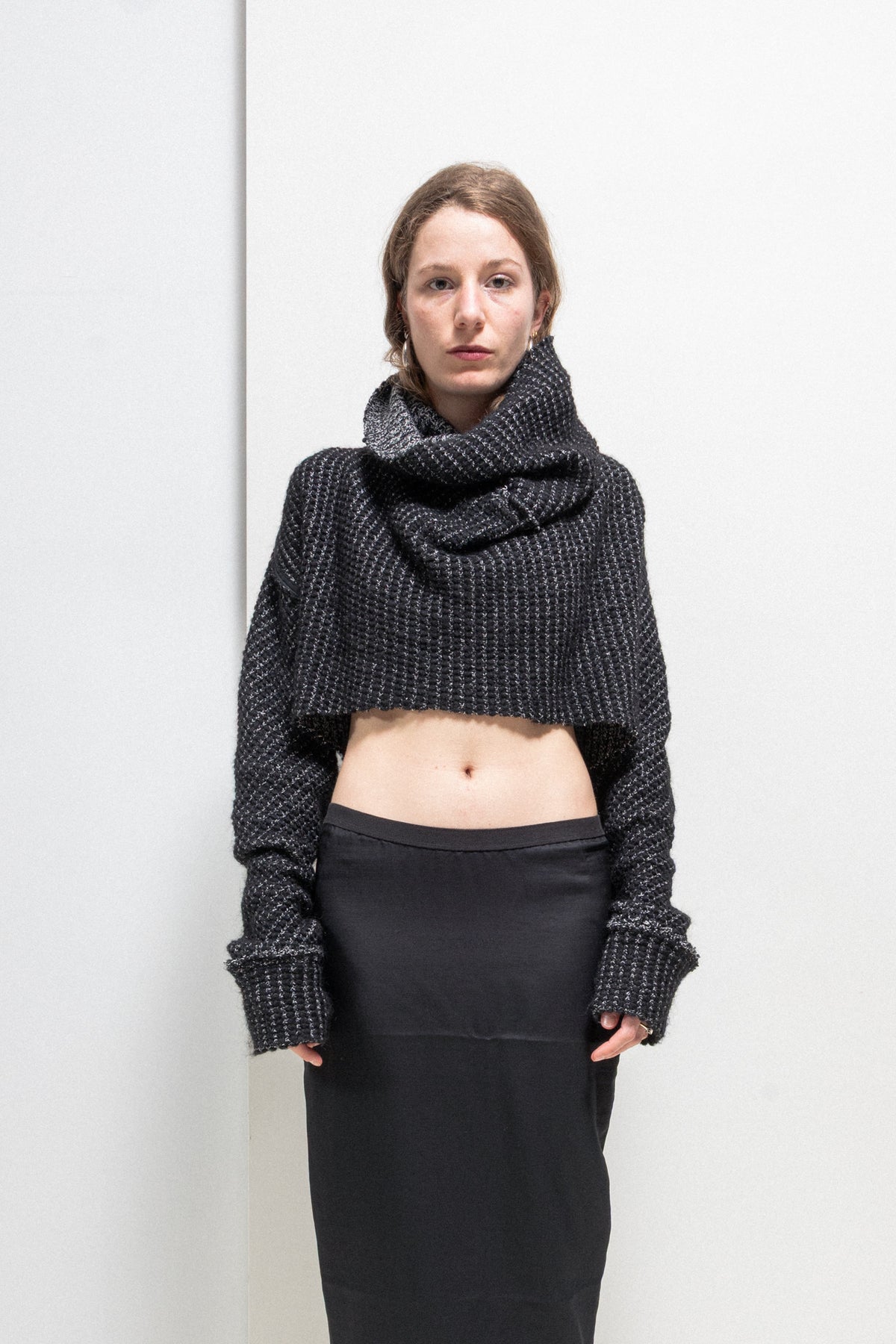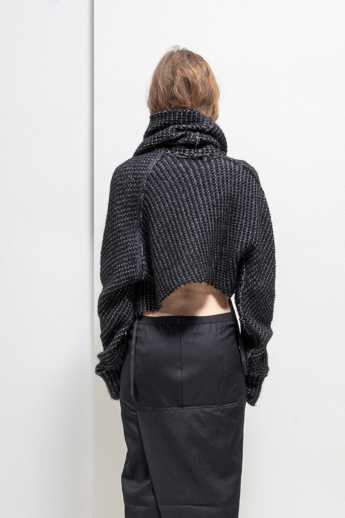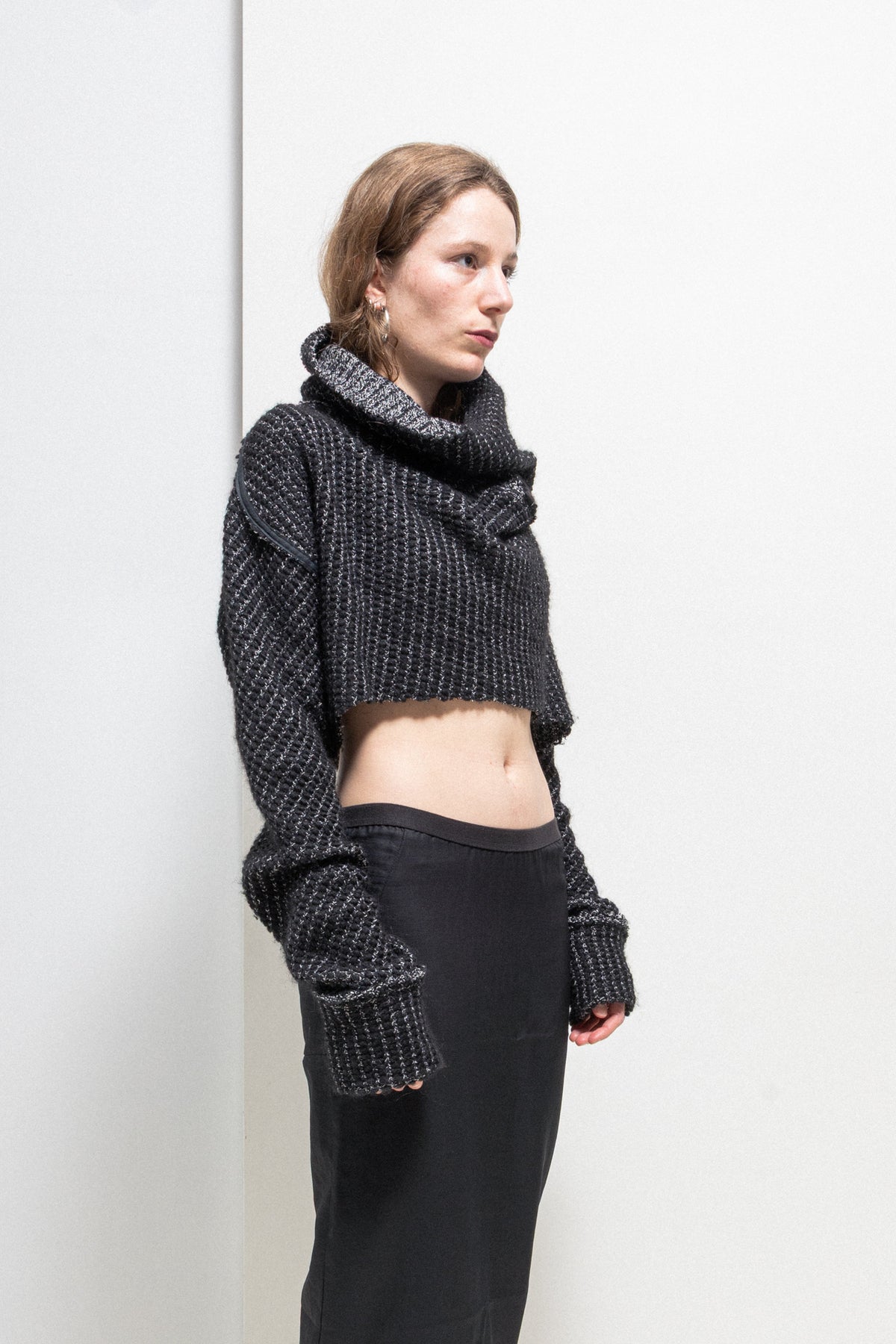 Beautiful sweater made of a thick and warm cotton wool blend, with light and darker shades of grey blended together creating a unique pattern. Cropped and wide cut with a high turtle-neck, elongated sleeves with thicker cuffs and thumb holes, straps falling on each side. Sleeves are sewn asymmetricaly creating a draped silhouette.