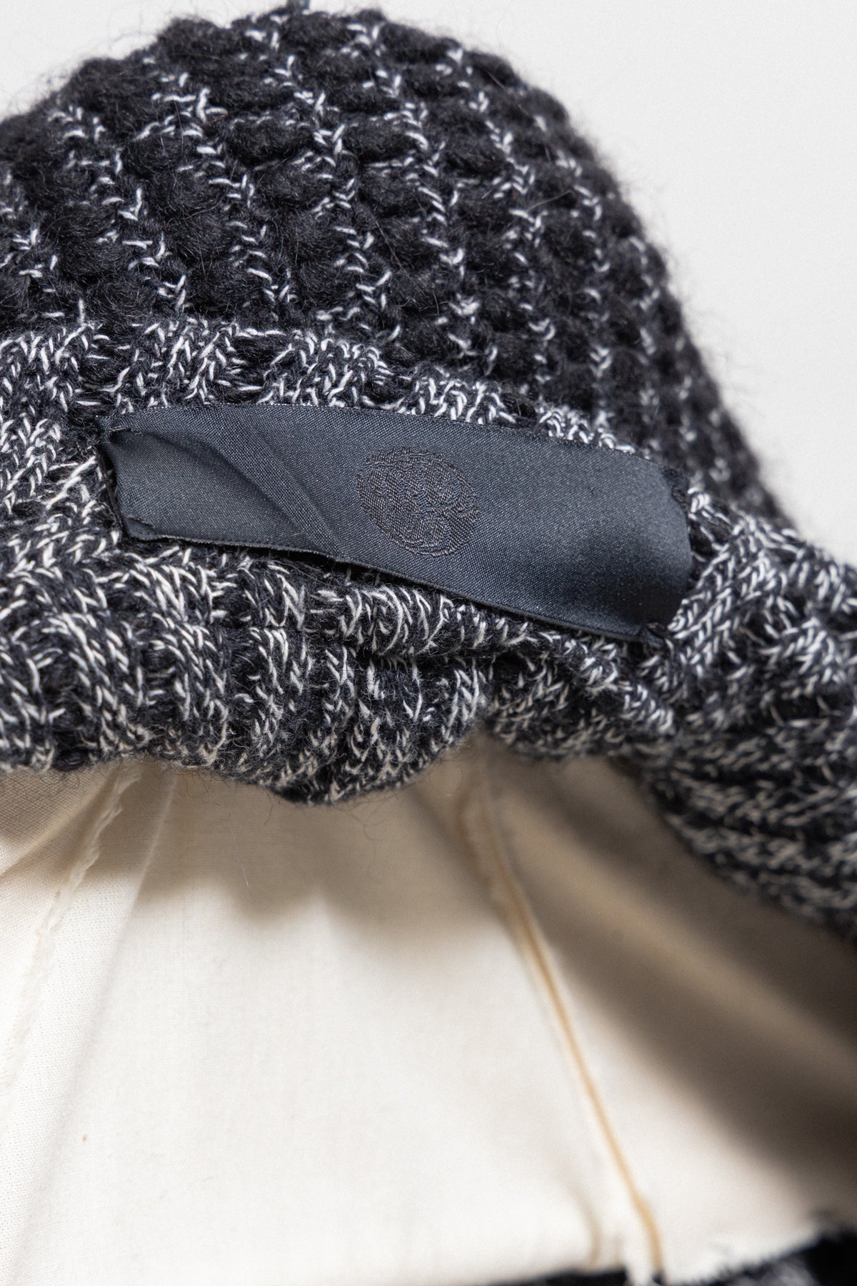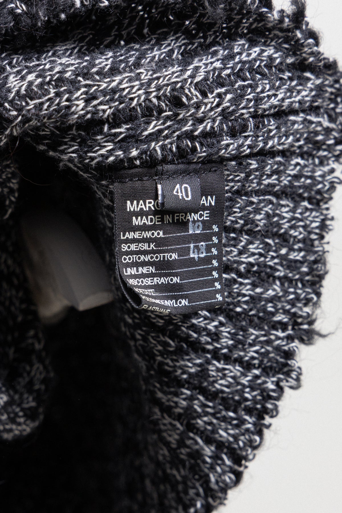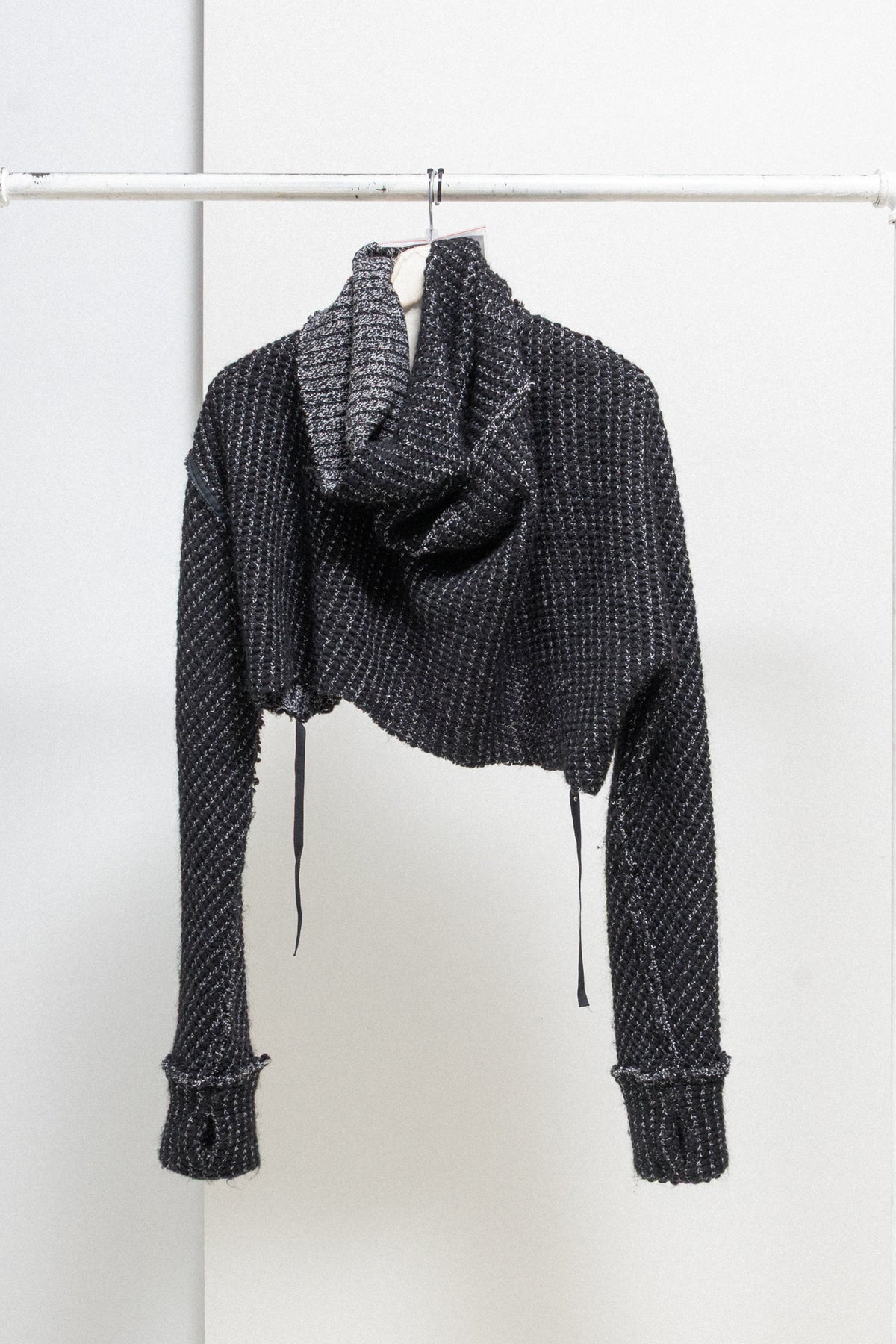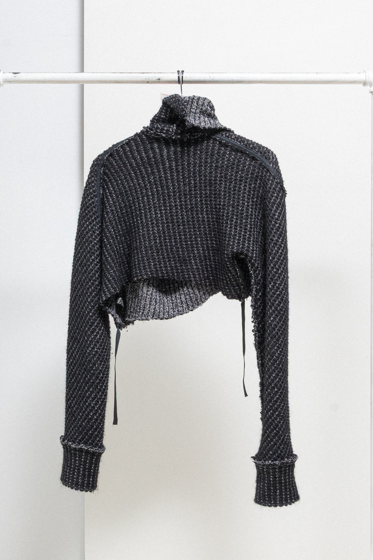 Beautiful sweater made of a thick and warm cotton wool blend, with light and darker shades of grey blended together creating a unique pattern. Cropped and wide cut with a high turtle-neck, elongated sleeves with thicker cuffs and thumb holes, straps falling on each side. Sleeves are sewn asymmetricaly creating a draped silhouette.