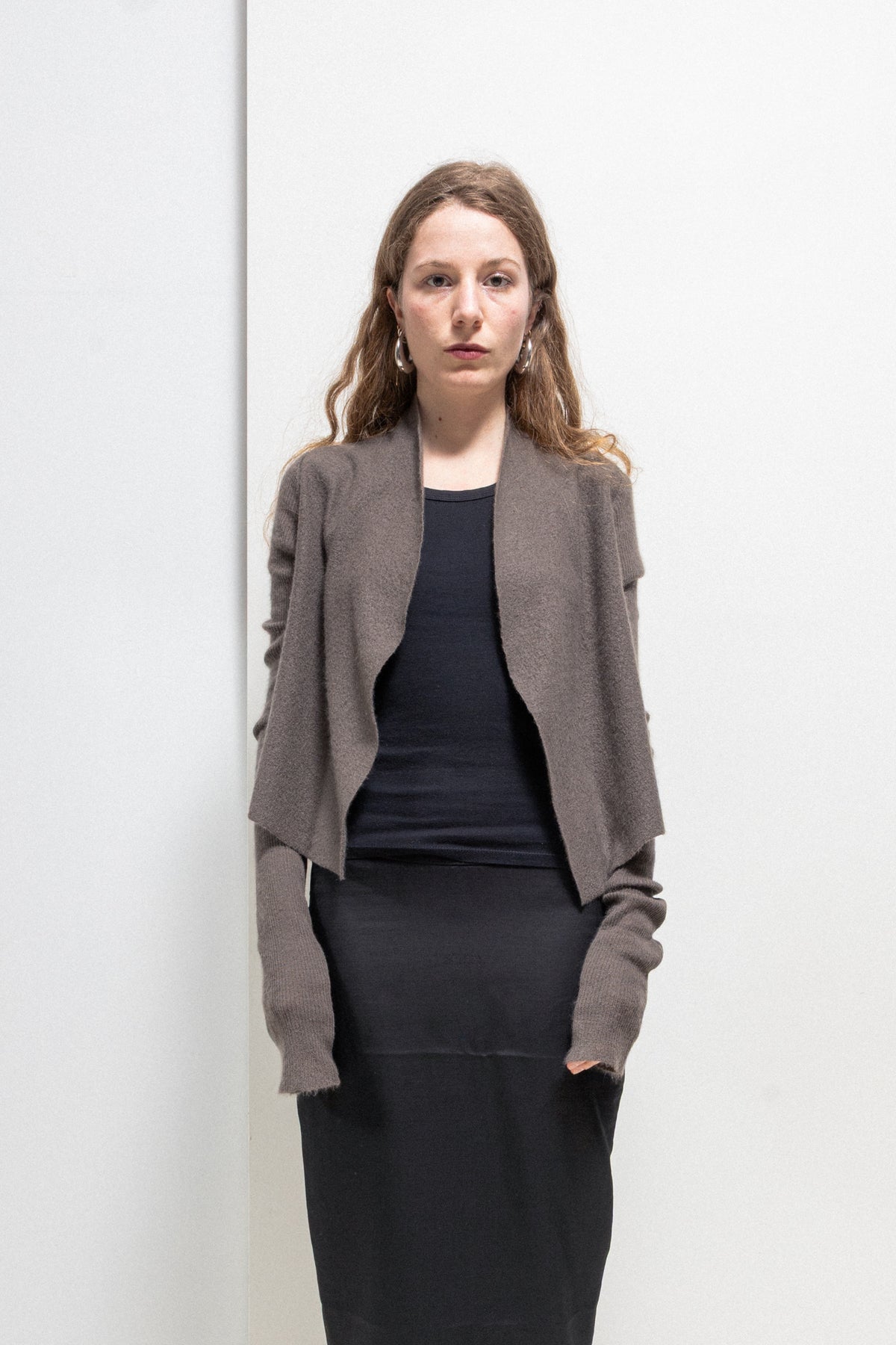 Beautiful cardigan made of a soft and fine cashmere, featuring a back tail with a middle slit creating two pointy panels, as well as cropped sides and elongated sleeves.