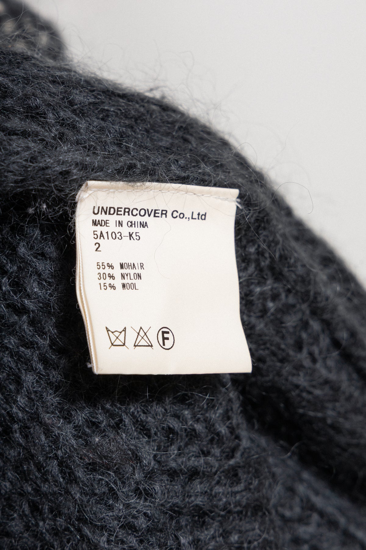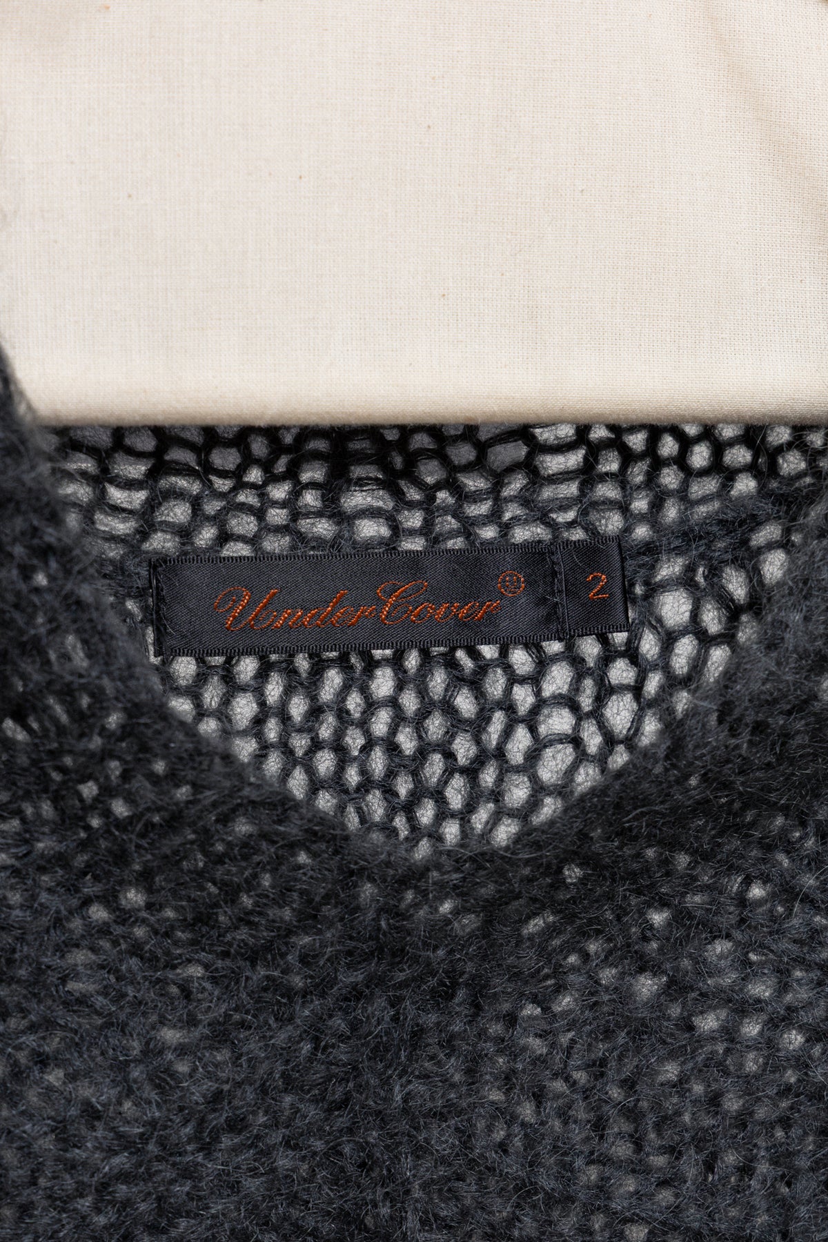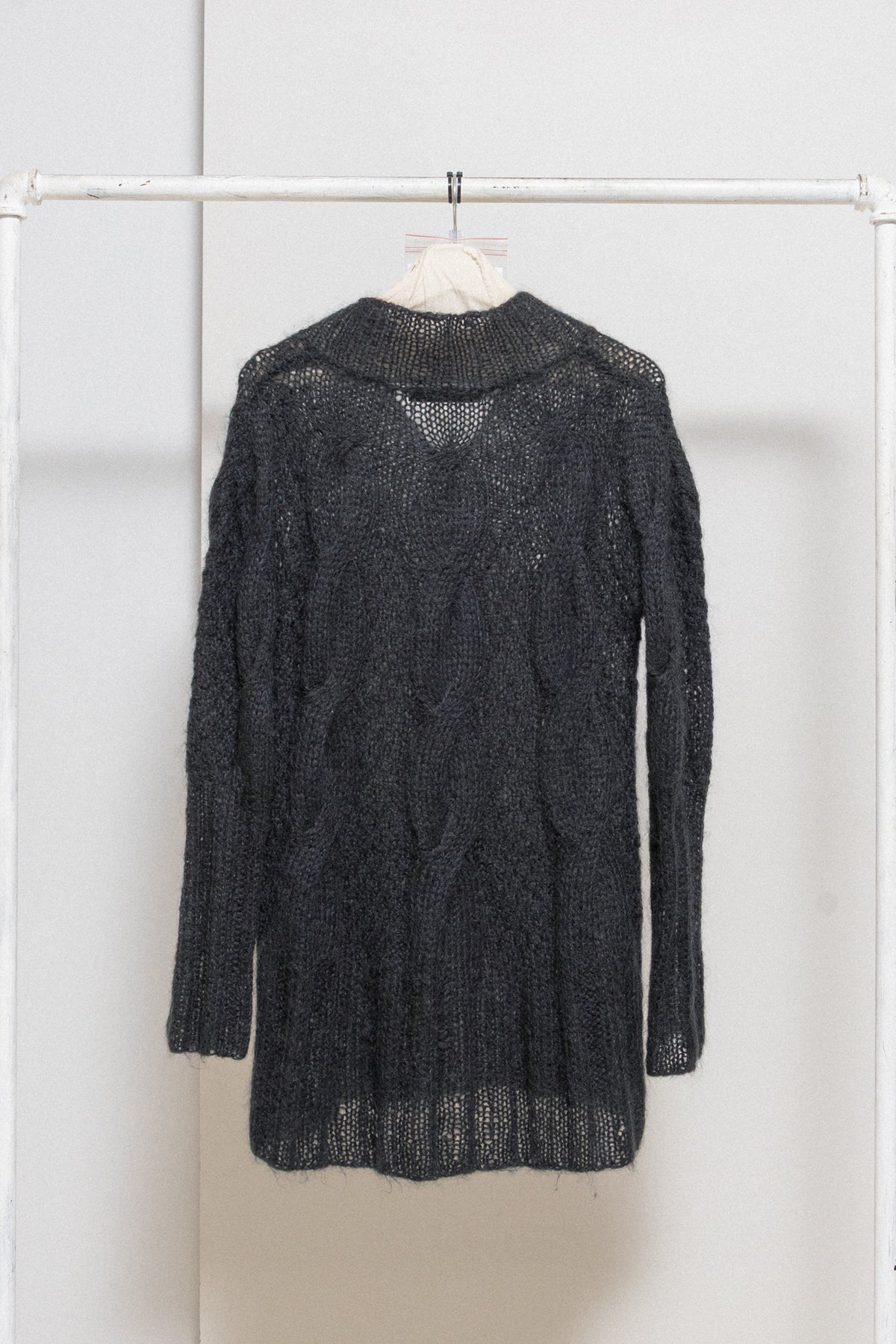 Beautiful sweater made of slightly see-through and very soft knitted mohair wool blend, featuring big braids integrated throughout. Relaxed cut with a ribbed V neck and flared cuffs.