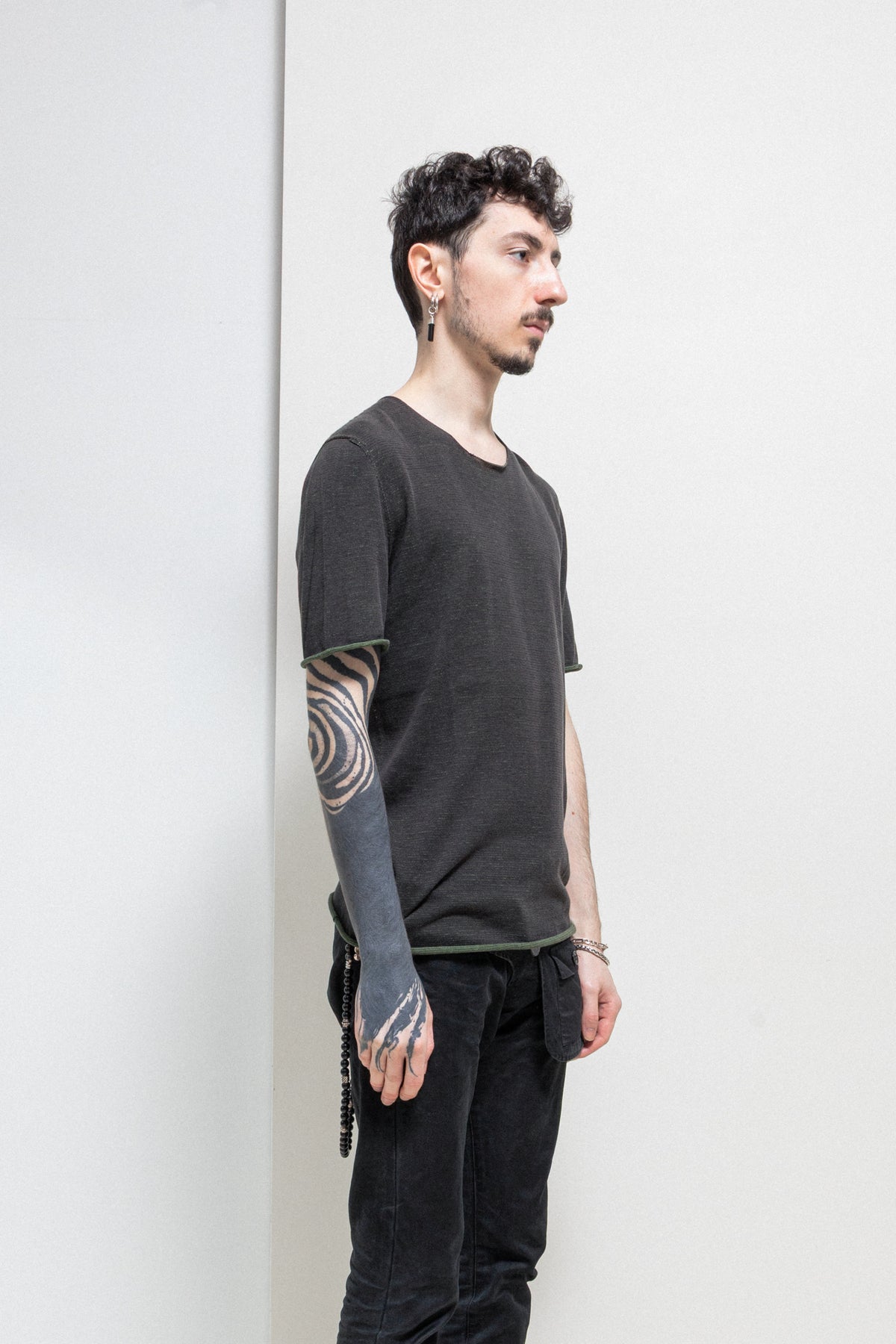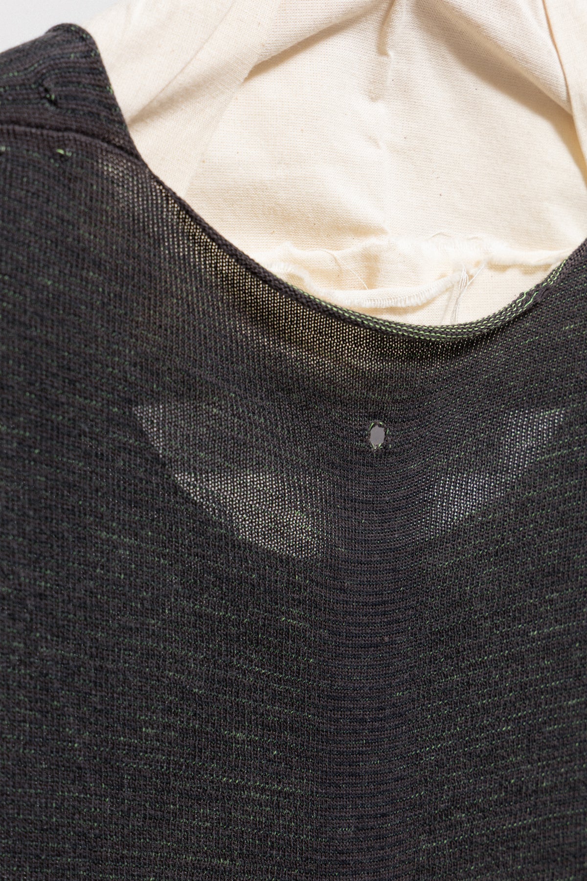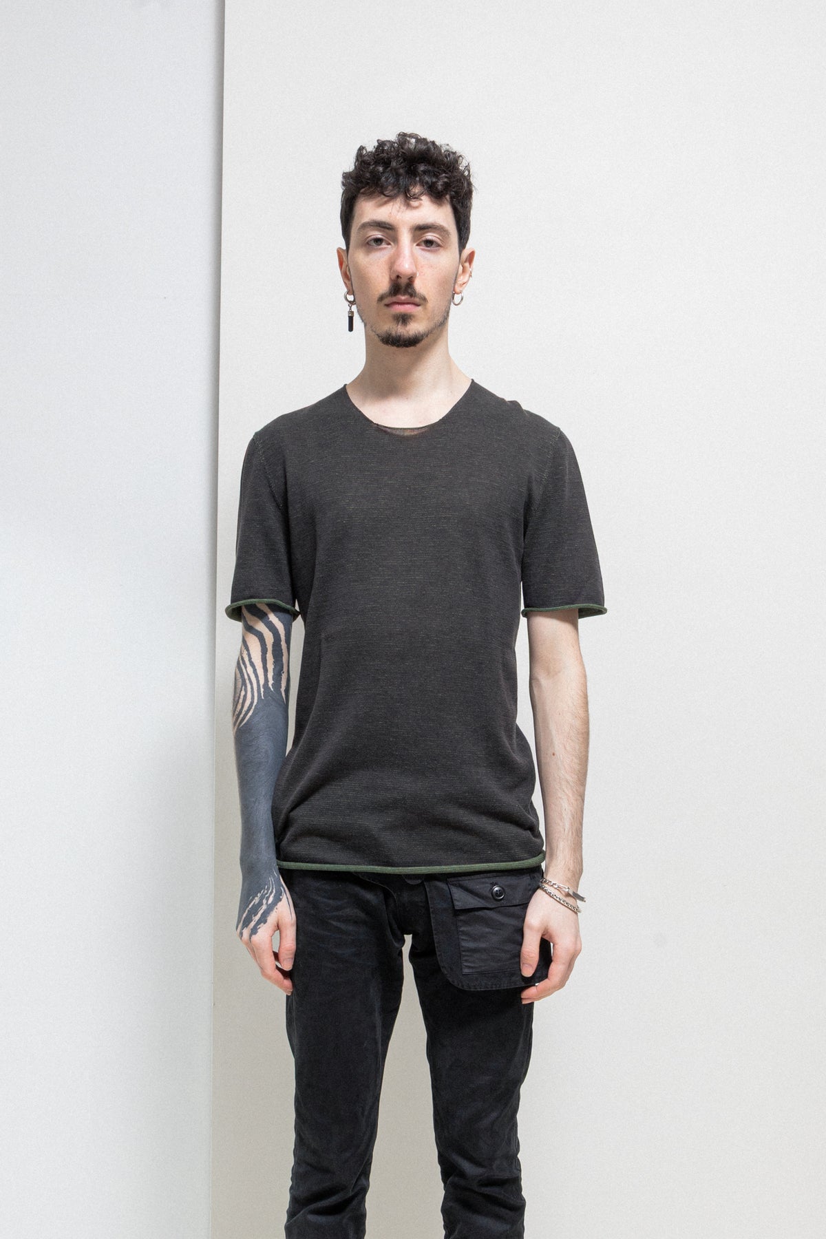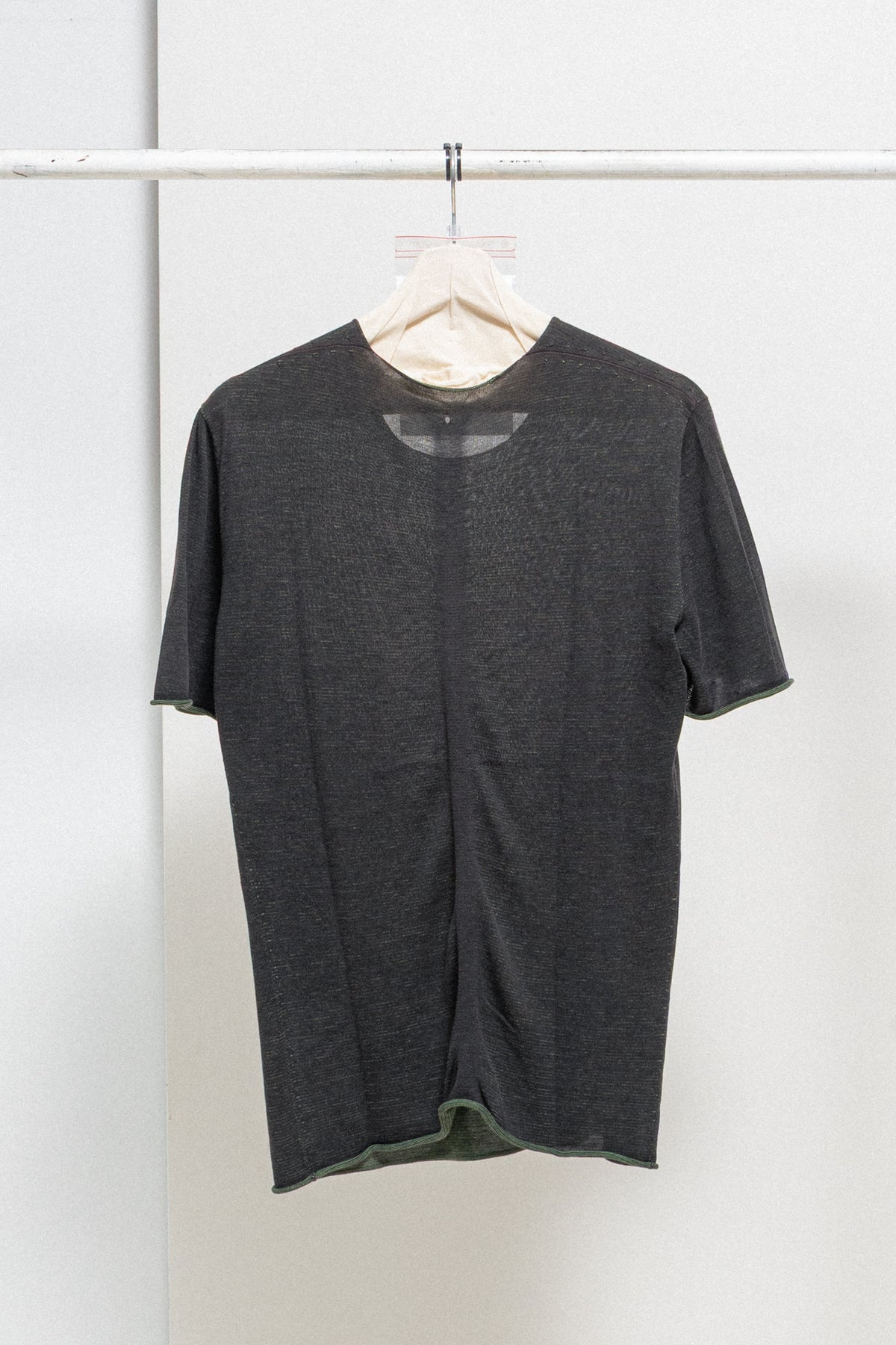 Nice dark grey and green reversible t-shirt made of a stretchy and soft woven cotton fabric, featuring a round neckline and raw edges.